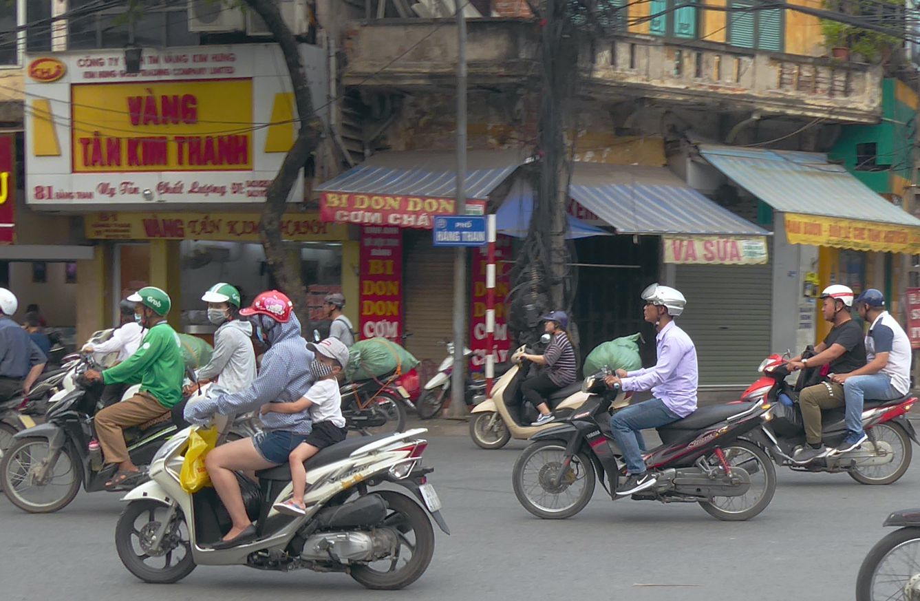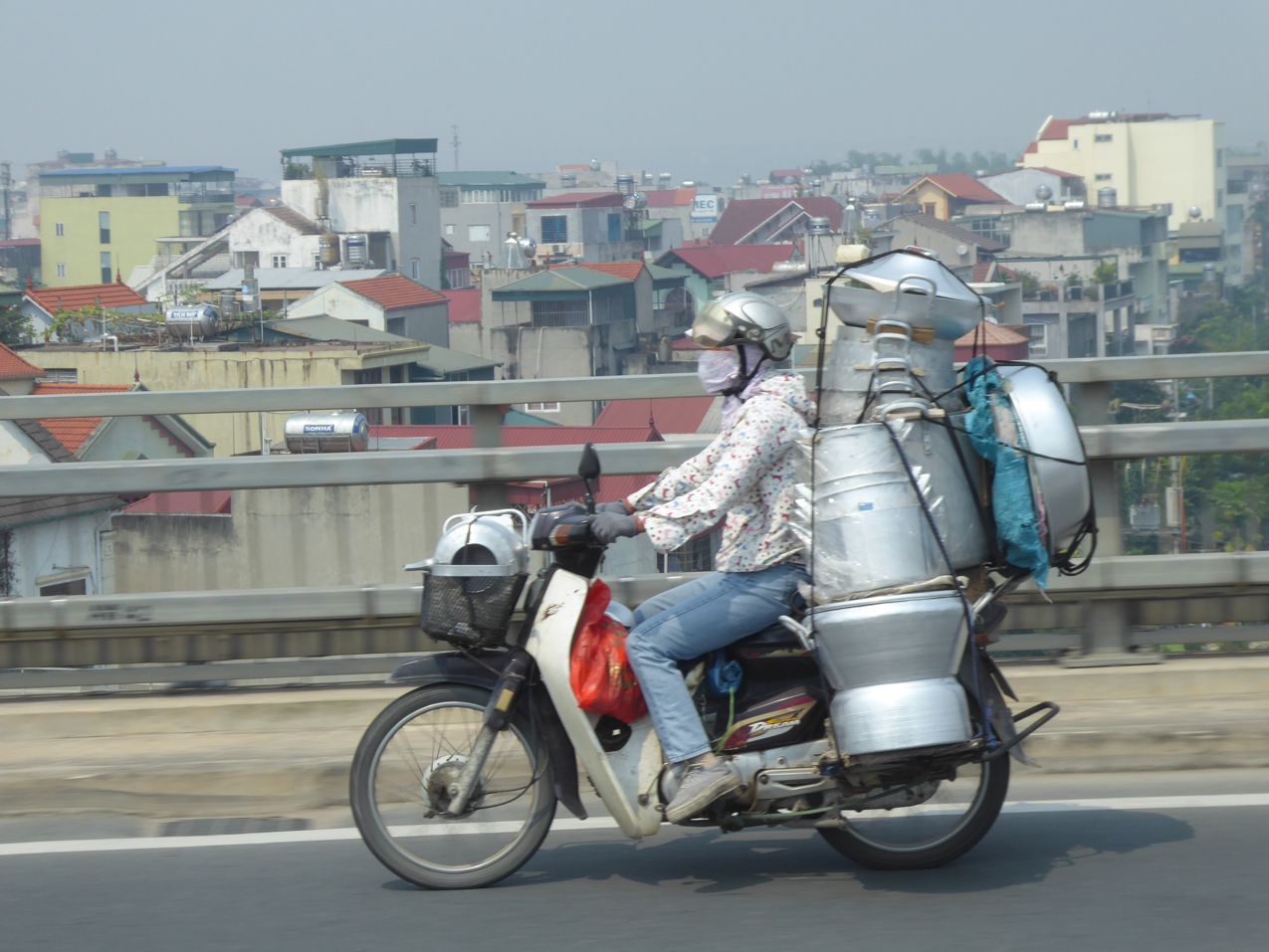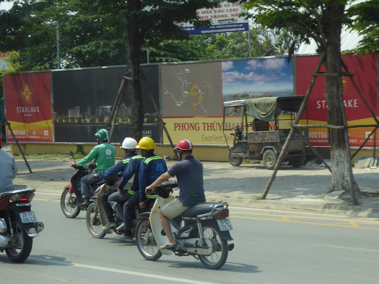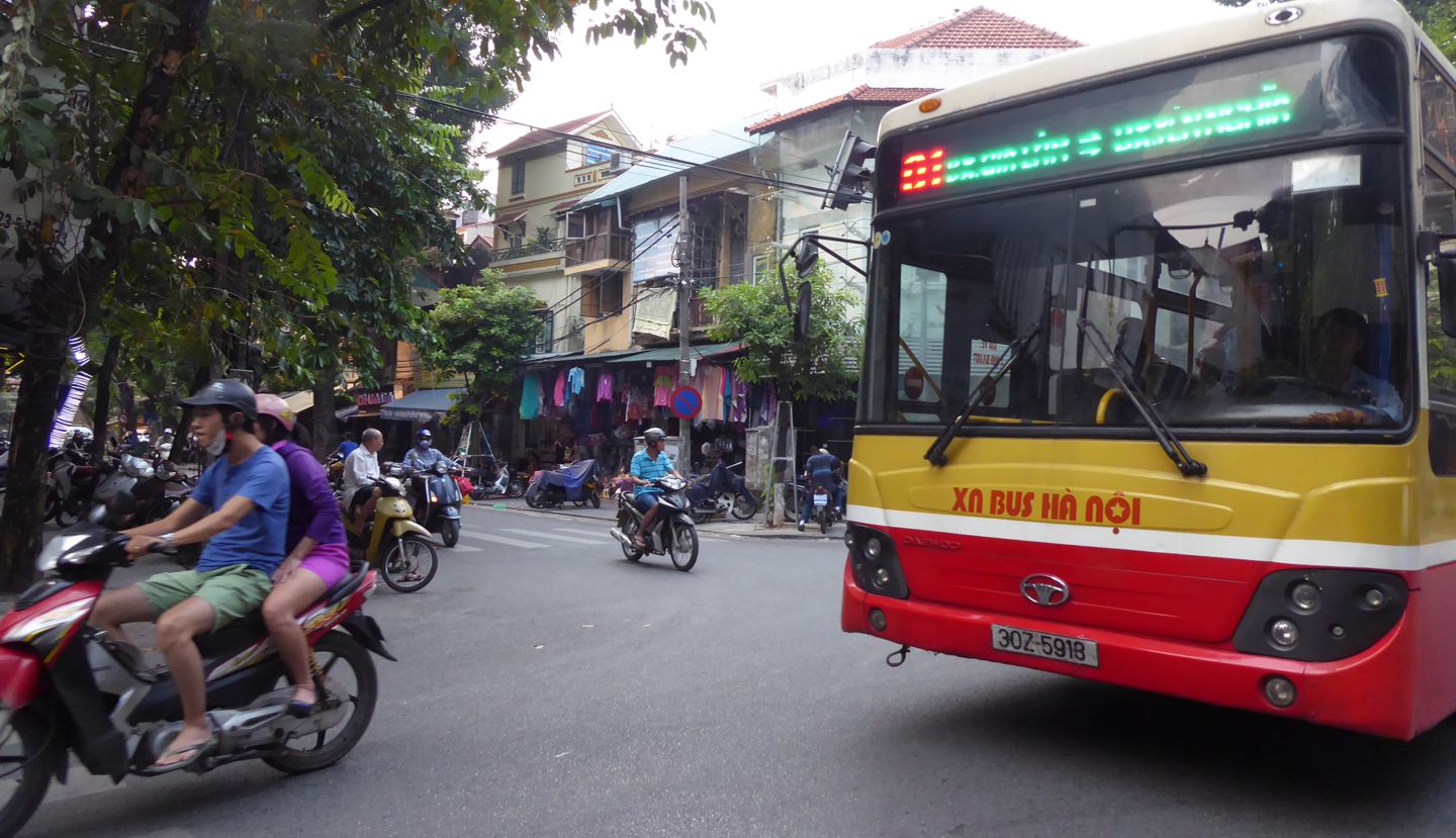 Aber erst ist einmal Hanoi angesagt. Vom Flughafen aus geht es zum Hotel, bereits eine erste Entdeckertour. Der Straßenverkehr wurde uns schon als ziemlich wild angekündigt; außerhalb der Stadt merken wir das noch wenig, aber dann … Ein wildes Gewusel mit tausenden Mopeds und Rollern, die kreuz und quer die Straßen nutzen, zwischen den Autos, Straßenverkäufern und Rikschas hindurch, irgendwie, mit lautem Hupen – aber anscheinend immer gekonnt. Oft fährt der Bus in einem richtigen Pulk, bei dem man staunt, dass alles so sicher abläuft, obwohl – für europäische Sichtweise – völlig ungeordnet und ohne jeglichen Abstand Rad an Rad gefahren wird. Aber die Maßgaben sind anscheinend nicht starre Regeln, sondern Vorsicht und Rücksicht – und alles läuft bestens.