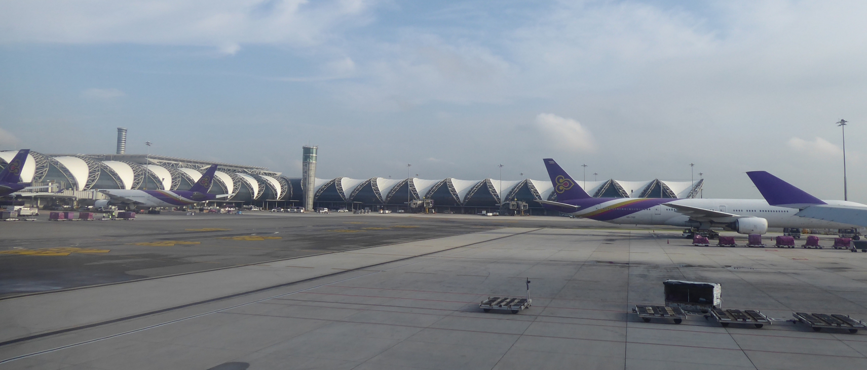 Für uns geht es los, auf eine schon lange geplante Reise nach Ostasien, genauer gesagt nach Vietnam und Kambodscha. Etwa 9.000 Kilometer fliegen wir von Frankfurt nach Bangkok, mit einem Airbus A380 von Thai Airways. In Bangkok erwartet uns ein neuer, riesiger und ziemlich weitläufiger Flughafen – anscheinend werden an verschiedensten Plätzen auf der Welt Großflughäfen tatsächlich auch fertiggestellt, sogar zügig, und sind schnell betriebsbereit.