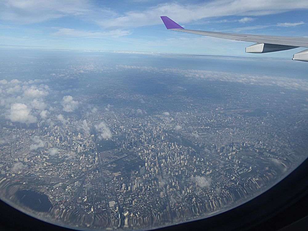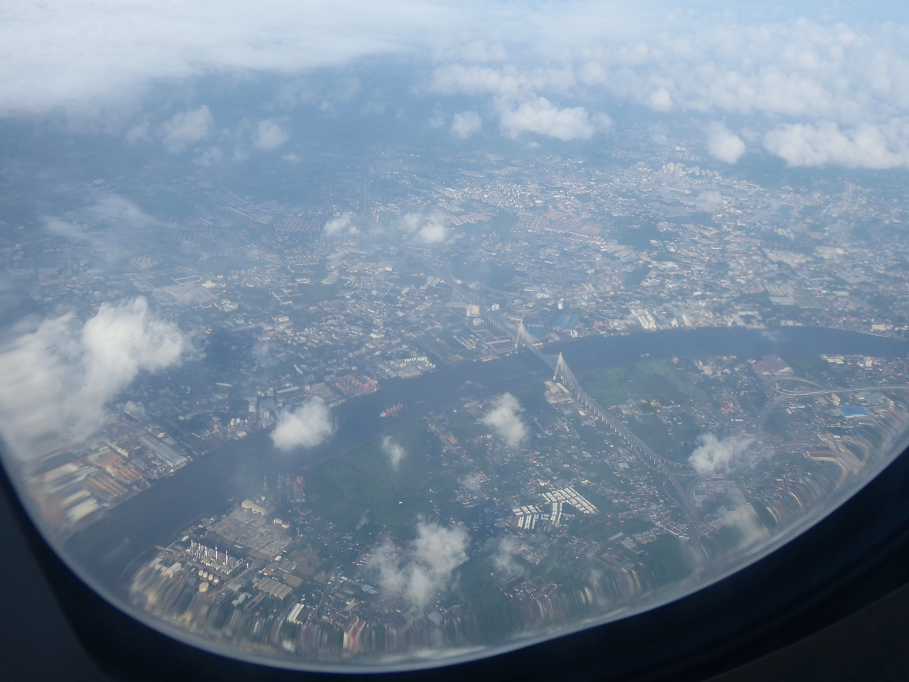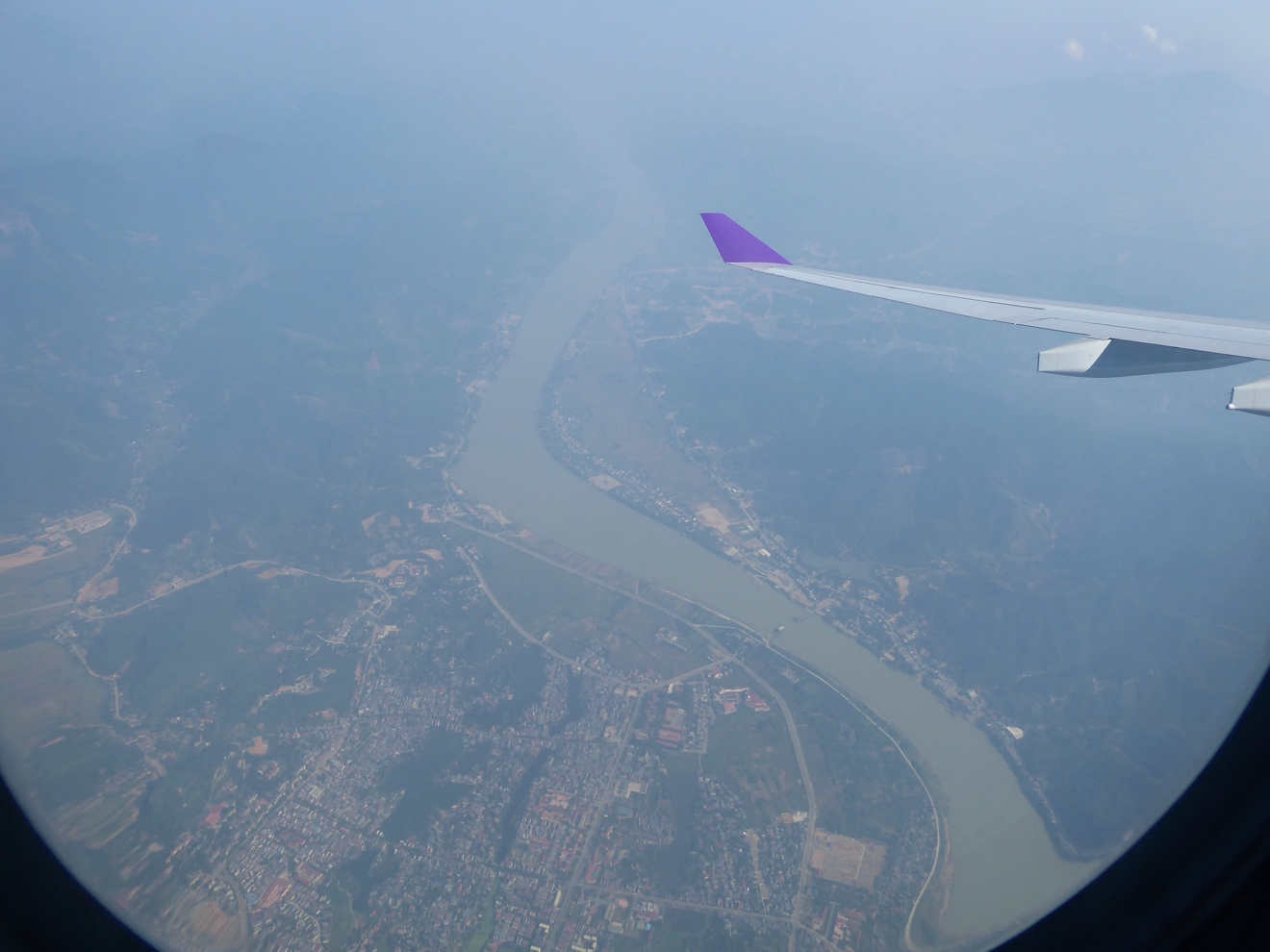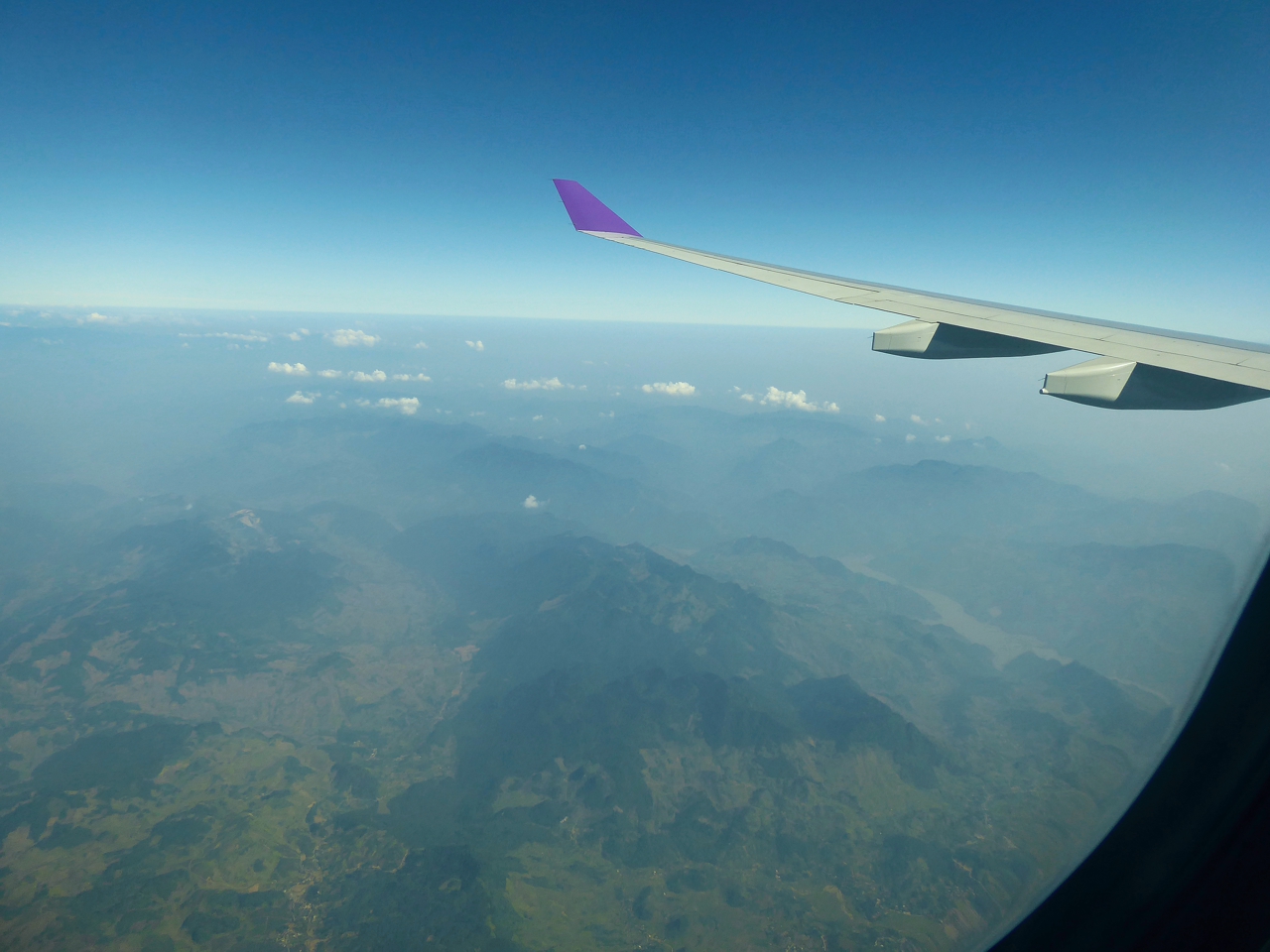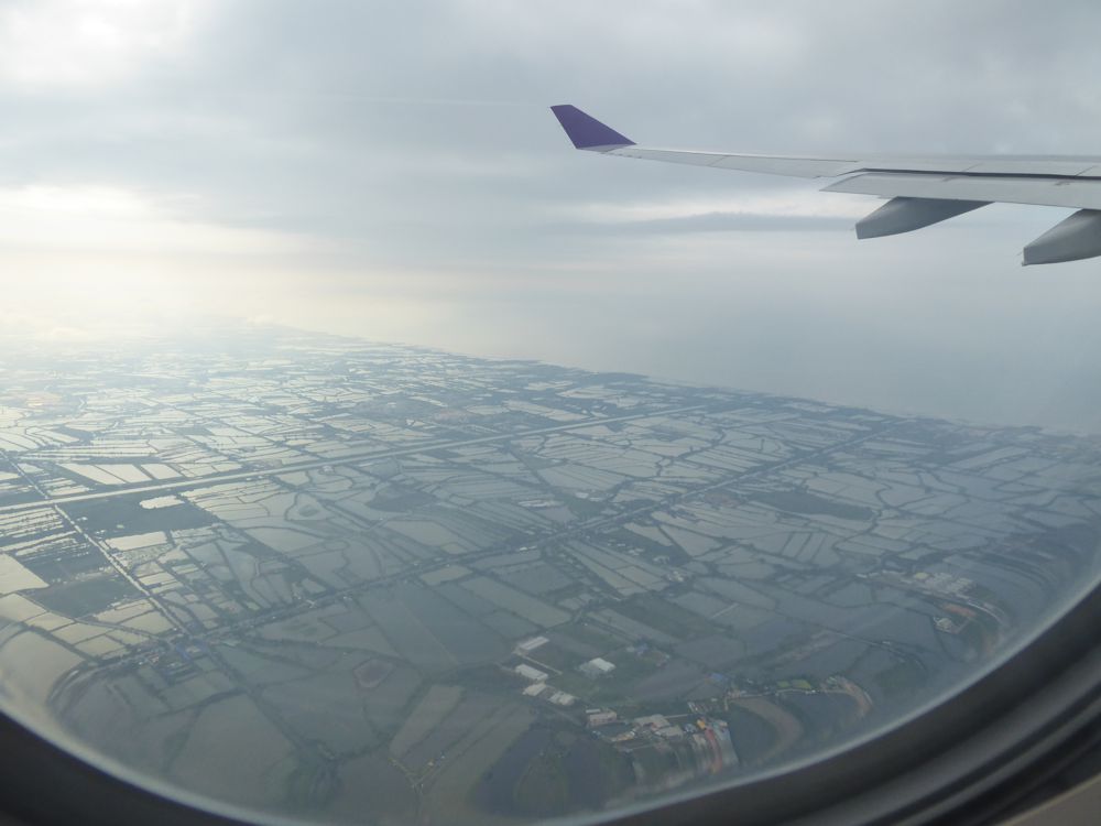 Zum umsteigen haben wir etwa 90 Minuten Zeit, aber die benötigen wir auch. Lange Wartezeiten an der Sicherheitskontrolle, und endlos lange Laufwege. Wir fliegen weiter nach Hanoi, noch mal gut 1.000 Kilometer. Beim Start in Bangkok sehen wir unter uns zunächst die überfluteten Reisfelder, anschließend wird die Stadt überflogen. Wir haben einigermaßen gute Sicht, und so blicken wir auf unserem Flug unter uns auf Städte, Dörfer, Felder, Flüsse und später auch auf das Hochland.