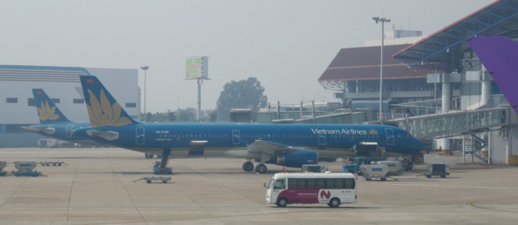 Nach der Landung sind auf dem Flugfeld vor allem Maschinen von Vietnam Airlines und einigen wenigen anderen Asiatischen Fluggesellschaften zu sehen. Im Flughafen – auch neu, gerade mal ein paar Jahre alt – folgt eine schnelle Erledigung aller Formalitäten rund um die Einreise. Leider hat einer unserer Koffer auf der Strecke zwischen Frankfurt und Hanoi einen Satz Rollen verloren. Im Flughafen direkt am Kofferband ein Schalter von Vietnam Airlines; die freundliche Dame hilft gleich weiter, informiert Thai Airways, und als wir im Hotel sind, liegt schon eine Info für uns vor – alles bestens erledigt. An den Hinweistafeln auf die Städte merken wir, dass wir angekommen sind – die Schreibweise ändert sich. Hanoi wird zu Hà Nội, Saigon zu Sài Gòn, Halong zu Hạ Long.