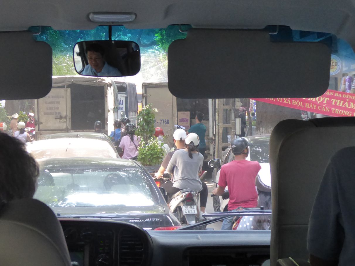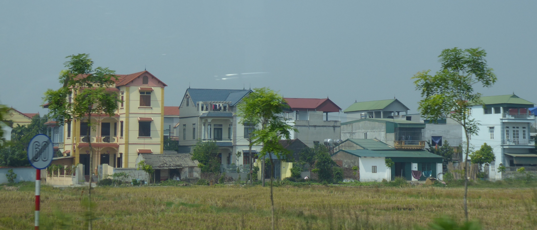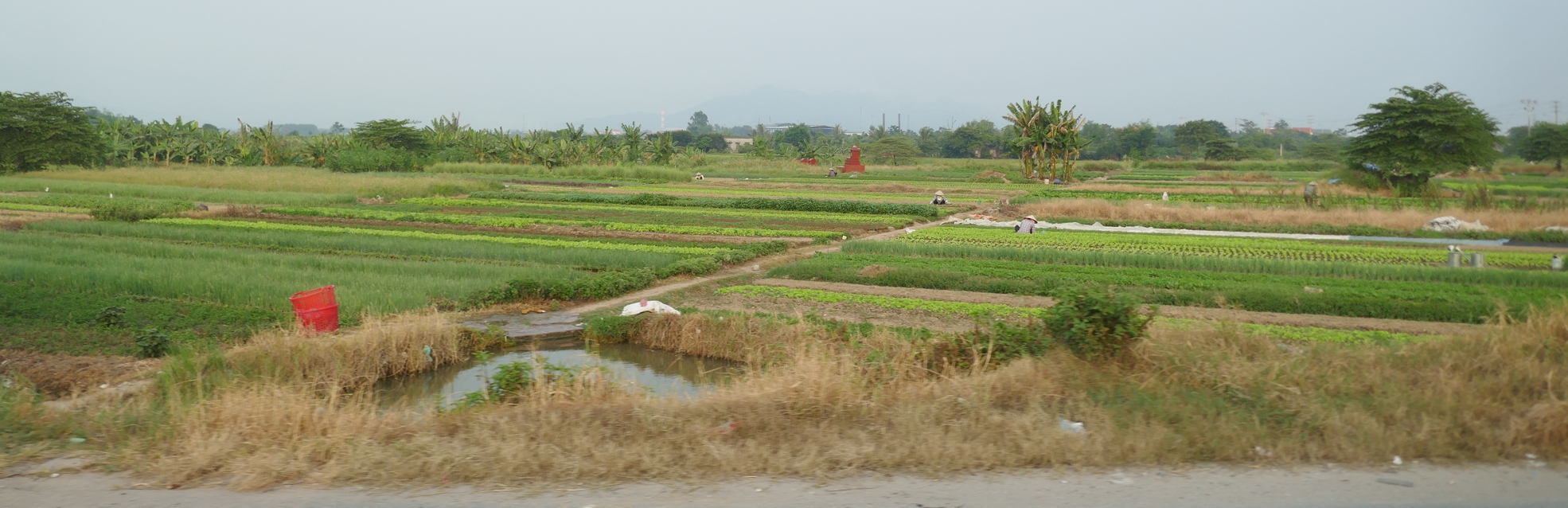 Das Gebiet um Hanoi scheint ein riesiges Gemüse-Anbaugebiet zu sein. Kleine Vororte, Hotel-Neubauten, Vorzeigebauten, Verkaufsgeschäfte und landwirtschaftliche Anbauflächen wechseln sich ab. Soweit man das vom Bus aus erkennen kann, gibt es auf den Feldern eine enorme Vielfalt, nicht einfach nur ein paar standardisierte Salate oder Gemüsesorten, sondern einfach all das, was grün und genießbar ist und schmeckt. Auffallend sind mitten drin zwischen Gemüse- und Reisanpflanzungen kleine Friedhöfe; Platz für Bestattungen sei knapp, daher würden eigene Felder von den Familien genutzt, erfahren wir.