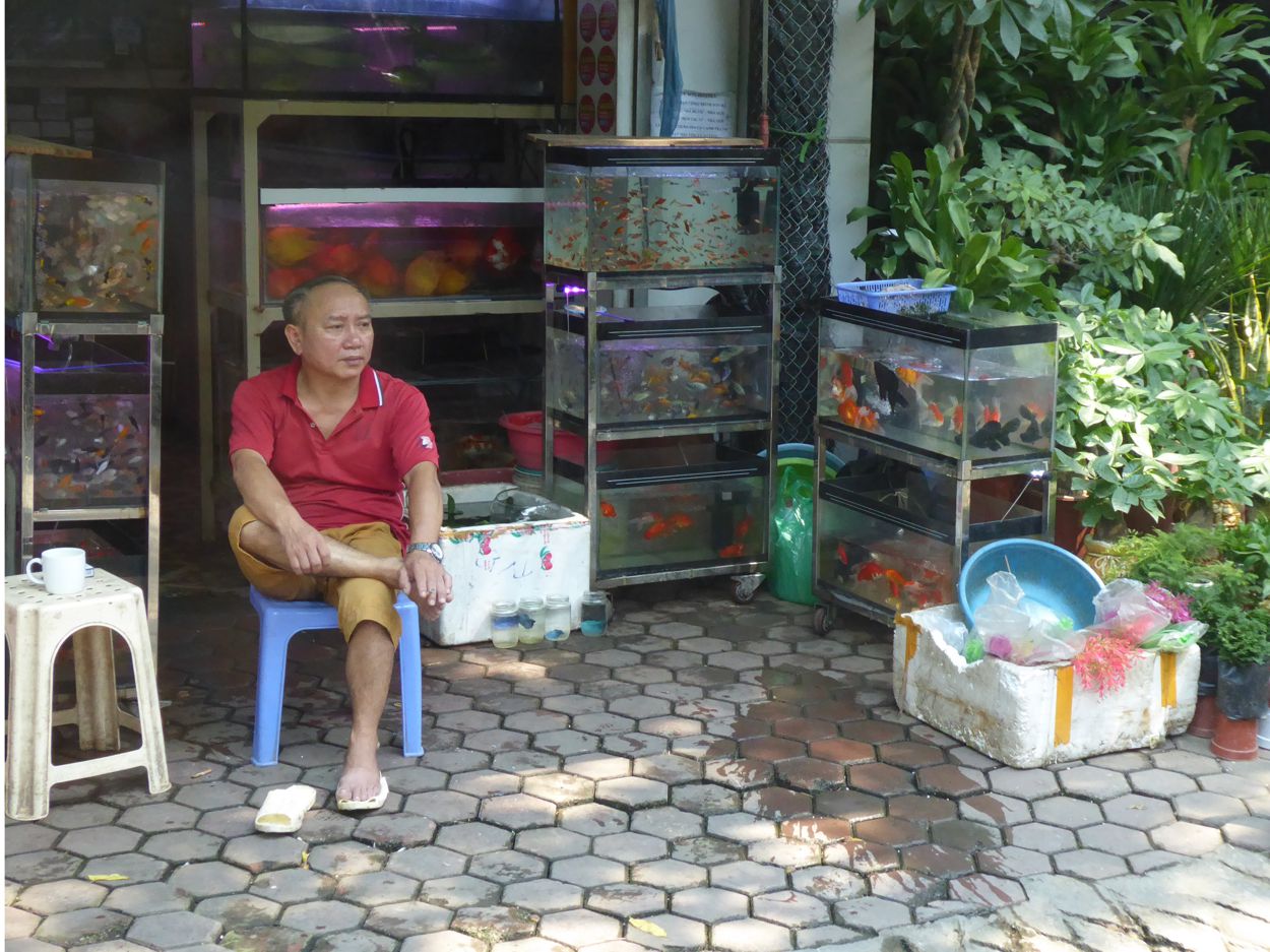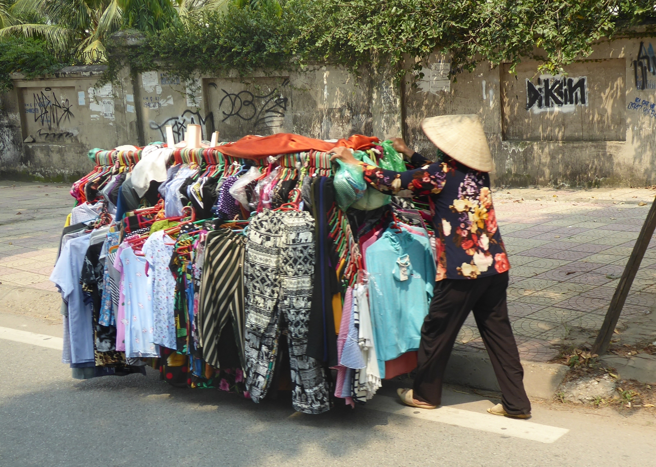 Je näher wir der Stadt kommen, desto mehr gibt es entlang der Straße Händler und Werkstätten für alle erdenklichen Dinge. Gehandelt wird mit Fischen, Blumen, Eiern, Hühnern, Holz, Vögeln, Mopeds, Keramik, Gemüse, Spielzeug – alles entlang der Straße zu haben, und es wird rege eingekauft. Immer mal wieder ist auf einer Ladenbeschriftung zu erkennen, dass hier ein Schreiner, Installateur, Schneider, Masseur, Friseur oder auch jemand, der Jagd auf besondere Tierchen macht, seine Dienste anbietet.