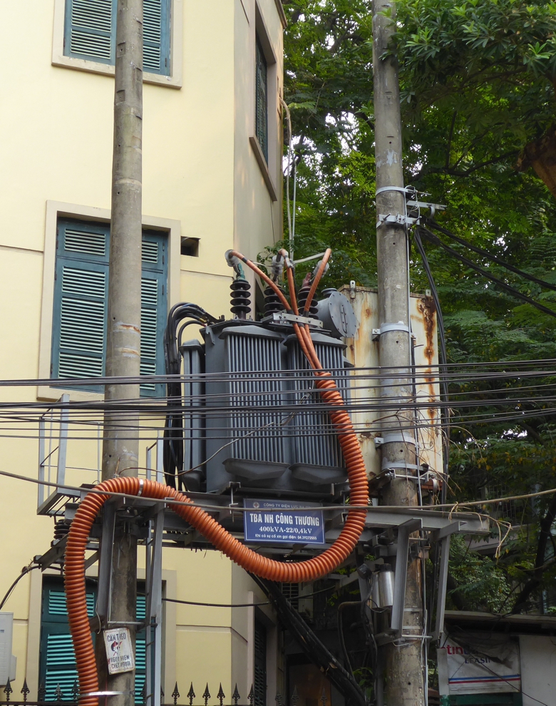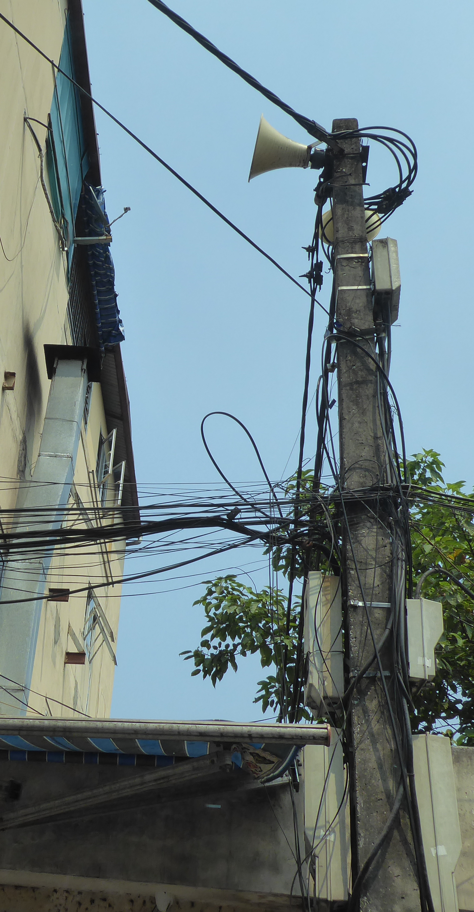 Vom Bus aus bewundern wir nicht nur das Gewimmel im Straßenverkehr, sondern bestaunen auch die äußerst kreativen Kabelbüschel an den Strommasten und die oft unglaublich schmal gebauten alten Häuser.