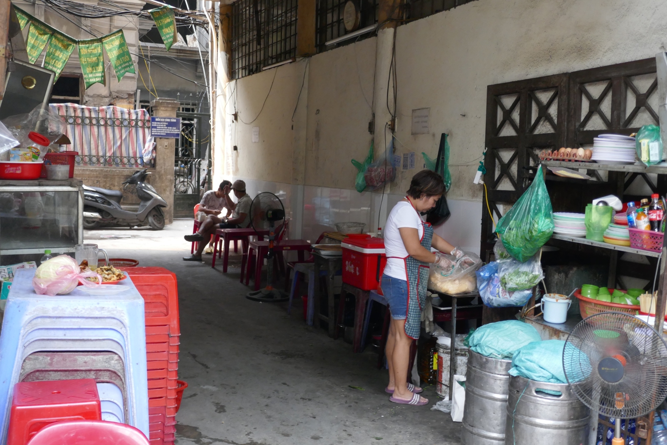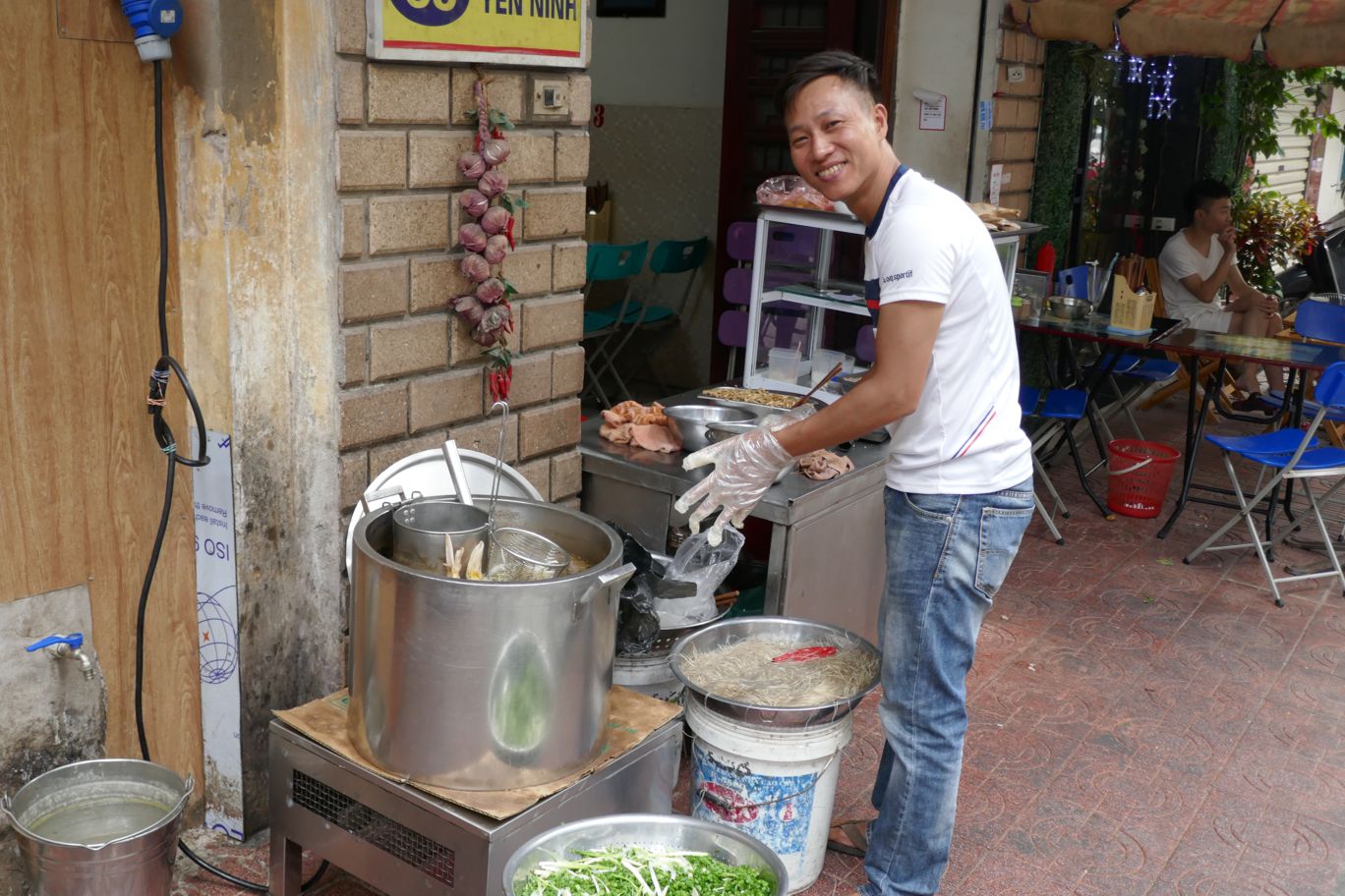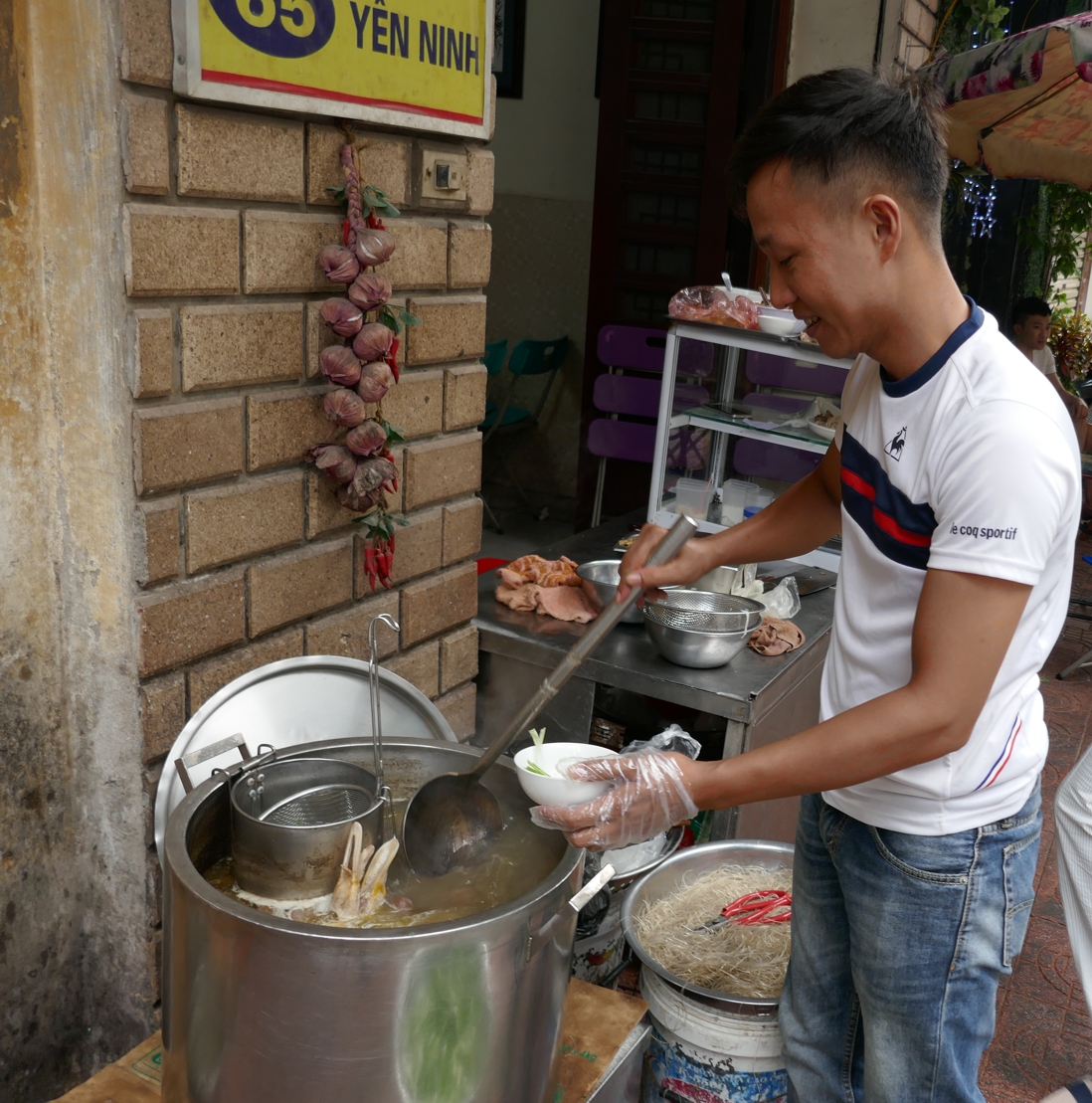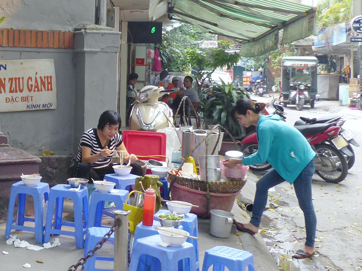 Alles sieht lecker aus, der Stand erstaunlich sauber. Der Koch freut sich, dass wir etwas wollen, und stellt unsere Suppe zusammen – und freut sich wieder, als er sieht, dass es uns schmeckt. Er hat etwas Zeit, setzt sich zu uns, und ein paar Brocken englisch reichen aus, uns ein wenig über Essen und Hanoi zu unterhalten. Leckeres Essen, netter Kontakt, 30.000 Dong bezahlt, gerade mal knapp mehr als ein Euro.