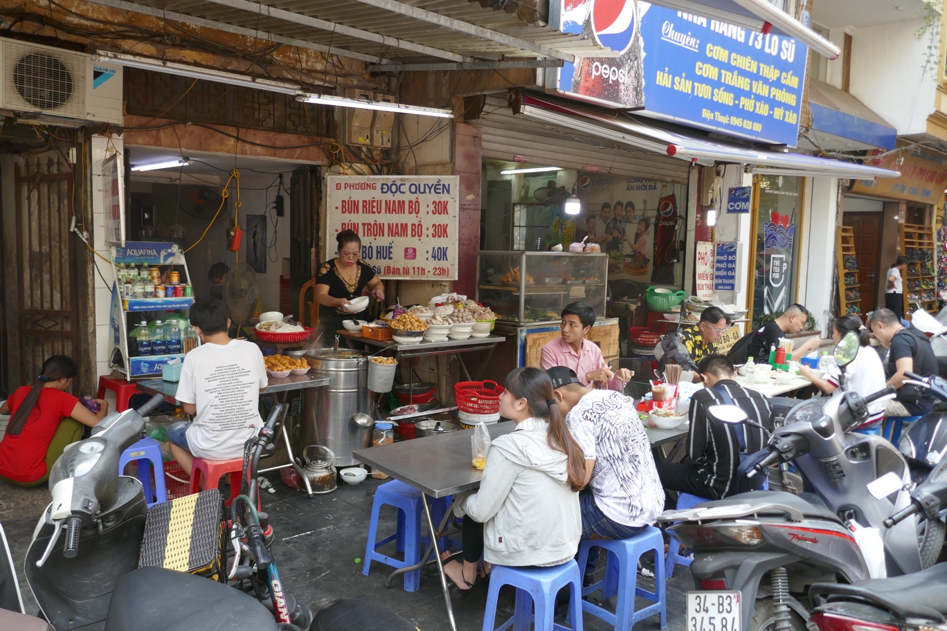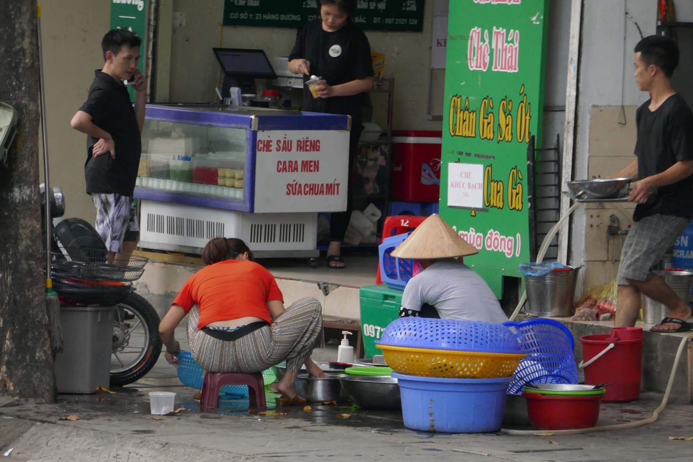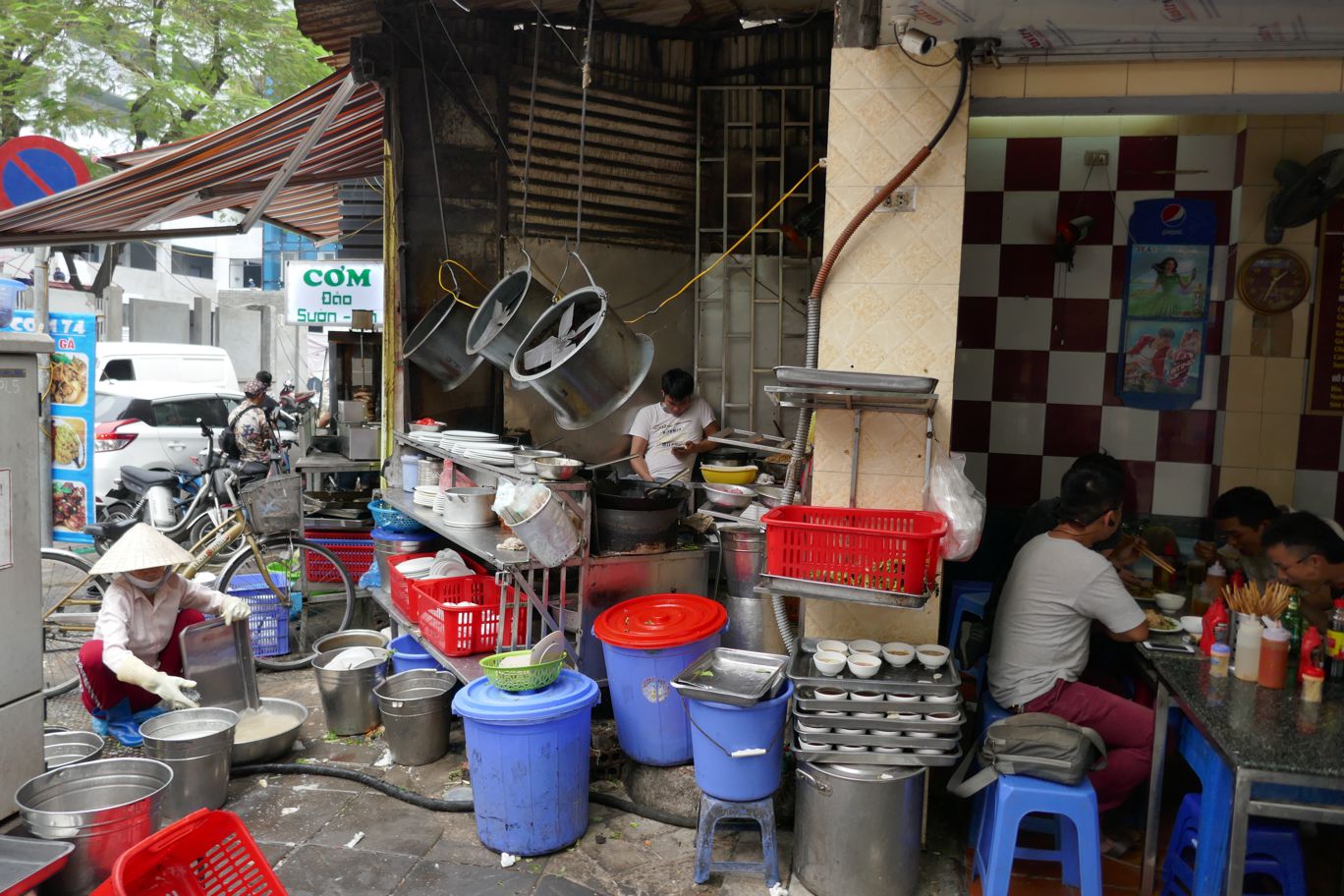 Alles sieht lecker aus, der Stand erstaunlich sauber. Der Koch freut sich, dass wir etwas wollen, und stellt unsere Suppe zusammen – und freut sich wieder, als er sieht, dass es uns schmeckt. Er hat etwas Zeit, setzt sich zu uns, und ein paar Brocken englisch reichen aus, uns ein wenig über Essen und Hanoi zu unterhalten. Leckeres Essen, netter Kontakt, 30.000 Dong bezahlt, gerade mal knapp mehr als ein Euro.