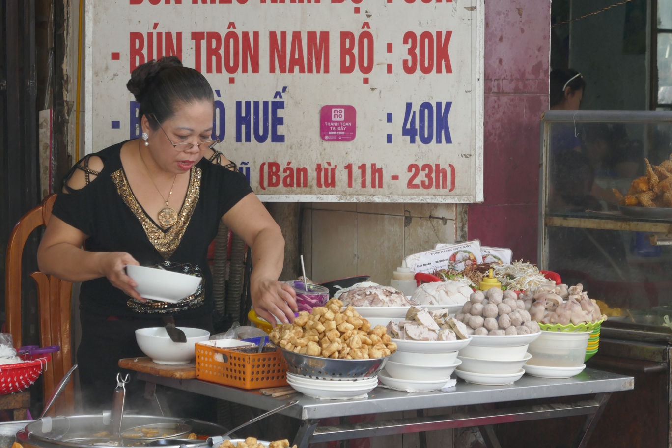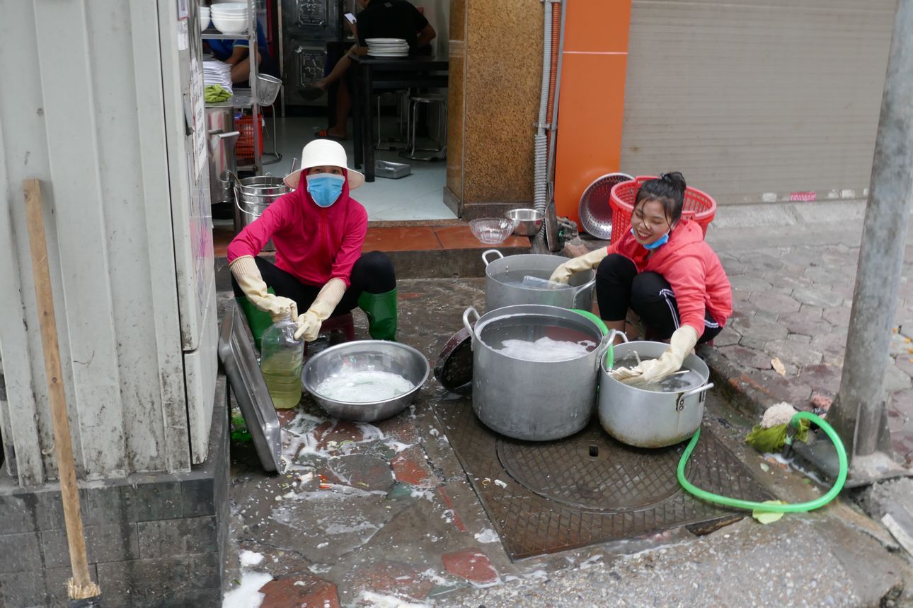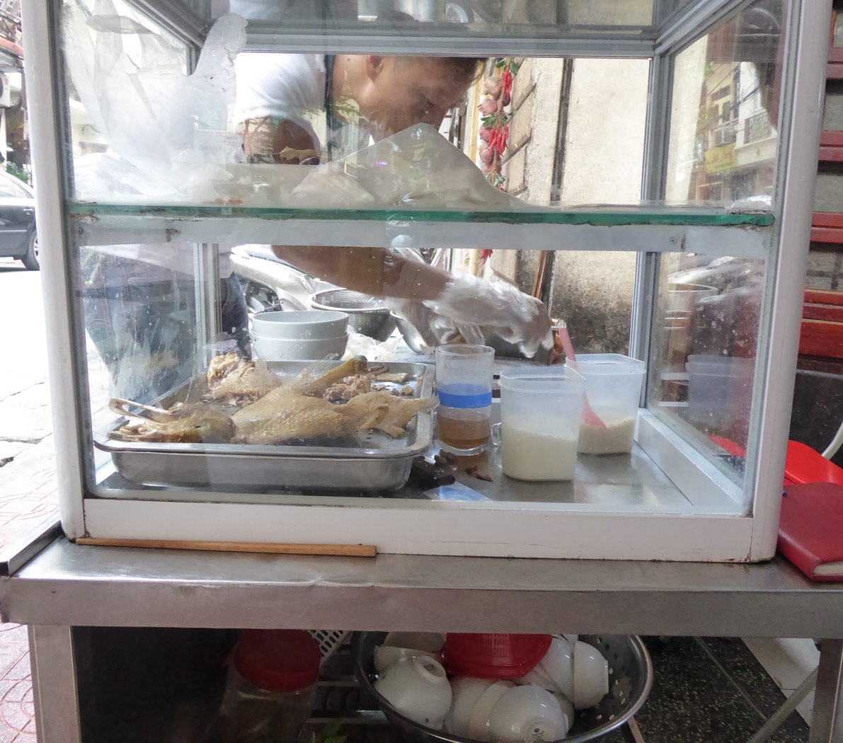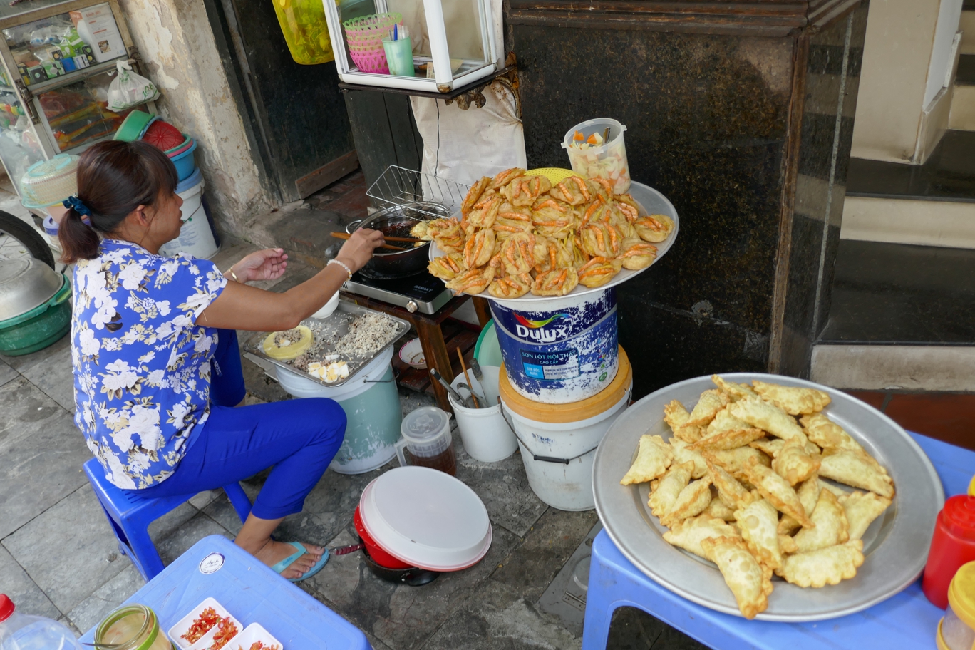 Alles sieht lecker aus, der Stand erstaunlich sauber. Der Koch freut sich, dass wir etwas wollen, und stellt unsere Suppe zusammen – und freut sich wieder, als er sieht, dass es uns schmeckt. Er hat etwas Zeit, setzt sich zu uns, und ein paar Brocken englisch reichen aus, uns ein wenig über Essen und Hanoi zu unterhalten. Leckeres Essen, netter Kontakt, 30.000 Dong bezahlt, gerade mal knapp mehr als ein Euro.