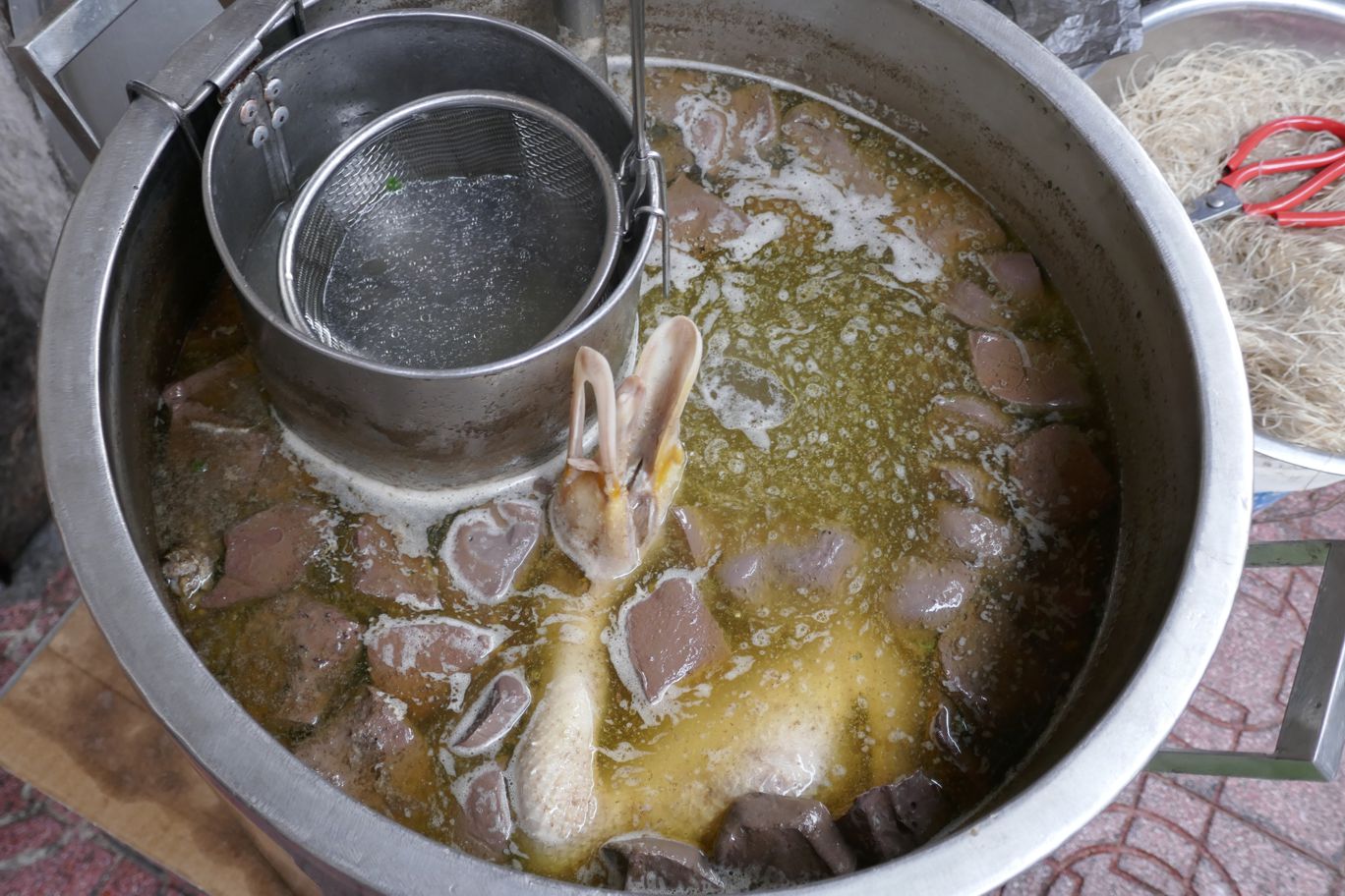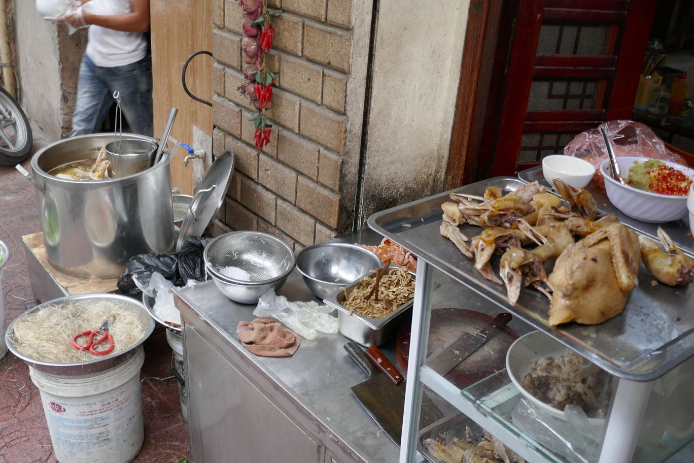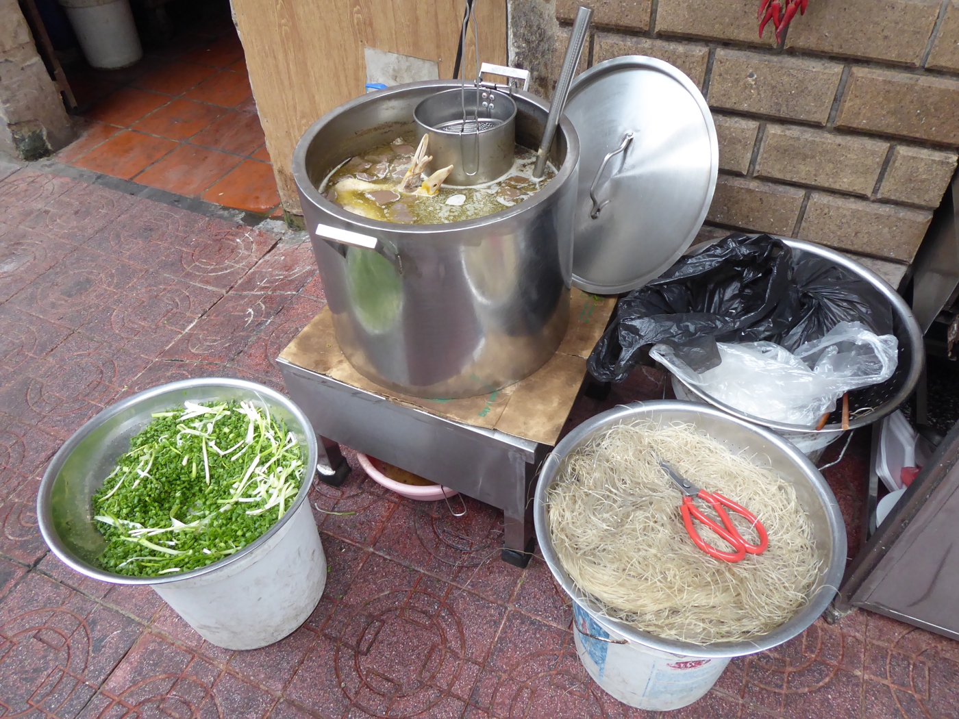 Ein paar Straßen weiter, nach vielen Töpfen und Schüsseln, in die am Straßenrand ein Blick geworfen wurde, ist es so weit. Ein kleiner Stand mit ein paar Tischchen auf dem Fußgängerweg. In einem Topf schwimmt eine Ente, wie es sich gehört, mit Kopf und Füßen. Die Suppe duftet lecker. Auf der Auslage nebenan wird gerade eine andere Ente kleingehackt, daneben liegen frische Sojasprossen, Nudeln und Frühlingszwiebeln und ein paar andere Zutaten und Kräuter. Nudeln werden mit der Schere auf die erforderliche Länge gebracht.