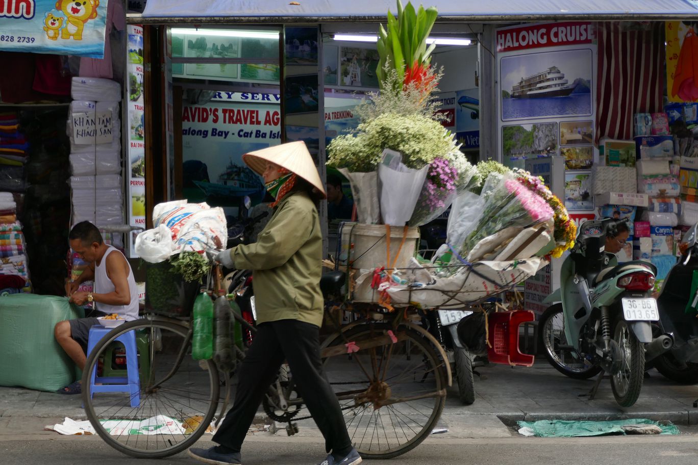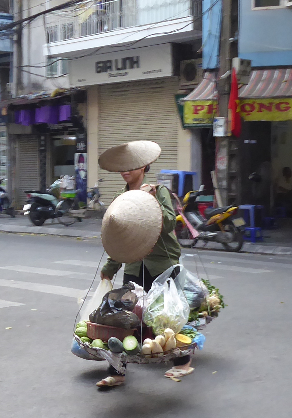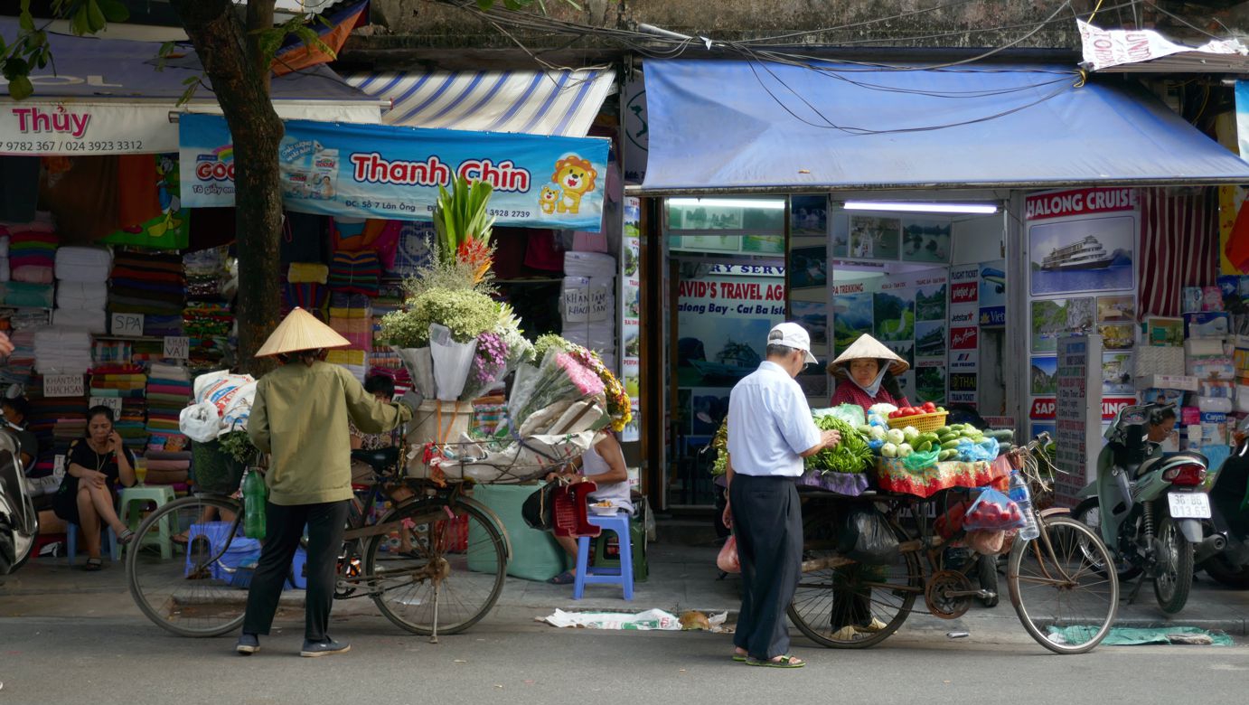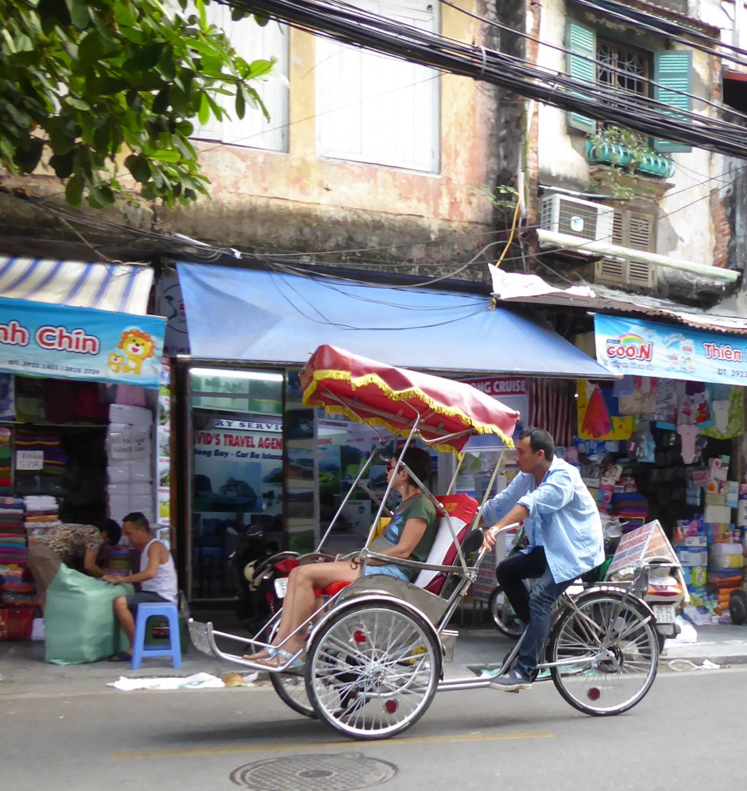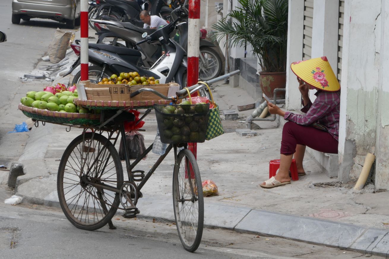 Der Vietnamese ist äußerst ungern zu Fuß unterwegs, fährt lieber Moped, erledigt vom Moped aus, soweit es geht, auch seine Einkäufe, und stellt es am liebsten direkt neben dem Sitzschemel der Garküche ab, bei der er zum Essen geht. Fußgänger sind am Straßenrand unterwegs, sorgen für weitere Belebung zwischen Mopeds, Autos, Rikschas und Tuc Tuc’s – und für uns heißt es in der doch etwas gewöhnungsbedürftigen Situation, ziemlich aufmerksam und vorsichtig zu sein.