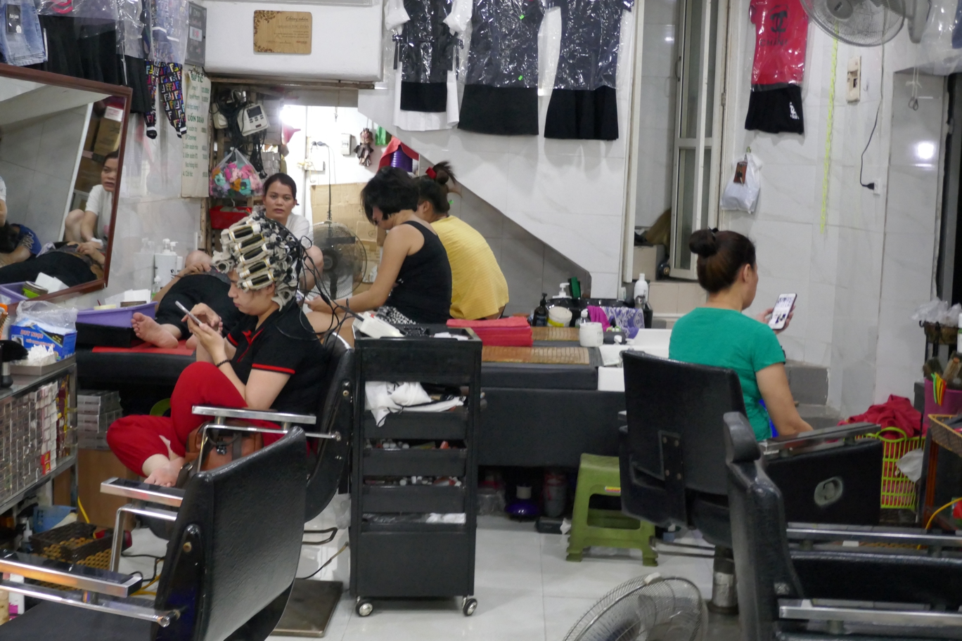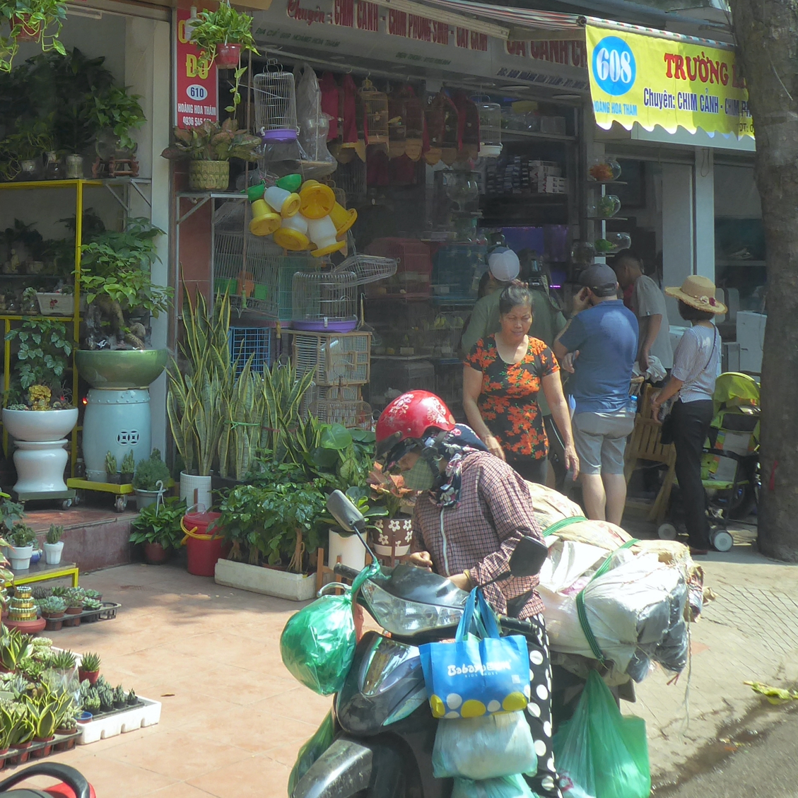 Kaum ein Haus gibt es, in dem das Erdgeschoss nicht von irgendeinem Ladengeschäft belegt ist. Meist natürlich irgendwelche kleine Restaurants, die den Fußgängerweg gleich mitnutzen, Obst- und Gemüseläden, Reparaturwerkstätten, Küchenartikel, Geschenkartikel, Elektronik, Schneidereien, Kleidung, Möbel, Steinskulpturen für den Garten, Hausaltäre zum Selberbauen, Blumen und Gestecke, Süßwaren – einfach alles, was man sich so vorstellen kann. Überrascht ist man nicht, wenn auf irgendeinem Fußgängerweg direkt an der Straße ein Friseurstuhl steht und Haare geschnitten werden oder neben einem Fahrrad eine kleine Ruhepause eingelegt wird.