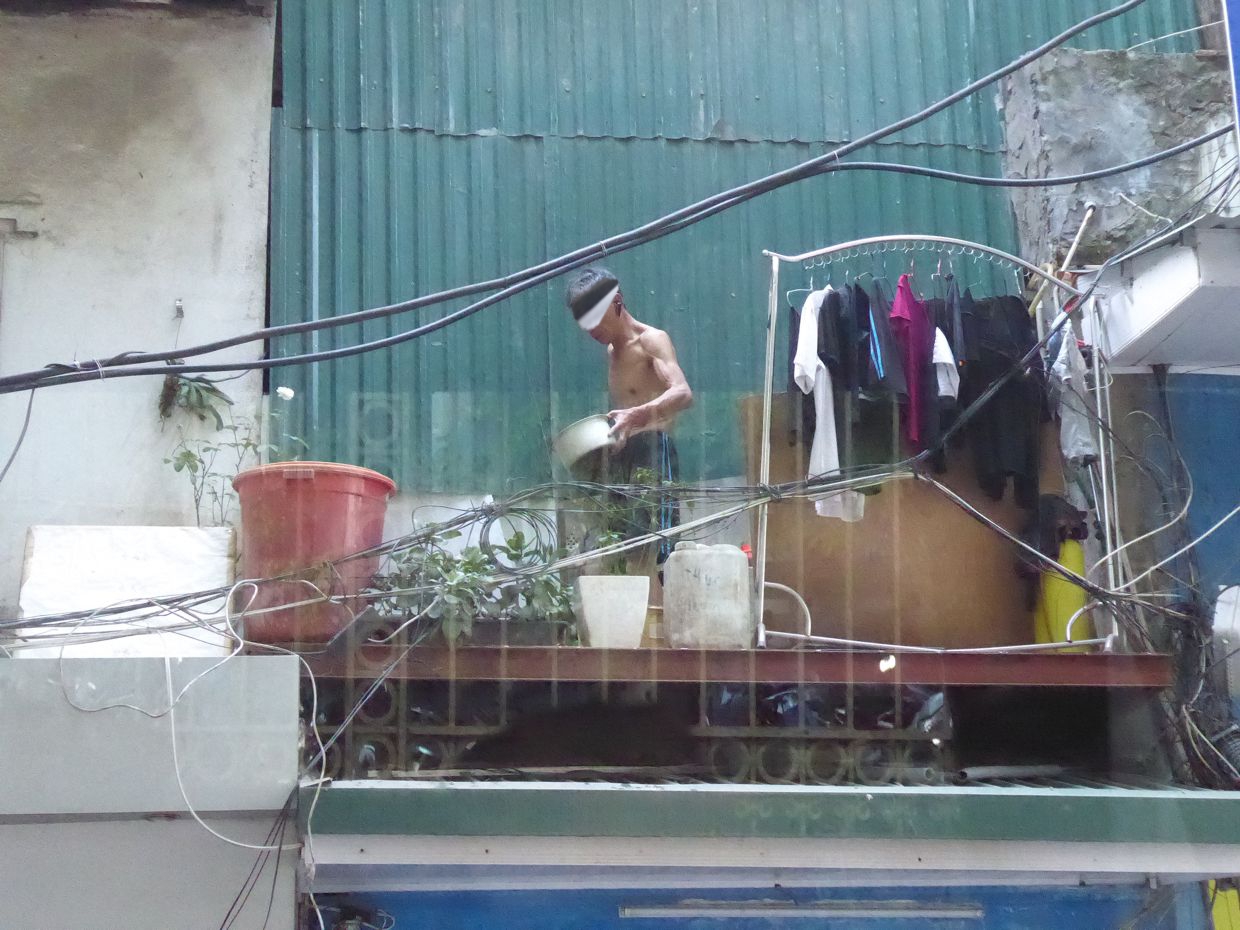 Vom Hotel aus, wo wir auf einer der obersten Etagen wohnen, blicken wir noch einmal hinunter auf die Dächer und Dachgärten der Nebengebäude ebenso wie auf die belebte Straße vor dem Hotel, auf der wir gleich starten werden. Um uns herum zeigt sich, dass so ziemlich alles genutzt wird, was sich an Fläche bietet – oben auf den Häusern viele Dachterrassen und Dachgärten, auf denen gegessen, angepflanzt und Wäsche getrocknet wird. Die Dächer sind bestückt mit allerhand Gerätschaften, um Warmwasser zu bereiten. Unten auf der Straße wird einfach jegliche Fläche irgendwie genutzt, ob von Fußgängern, Rikschas, Karren, Motorrädern, Rollern, Autos und Bussen oder als Verkaufsbereich, Reparaturplatz, Restaurant, Parkplatz, erweiterter Wohnbereich oder Plätzchen zum Ausruhen.