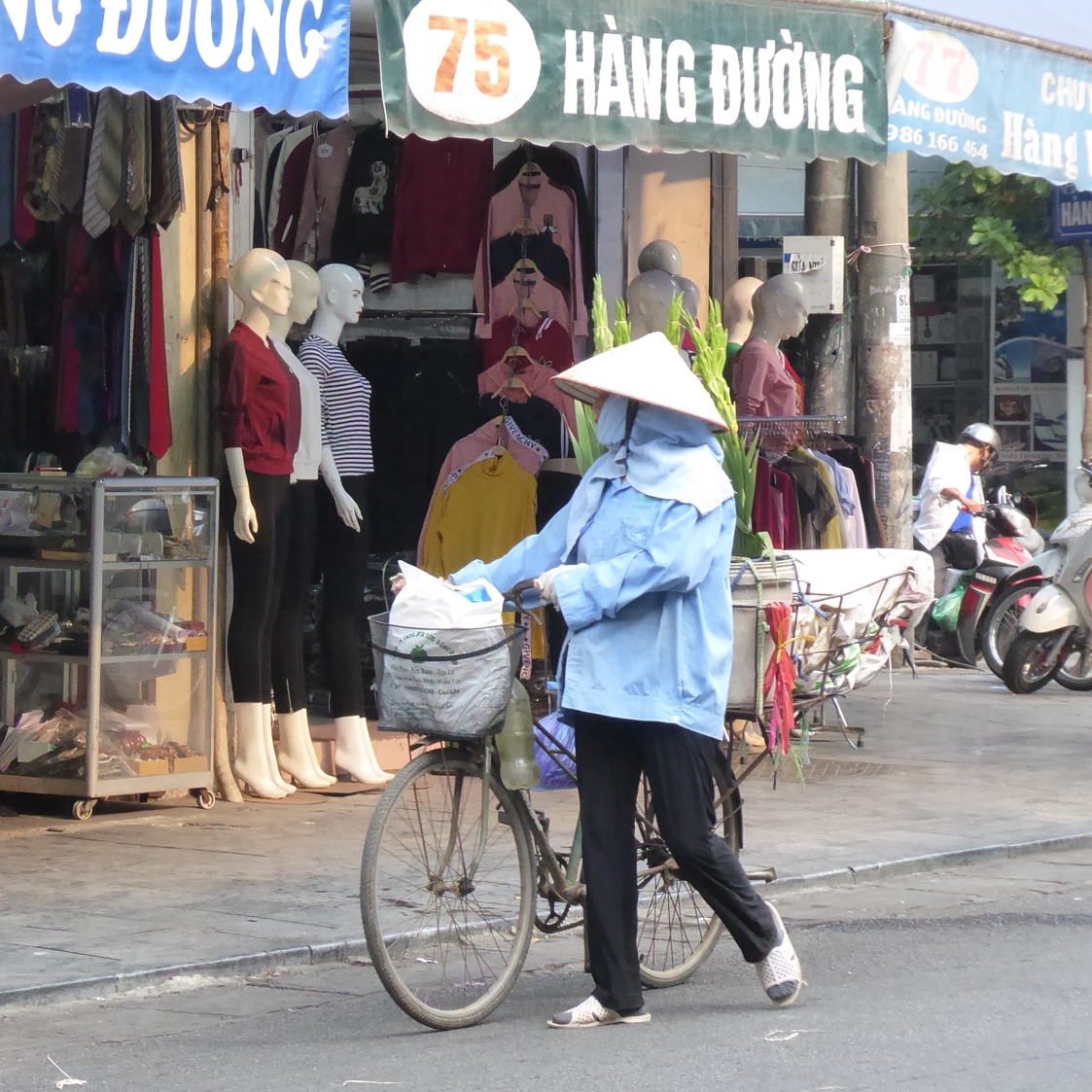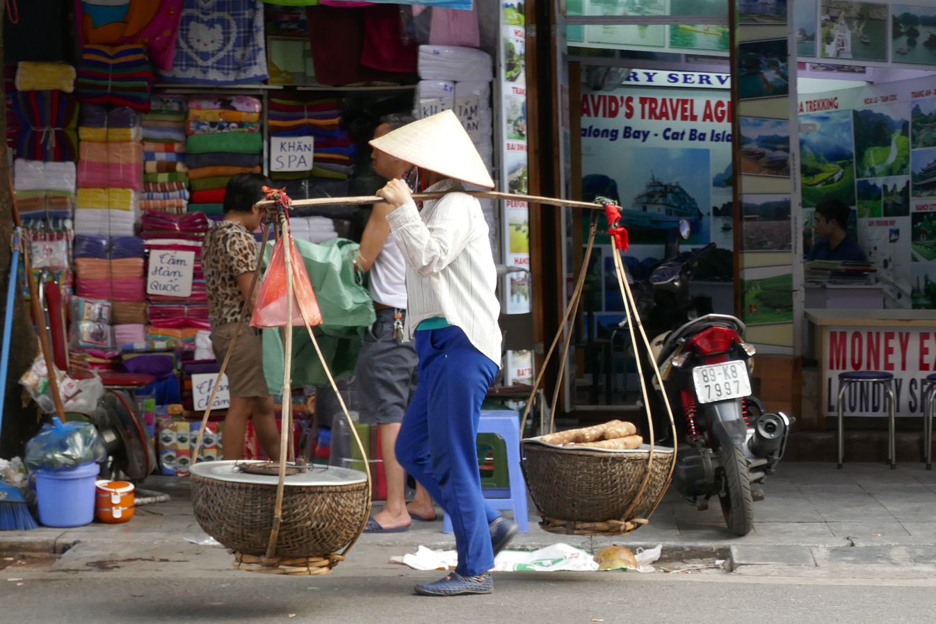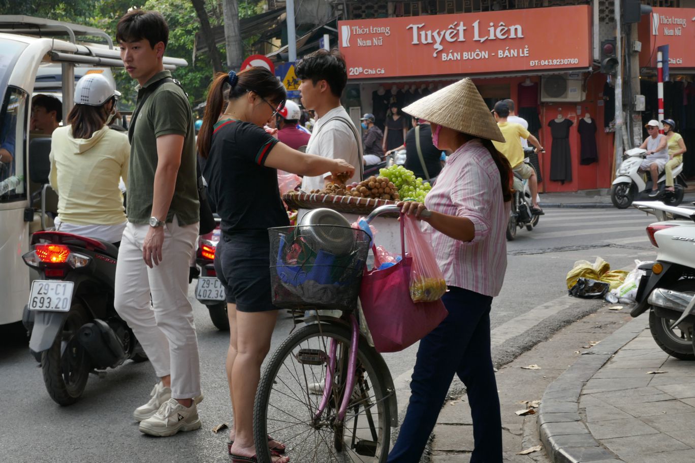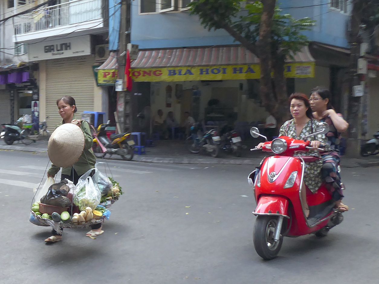 Weiter geht es für uns durch die Altstadt von Hanoi, in Richtung Innenstadt. Die Szenerie ändert sich kaum, es bleibt das charmante, altstädtische Hanoi. Nur in der Ferne sieht man ein paar Hochhäuser. Uns beeindrucken die vielen mobilen Händler in den Straßen, Frauen und Männer mit Mopeds, Fahrrädern, zu Fuß oder am Straßenrand sitzend. Frauen sind oft unterwegs mit zwei am Tragebalken hängenden Körben, gefüllt mit Obst und allem, was in Gärten so wächst. Andere sitzen mit ähnlicher Auswahl auf den Fußgängerwegen.