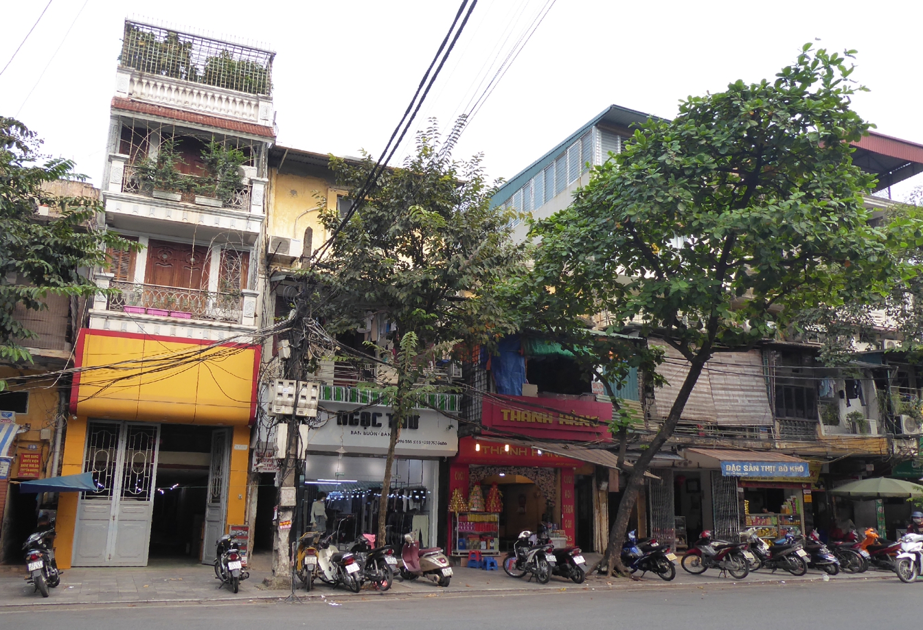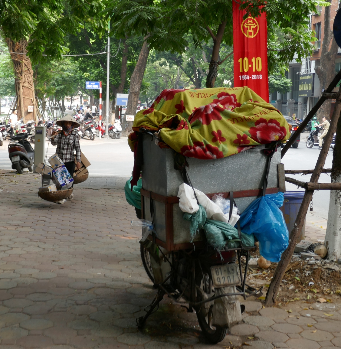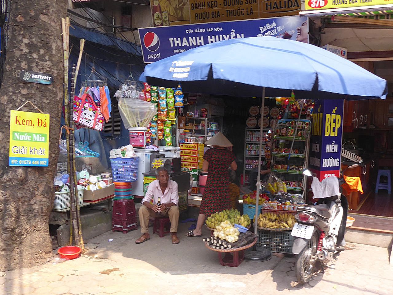 Weiter geht es für uns durch die Altstadt von Hanoi, in Richtung Innenstadt. Die Szenerie ändert sich kaum, es bleibt das charmante, altstädtische Hanoi. Nur in der Ferne sieht man ein paar Hochhäuser. Uns beeindrucken die vielen mobilen Händler in den Straßen, Frauen und Männer mit Mopeds, Fahrrädern, zu Fuß oder am Straßenrand sitzend. Frauen sind oft unterwegs mit zwei am Tragebalken hängenden Körben, gefüllt mit Obst und allem, was in Gärten so wächst. Andere sitzen mit ähnlicher Auswahl auf den Fußgängerwegen.