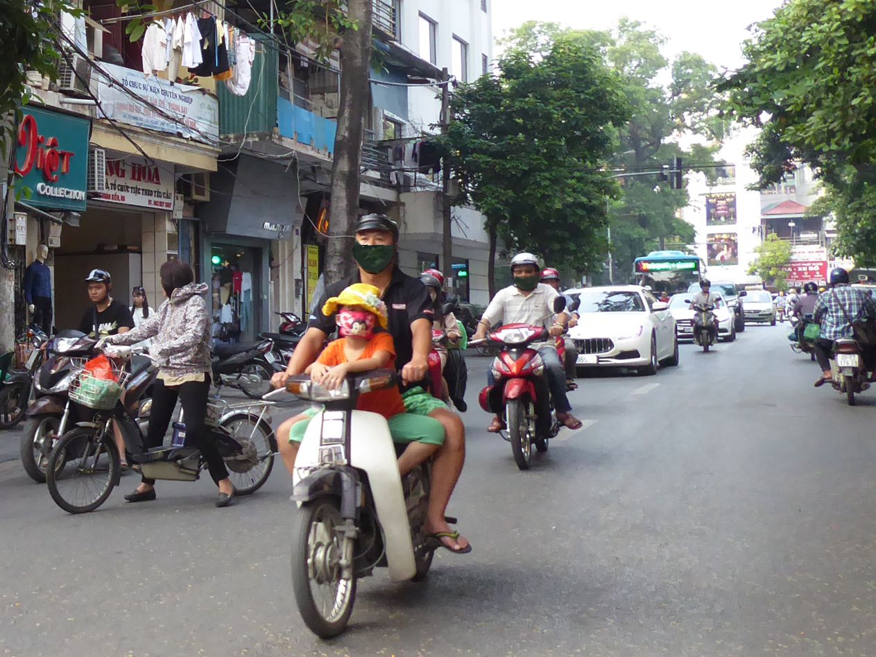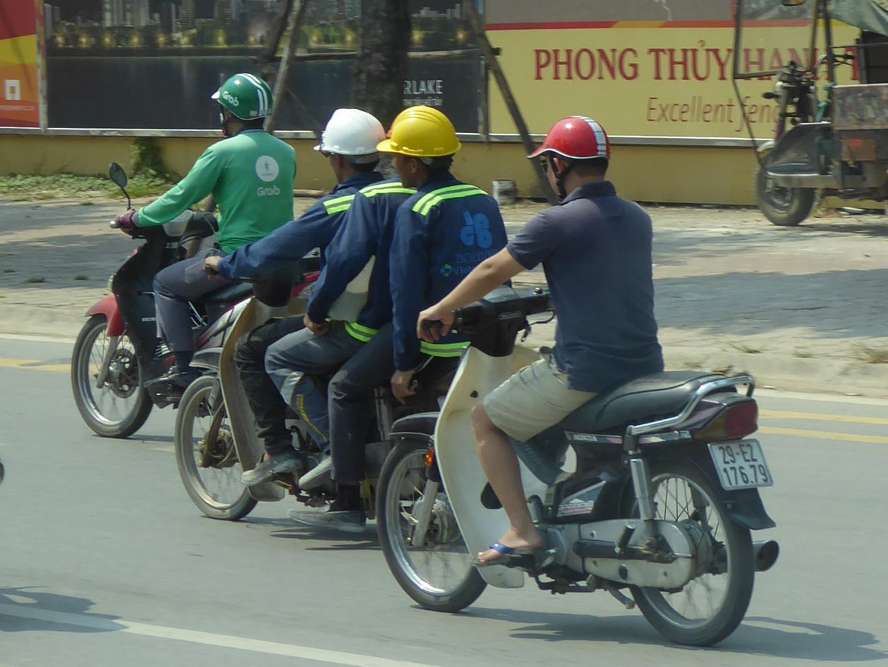Auf den Mopeds sieht man jüngere und ältere Leute, oft Paare und auch Familien mit ein oder zwei, manchmal sogar drei Kindern zu den Erwachsenen gepackt. Nicht selten sieht man junge Mütter mit besonderen Sicherheitsgurten – vorne ein Baby angeschnallt, auf dem hinteren Sitz ein kleineres Kind mit einer Art Rucksackgurt.