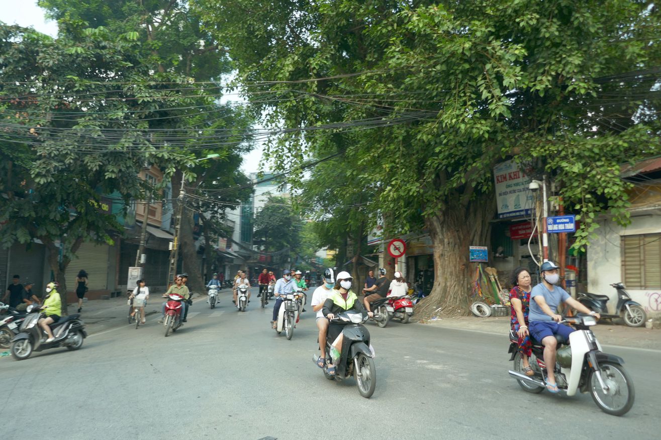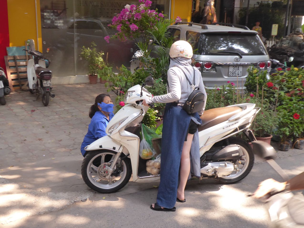 Sitzen jüngere Frauen auf dem Roller, sind sie häufig mehr oder weniger komplett vermummt – mit einer Stoffjacke, sehr lang, mit richtig großer Kapuze, die weit ins Gesicht gezogen ist, die Ärmel so lang, dass sie die Hände verdecken, im Gesicht ein übergroßer Mundschutz. Gerade die Augen schauen raus. Viele haben auch einen Ganzkörperumhang. Dann blitzt auch mal aus einem Seitenschlitz mehr raus, die Beine – mal eine Hose, mal ein Minirock. Wir bekommen von unserem Reiseleiter mit, dass unter dieser Verkleidung meist schicke junge Frauen stecken, die sich im Büro dann „entblättern“ – schick sei nämlich nicht nur eine tolle Kleidung, die man so relativ unbeschadet auf dem Moped tragen könne, sondern auch eine möglichst helle Hautfarbe, daher der umfassende Sonnenschutz.