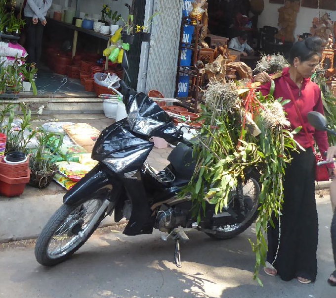 Uns begegnen vollgepackte Fahrräder mit Reissäcken, Mopeds mit Heuballen oder mobilem Blumenladen oder Ziegelsteinpacken. Die Fußgängerwege sind allesamt meist belegt, wenn nicht von Verkäufern oder Straßenküchen, dann mit Mopeds.