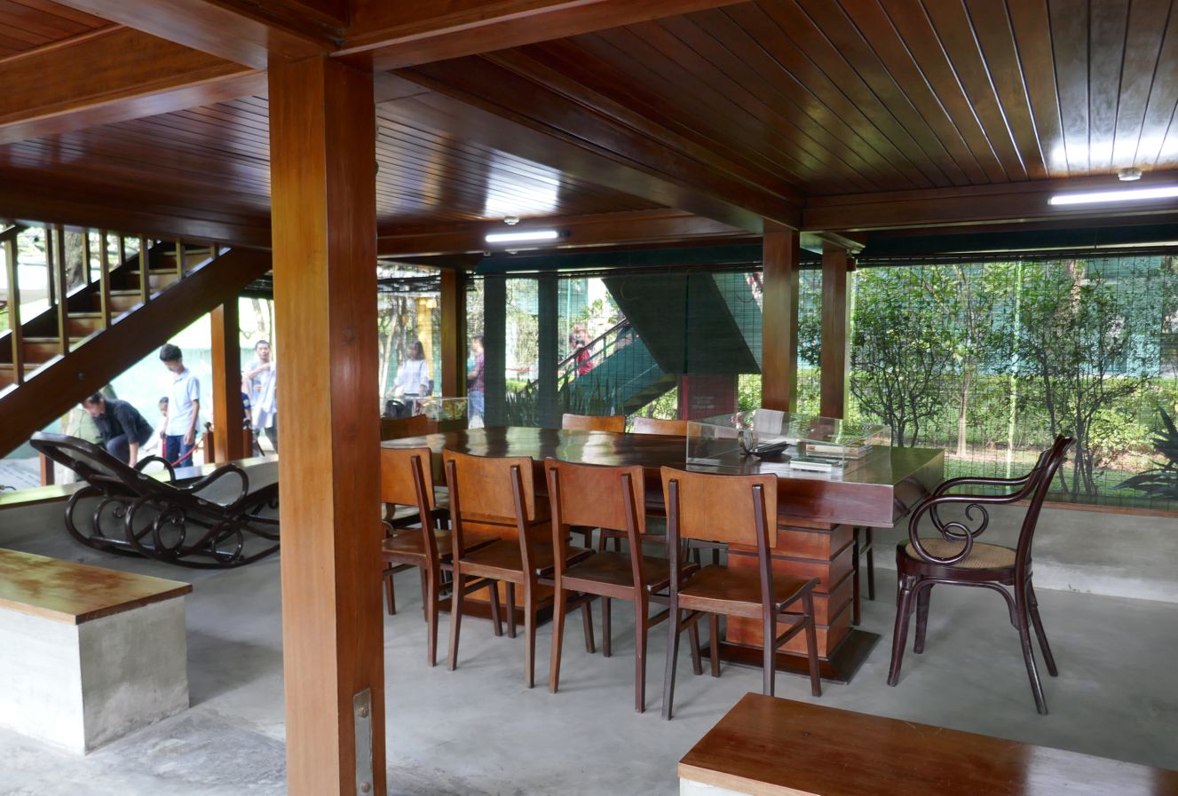 Etwas weiter im Park liegt dann das Ho Chi Minh Haus, das er später bewohnte, ein einfaches Stelzenhaus nach Vorbild der Häuser in den Bergen, im Erdgeschoss das Besprechungszimmer, im Obergeschoss die Wohnräume.