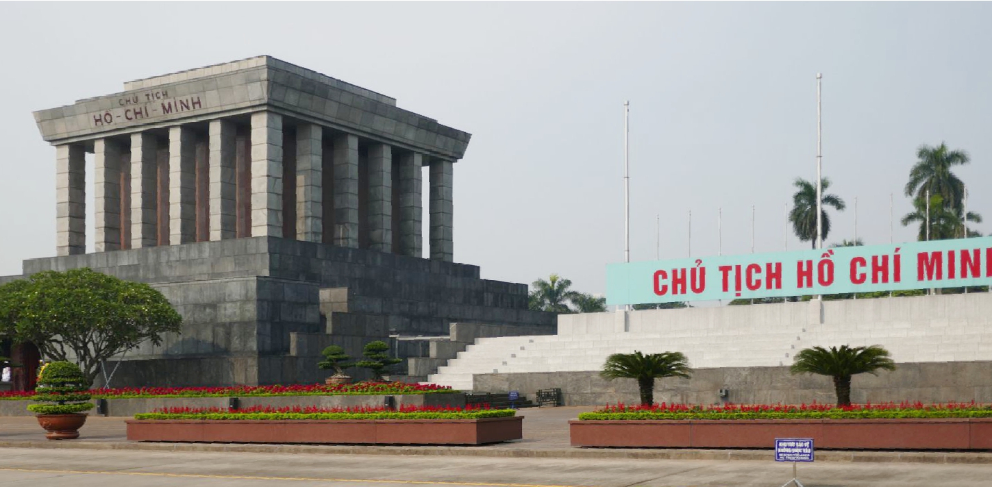 Angekommen an der Gedenkstätte, vor uns das Mausoleumsgebäude, ein großer kantiger Bau, gebaut 1973 bis 1975, mit Materialien aus ganz Vietnam erstellt. Es ist noch früh am Tag, es gibt noch keine sonst übliche lange Warteschlange. Sicherheitskontrolle, dann ein langer Weg durch die Parkanlage um das Mausoleum herum. Links und rechts alle zwanzig Meter ein stramm stehender junger Offizier in weißer Paradeuniform, den angehefteten Orden nach anscheinend hoch dekoriert. In Bewegung nur dann, wenn ein Besucher doch sehr bestimmt darauf hingewiesen werden muss, dass er auf dem Weg zu bleiben hat. Der Zugang ins Mausoleum liegt zu dem Platz hin, auf dem Ho Chi Minh 1945 die Unabhängigkeit Vietnams erklärte.