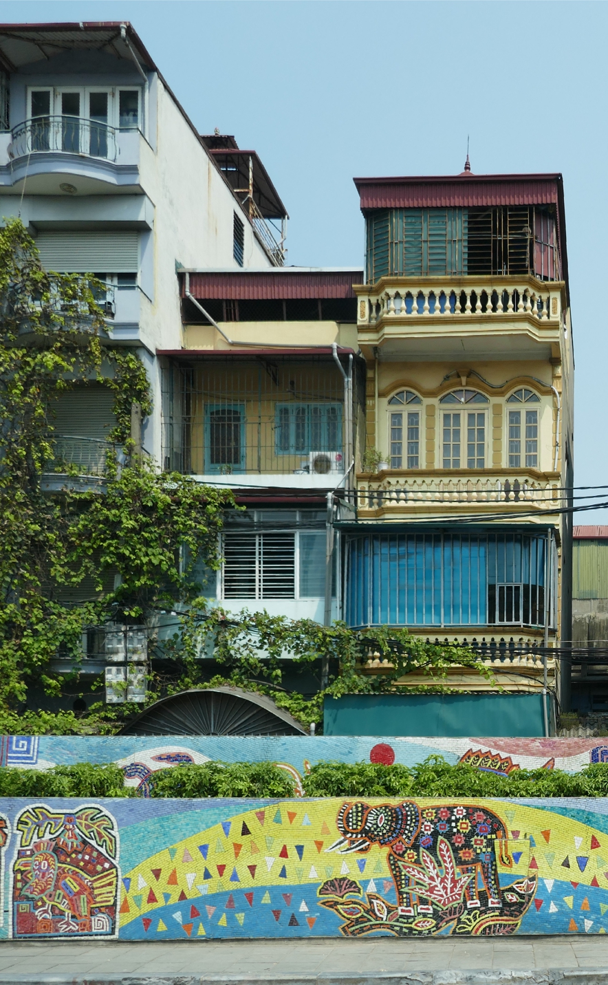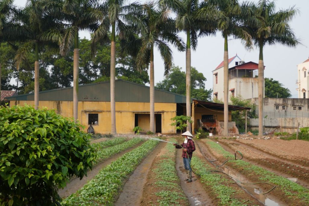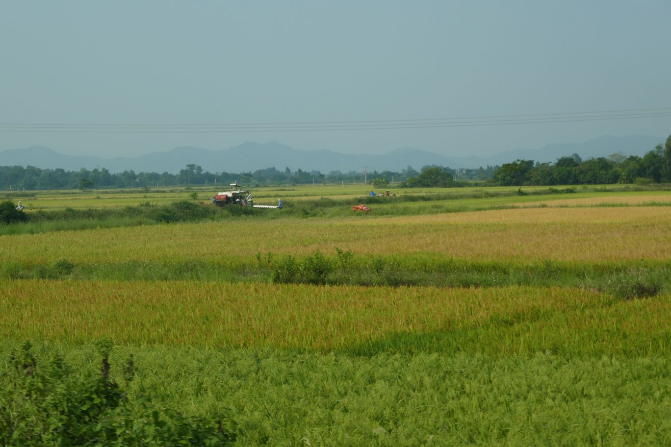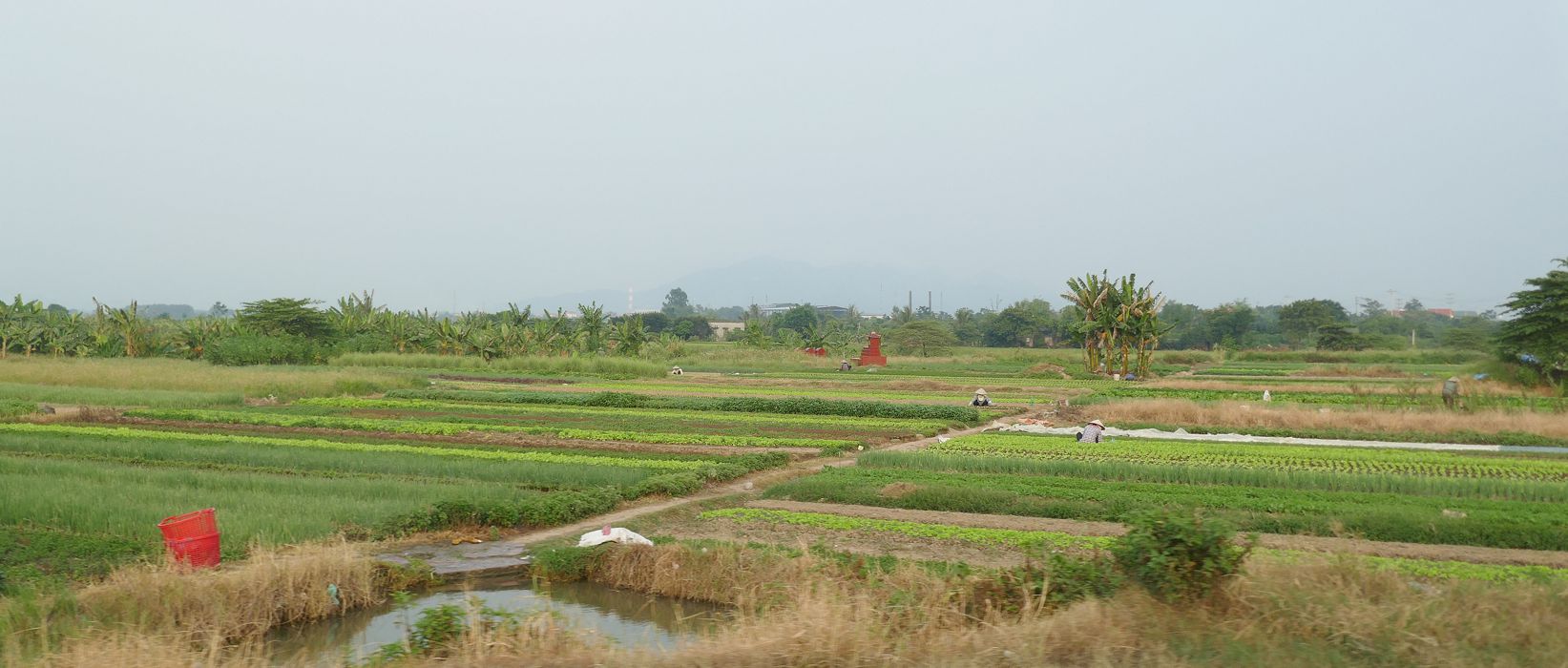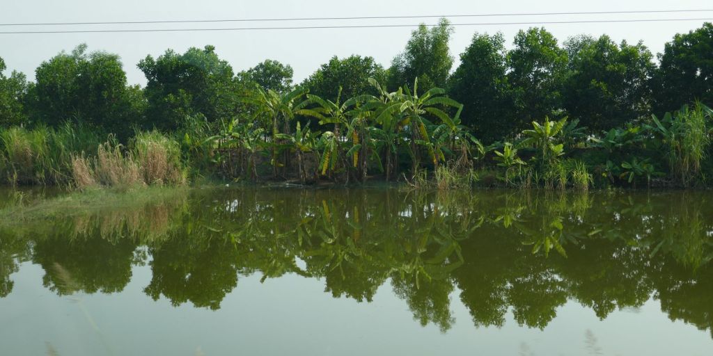 Wir lassen Hanoi hinter uns. In der Ferne sehen wir noch die Hochhäuser der Außenbezirke von Hanoi, entlang der Straße liegen immer mehr landwirtschaftliche Flächen. So ein wenig haben wir ab jetzt ein Parallel-Programm, zum einen viele Informationen über Vietnam, zum anderen beeindruckt uns all das, was entlang der Strecke zu sehen ist. Kaum heraus aus Hanoi durchfahren wir ein landwirtschaftlich geprägtes Gebiet, vor allem Reis- und Gemüsefelder, dazwischen mal Fisch- und Ententeiche, verstreut kleine Städte und Dörfer.