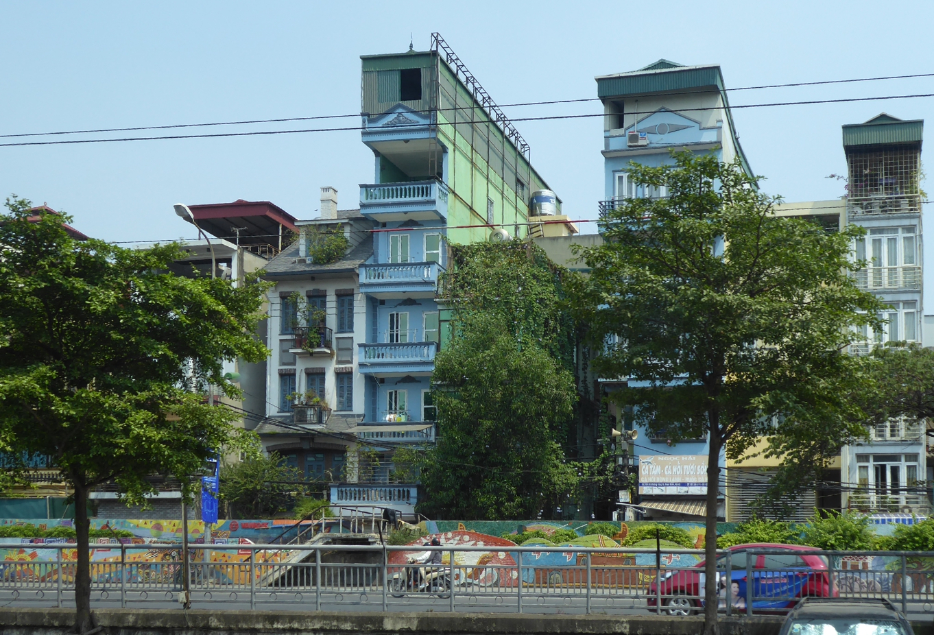 Hinter der Mauer oder auf der Böschung drüber stehen die Wohn- und Geschäftshäuser, in Innenstadtnähe noch viele Bauten, die in der Kolonialzeit entstanden sind, etwas weiter draußen dann eher schmucklose Zweckbauten. An dieser Straße fällt so richtig auf, wie schmal die Häuser gebaut sind, nur so etwa drei bis fünf Meter breit; interessant ist, dass sich diese Bauweise auch bei traditionell orientierten Neubauten erhalten hat.