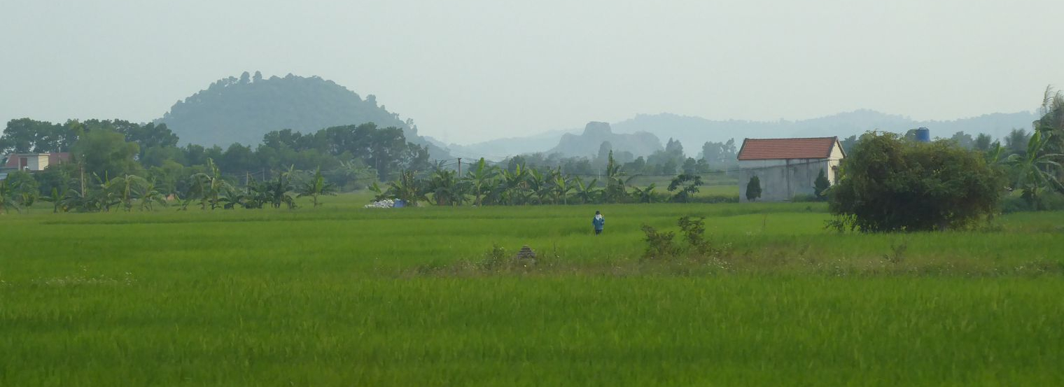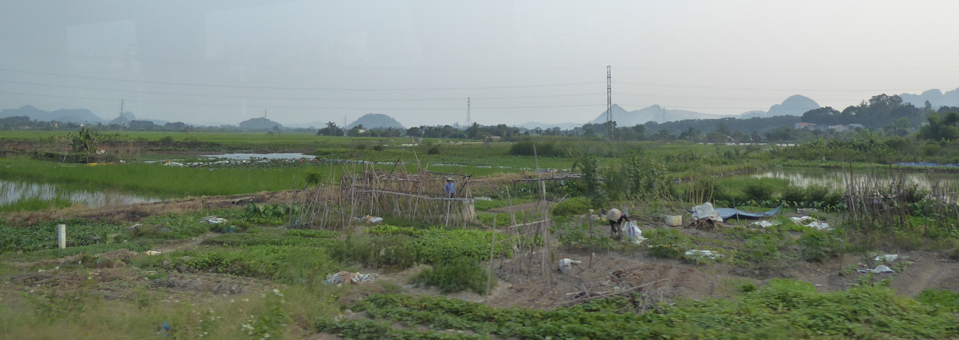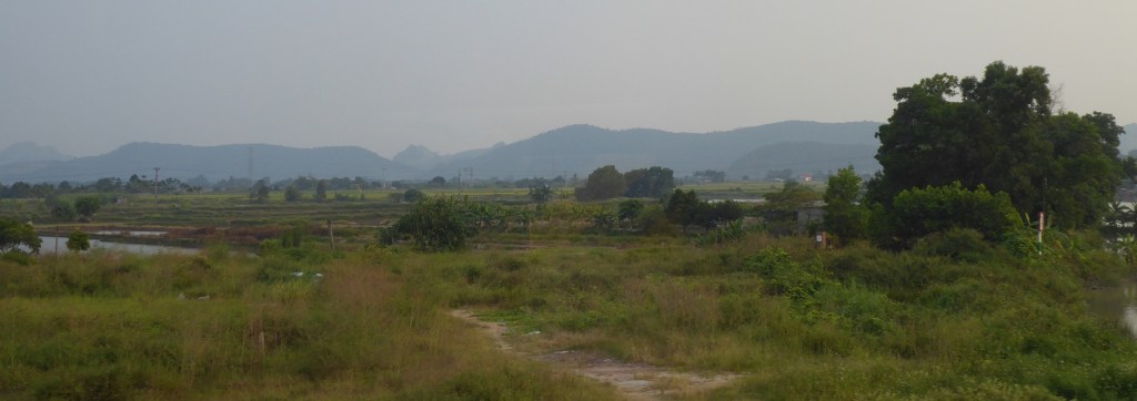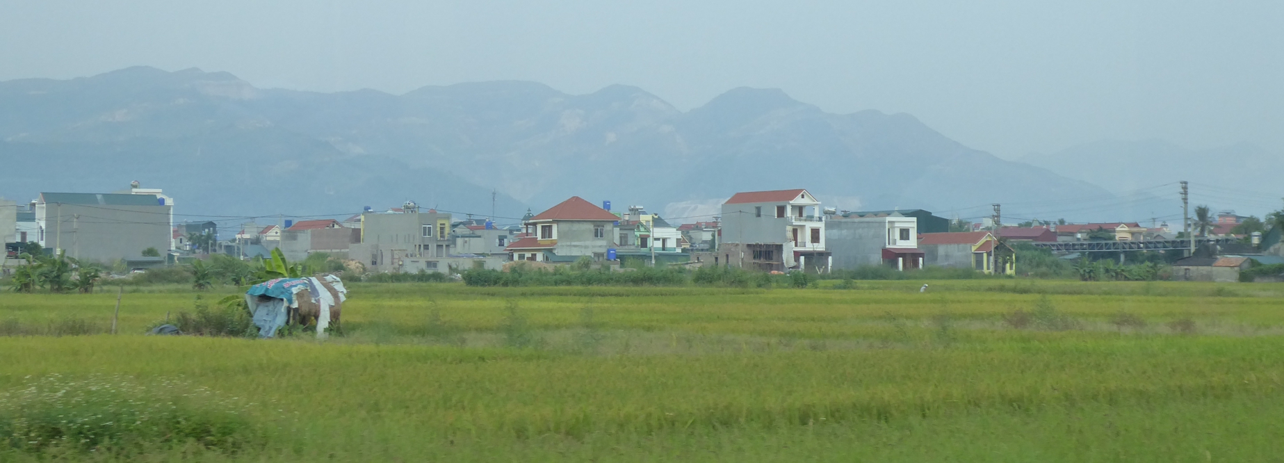 Während all dieser Informationen leben wir weiter in unserer Parallelwelt – drinnen im Bus die Vietnam-Info, manchmal ergänzt mit Hinweisen auf das, was draußen zu sehen ist, wo es vorbei geht vor allem an Dörfern und Feldern.