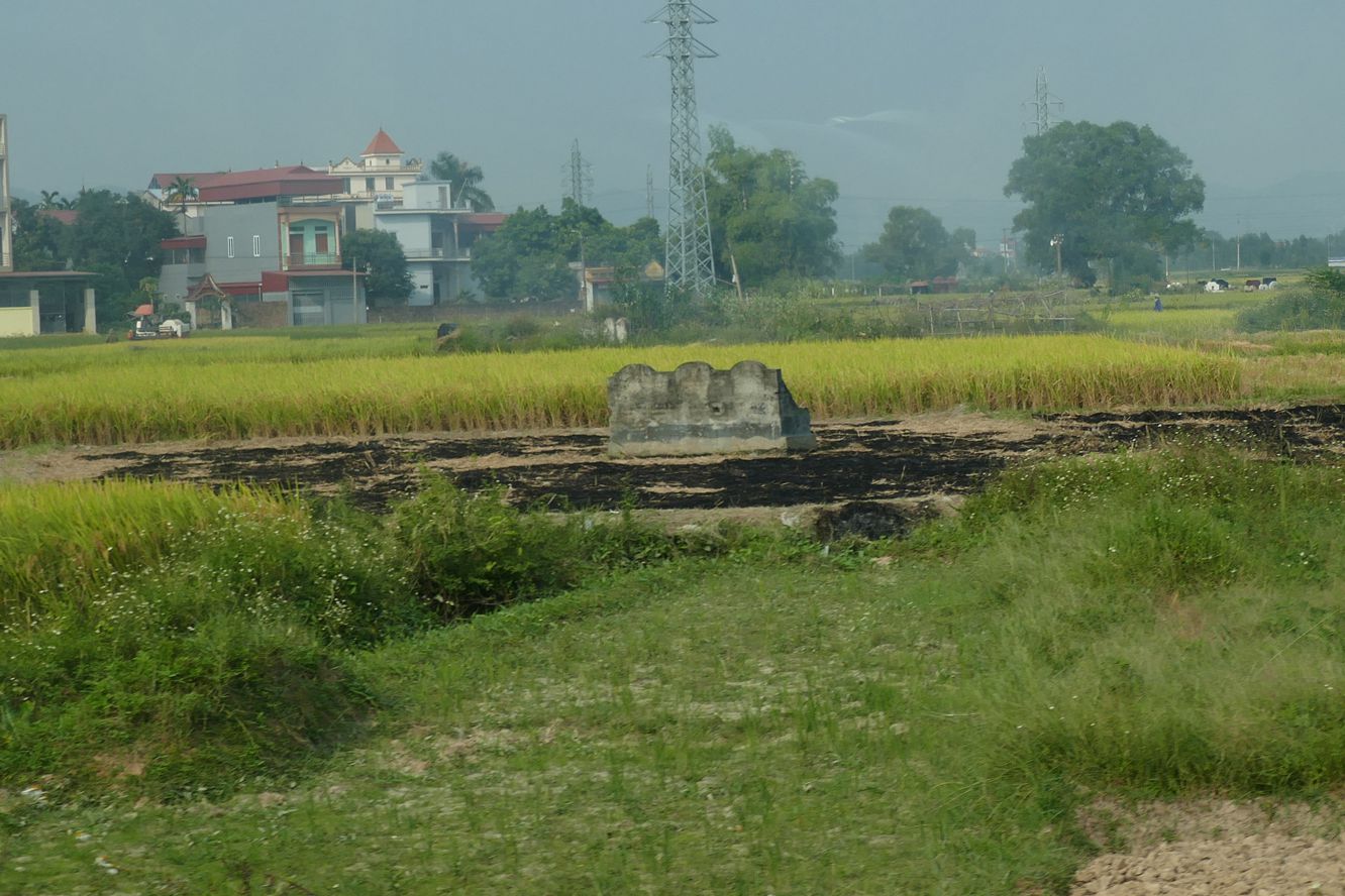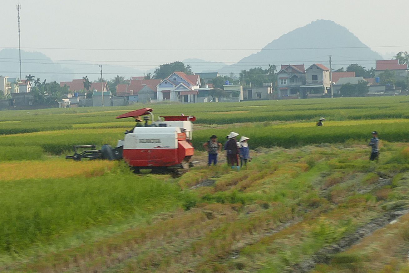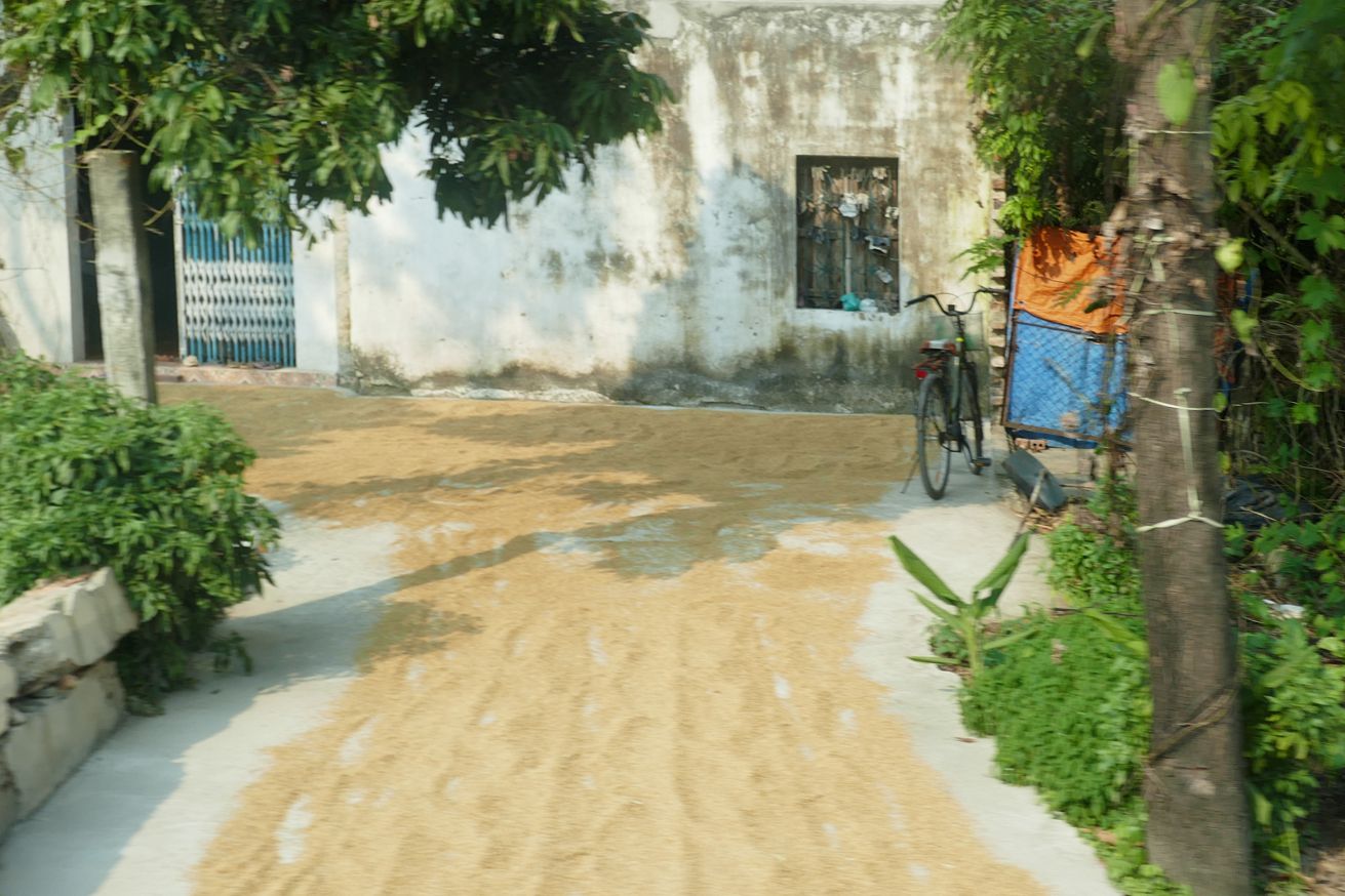 Entlang der Fahrtstrecke wird auf den Reisfeldern geerntet. In den Reisfeldern sieht man immer wieder Gräber – die Toten werden auf Grabstellen auf den Feldern bestattet. In dieser Region ist Erntezeit, geerntet wird hier zwei Mal jährlich. Einige Bauern schneiden die Büschel noch von Hand, auf anderen Feldern sehen wir Mähdrescher. Auf einigen Feldern wird schon das Stroh abgefackelt und die Fläche für den nächsten Anbau vorbereitet. Auf Nebenstraßen und Hauseinfahrten wird Reis getrocknet; großflächig sind die Reiskörner ausgebreitet, mitten auf den Flächen stehen oft Frauen, die mit großen Besen die Körner wenden.