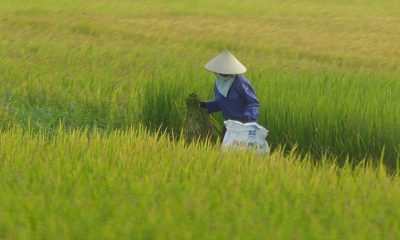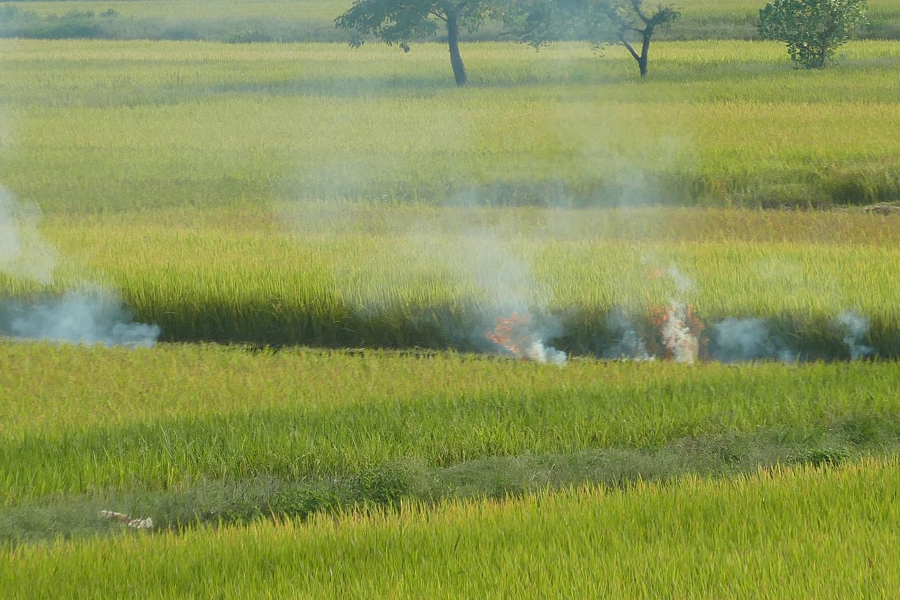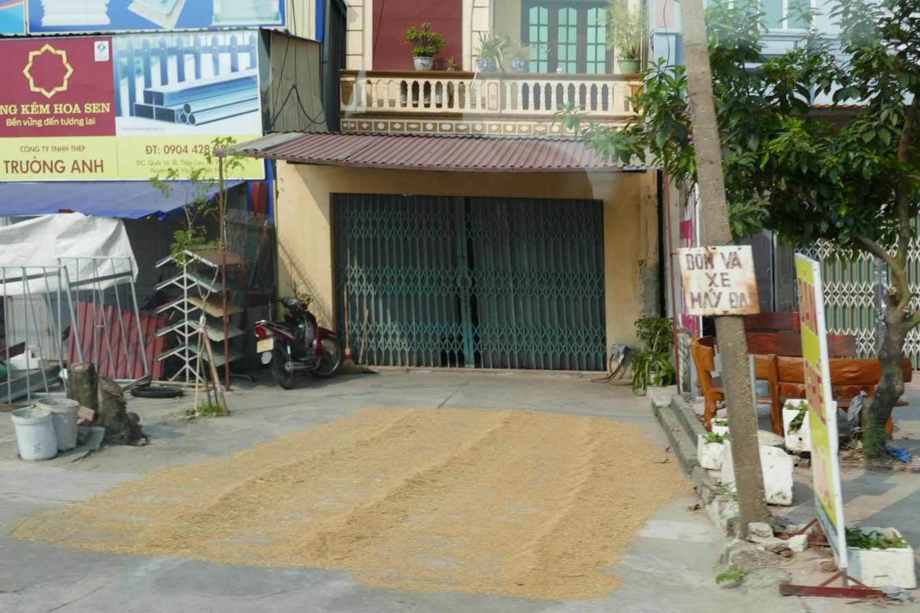 Entlang der Fahrtstrecke wird auf den Reisfeldern geerntet. In den Reisfeldern sieht man immer wieder Gräber – die Toten werden auf Grabstellen auf den Feldern bestattet. In dieser Region ist Erntezeit, geerntet wird hier zwei Mal jährlich. Einige Bauern schneiden die Büschel noch von Hand, auf anderen Feldern sehen wir Mähdrescher. Auf einigen Feldern wird schon das Stroh abgefackelt und die Fläche für den nächsten Anbau vorbereitet. Auf Nebenstraßen und Hauseinfahrten wird Reis getrocknet; großflächig sind die Reiskörner ausgebreitet, mitten auf den Flächen stehen oft Frauen, die mit großen Besen die Körner wenden.