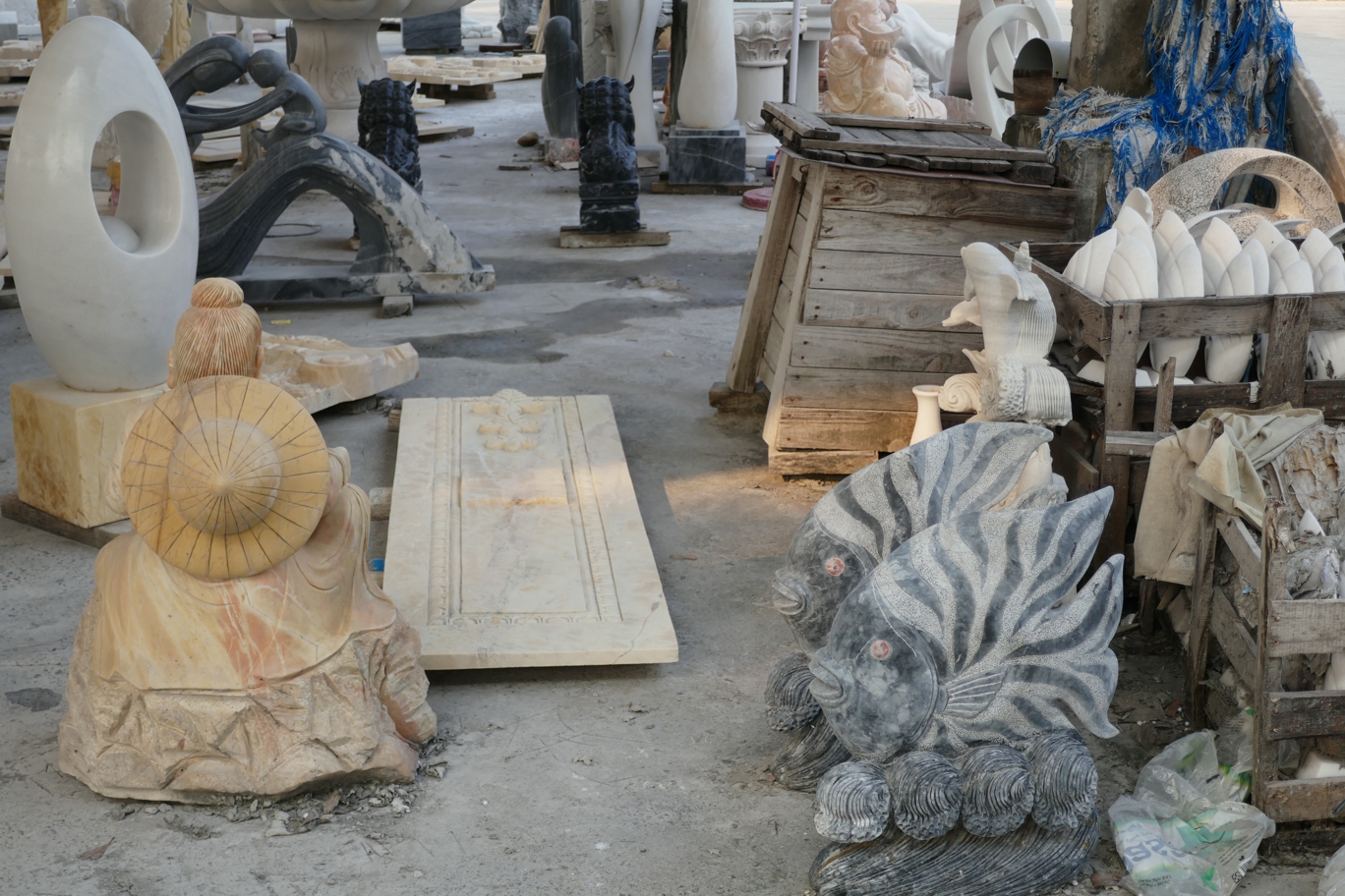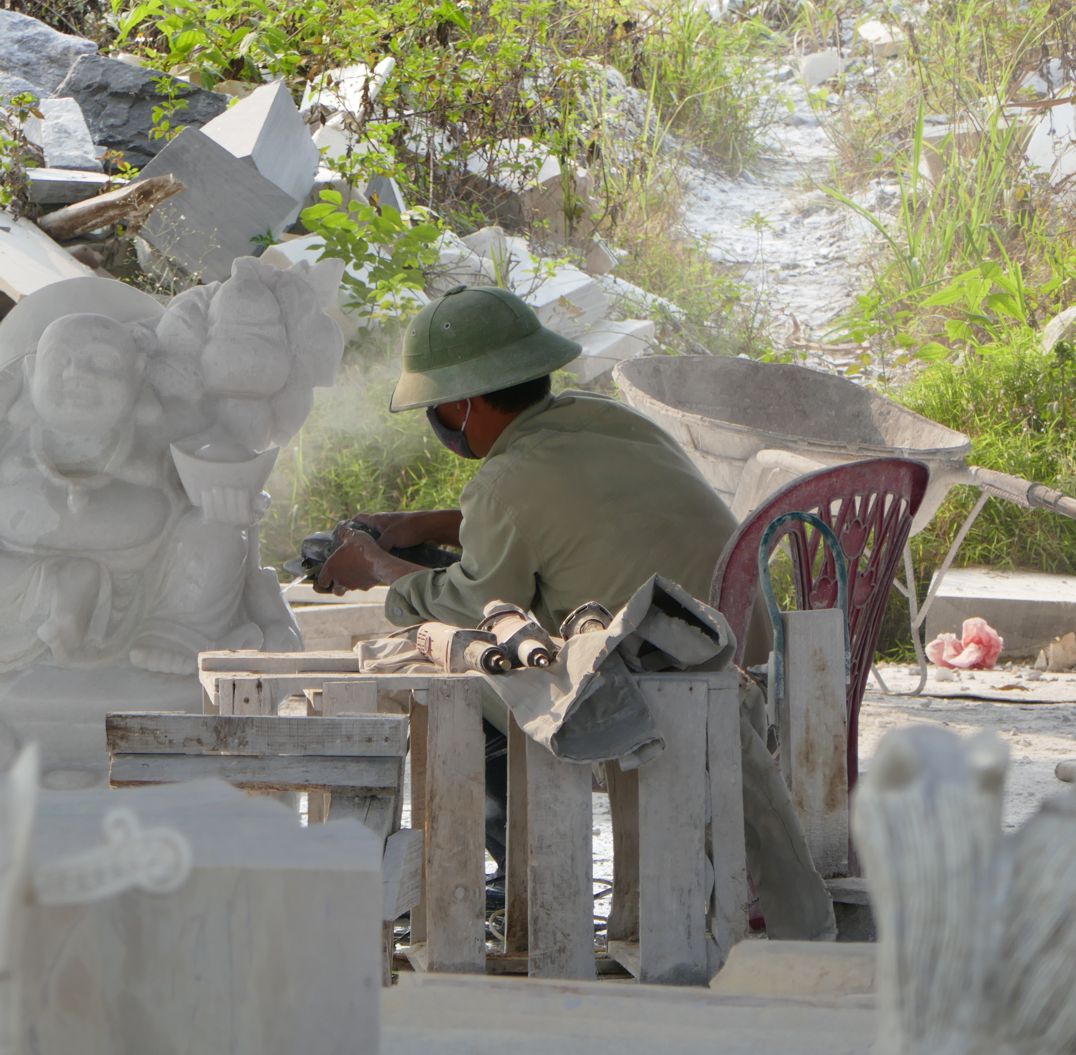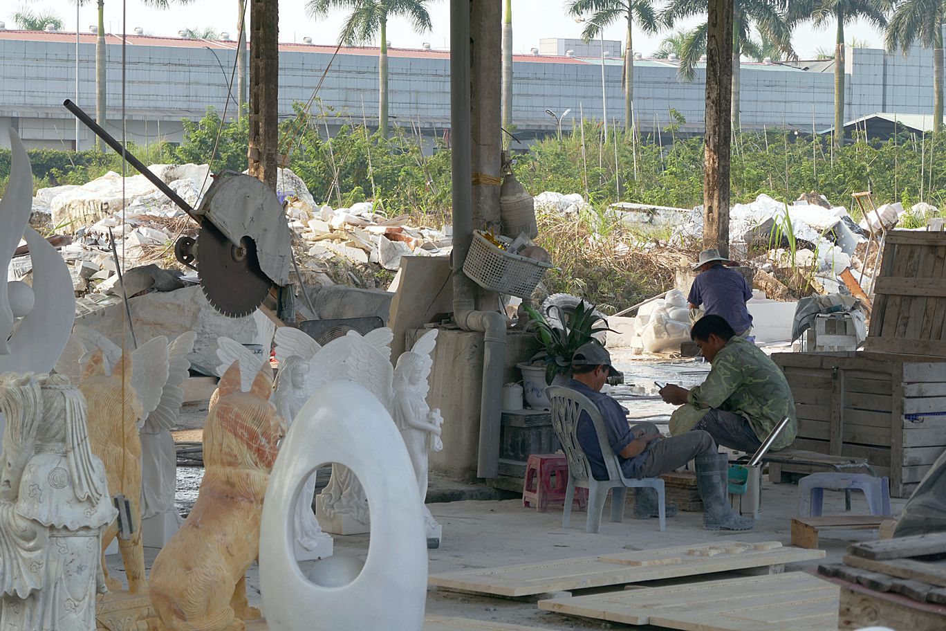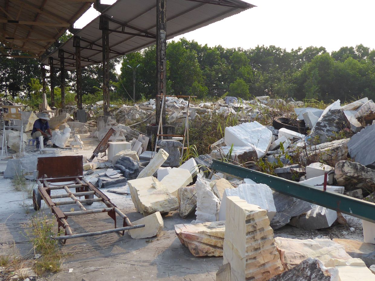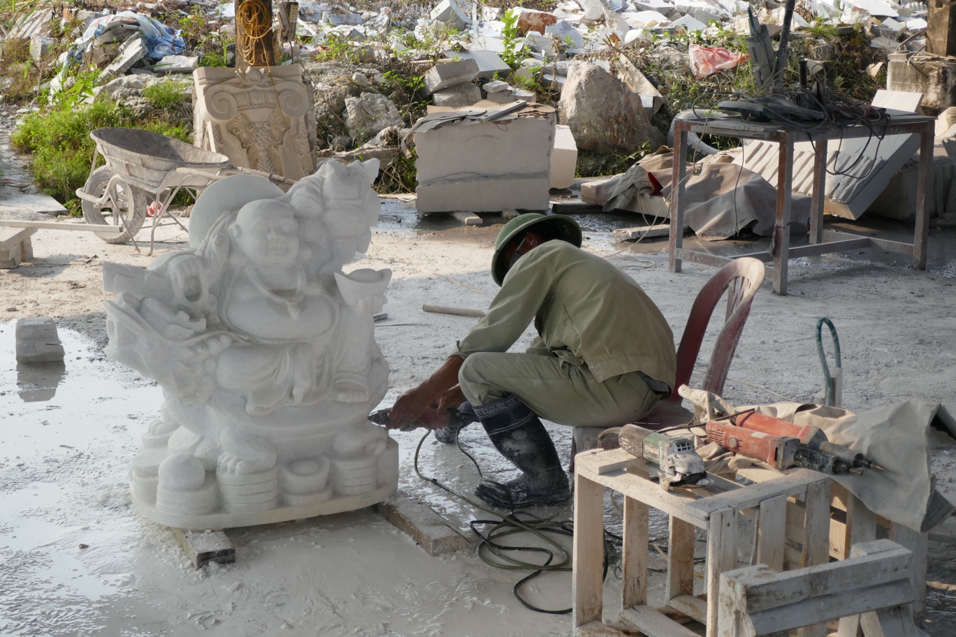 Auf unserer Fahrt zur Halong Bucht gibt es einen Zwischenstopp, bei einer Steinmetz-Werkstatt. Unser Reiseleiter meint, das sei die einzige Möglichkeit an der Strecke, einen Halt einzulegen und dabei auch etwas anzuschauen; außerdem sei es eine der wenigen Einrichtungen, in denen auch Behinderte mitarbeiten würden. Die Werkstatt zeigt sich schon im Außenbereich als kleine Produktionsstätte mit riesiger Verkaufsausstellung.