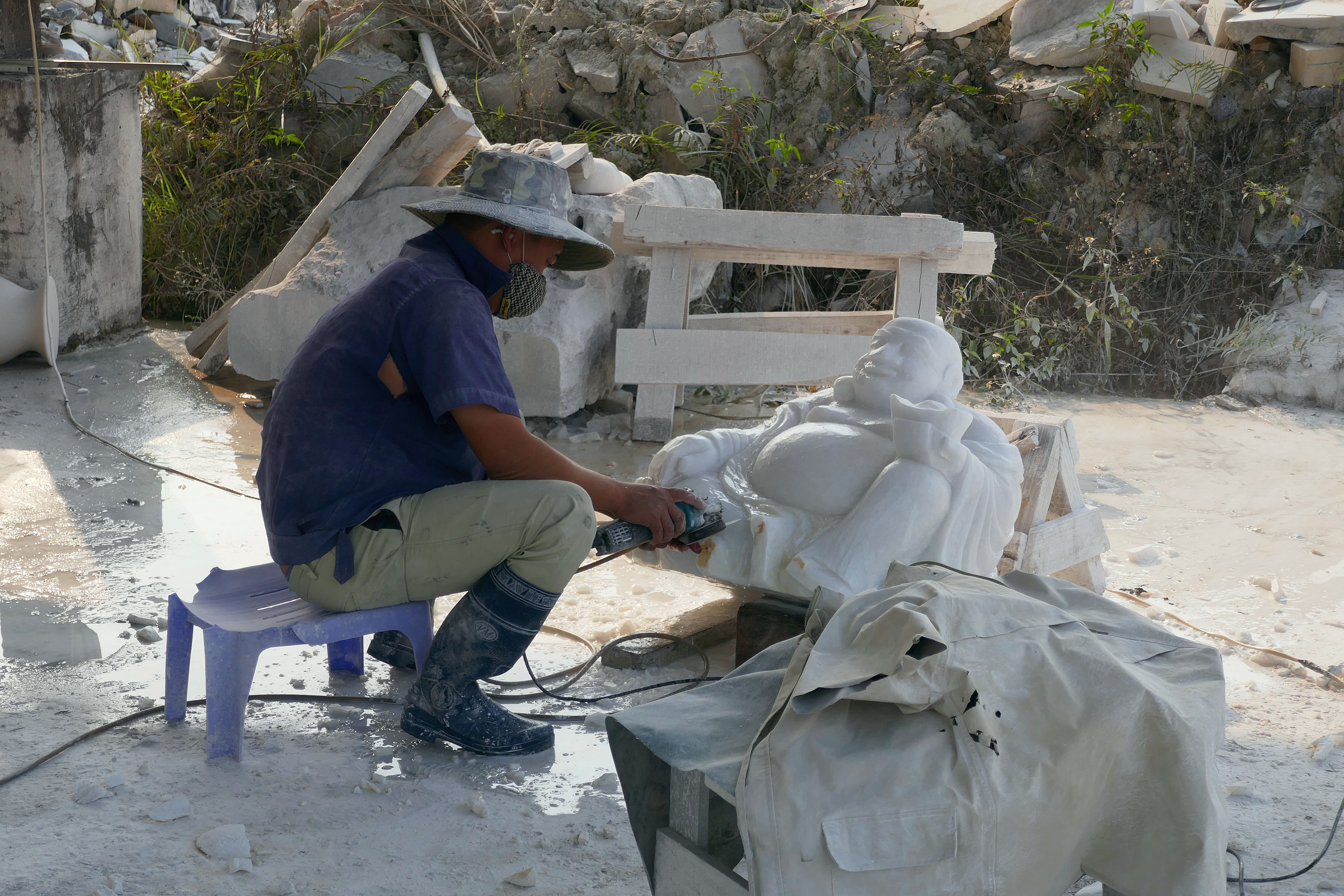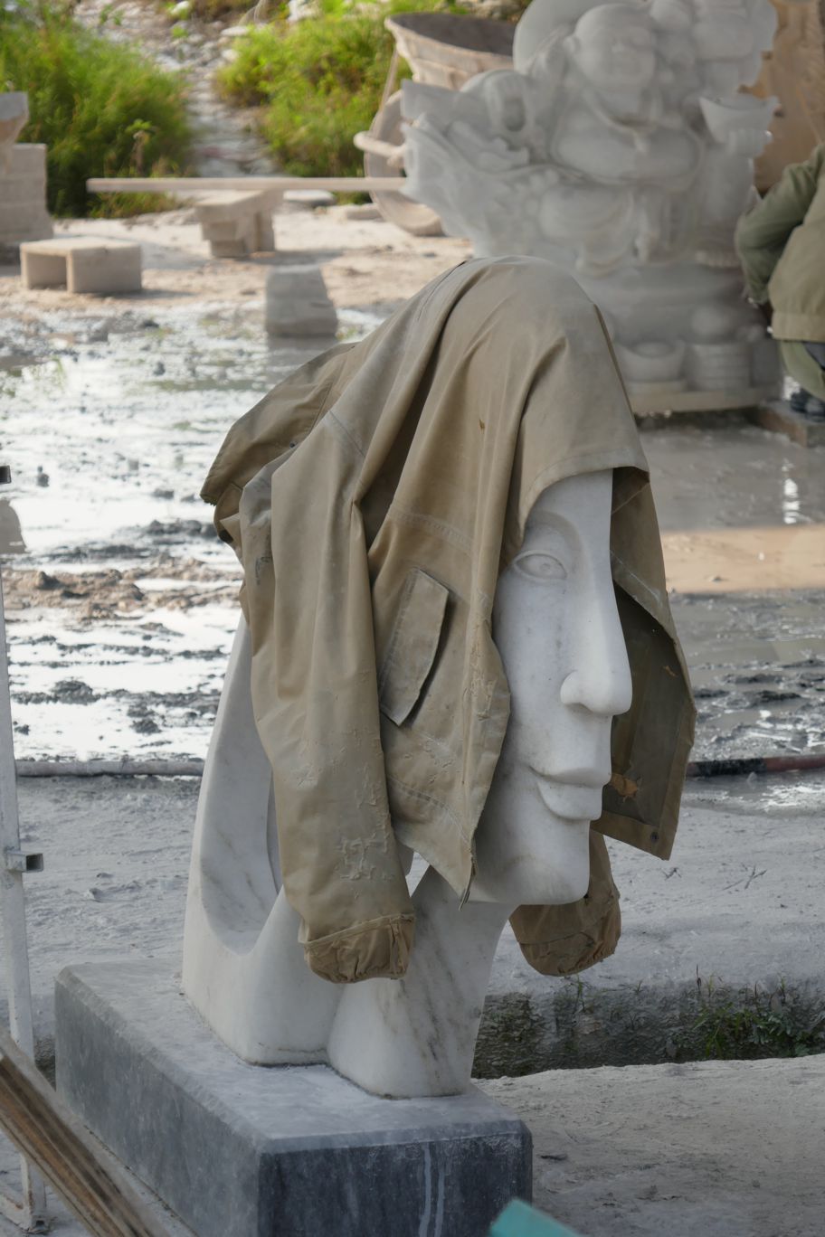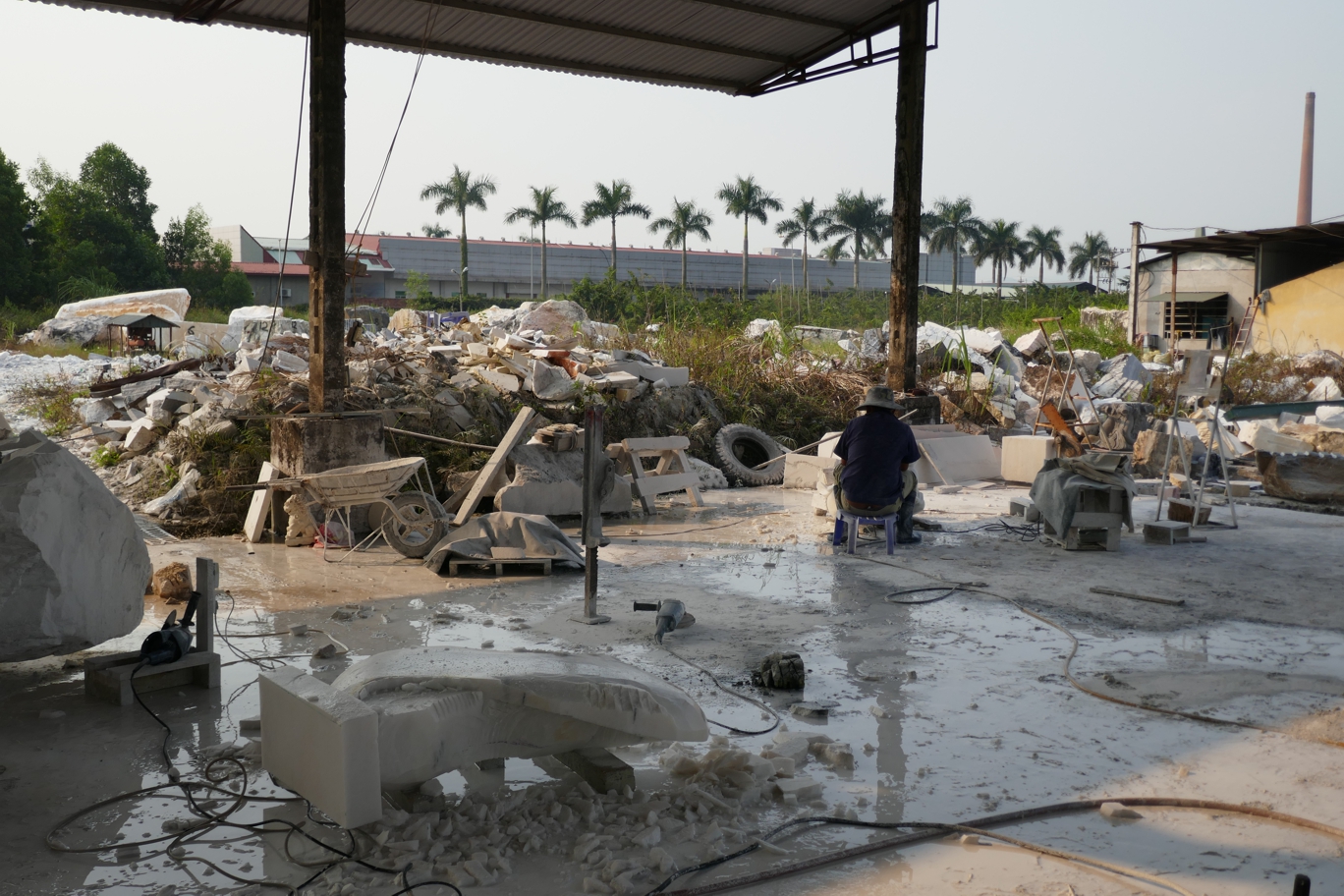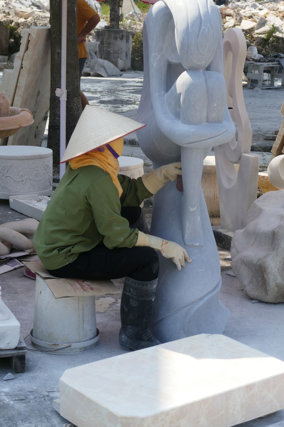 Auf unserer Fahrt zur Halong Bucht gibt es einen Zwischenstopp, bei einer Steinmetz-Werkstatt. Unser Reiseleiter meint, das sei die einzige Möglichkeit an der Strecke, einen Halt einzulegen und dabei auch etwas anzuschauen; außerdem sei es eine der wenigen Einrichtungen, in denen auch Behinderte mitarbeiten würden. Die Werkstatt zeigt sich schon im Außenbereich als kleine Produktionsstätte mit riesiger Verkaufsausstellung.