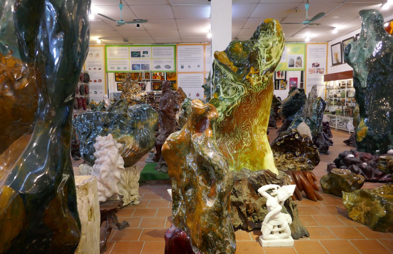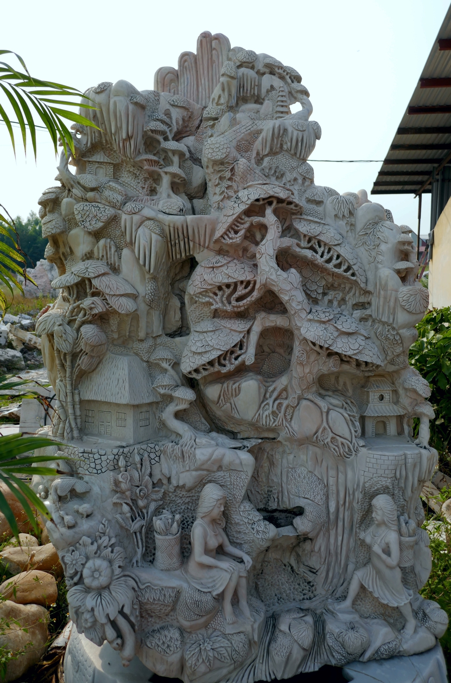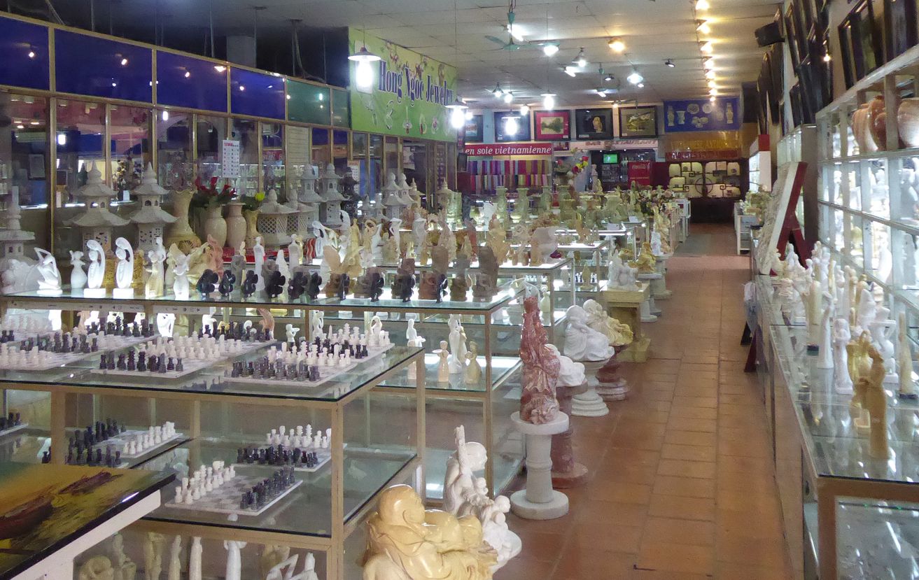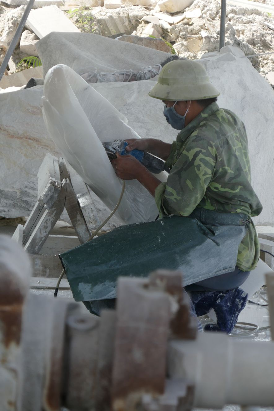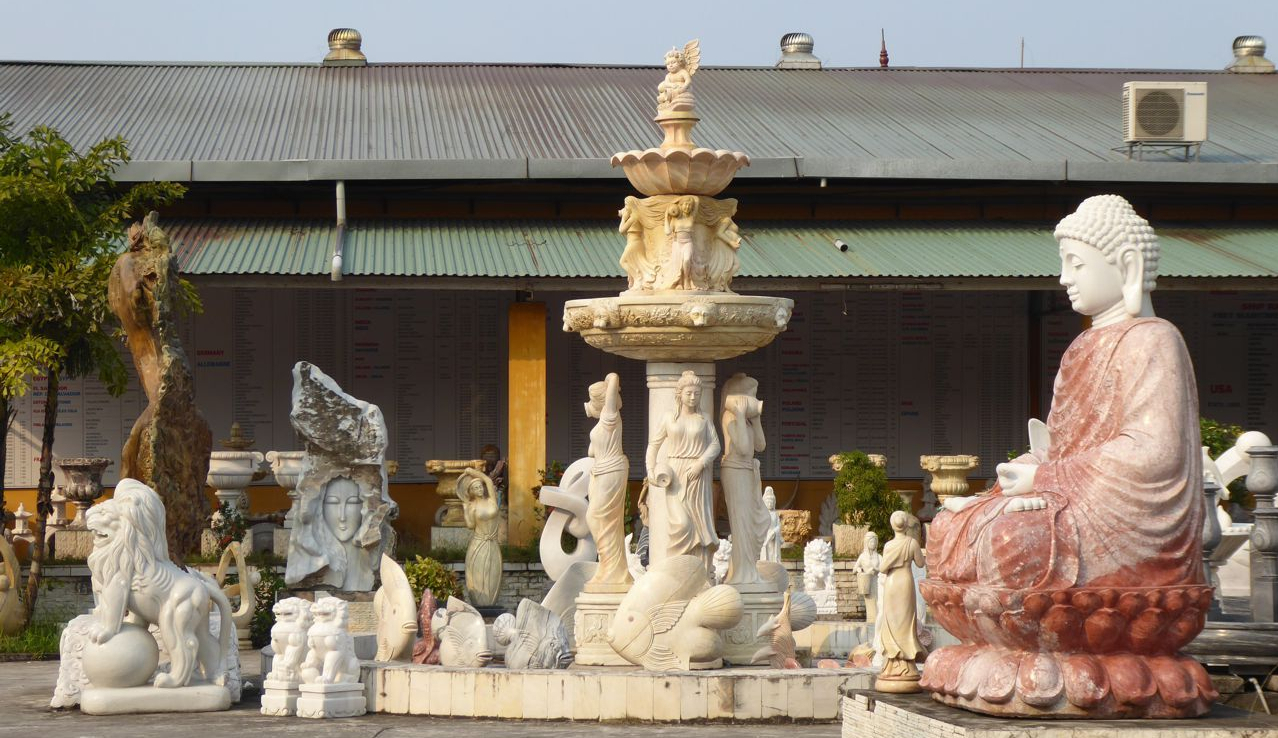 Auf unserer Fahrt zur Halong Bucht gibt es einen Zwischenstopp, bei einer Steinmetz-Werkstatt. Unser Reiseleiter meint, das sei die einzige Möglichkeit an der Strecke, einen Halt einzulegen und dabei auch etwas anzuschauen; außerdem sei es eine der wenigen Einrichtungen, in denen auch Behinderte mitarbeiten würden. Die Werkstatt zeigt sich schon im Außenbereich als kleine Produktionsstätte mit riesiger Verkaufsausstellung.