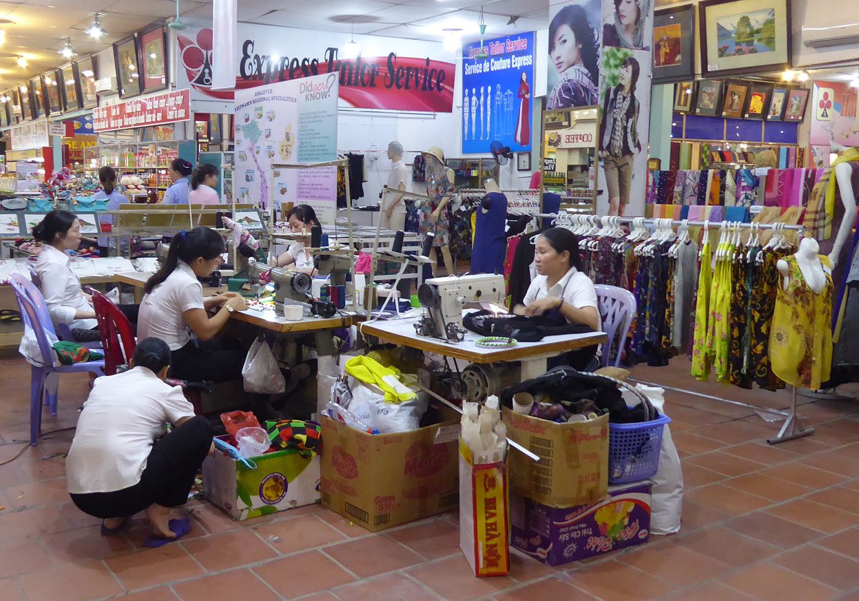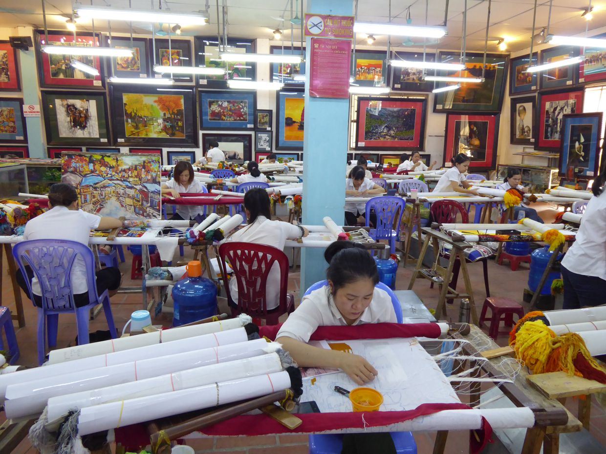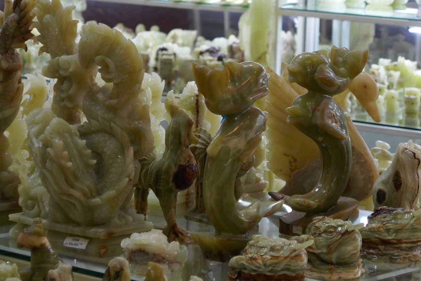 In der mehrere hundert Quadratmeter großen Halle mit unüberschaubarer Verkaufsfläche werden kleinere Arbeiten angeboten, mehr dasjenige, was sicherlich oft als Souvenir in die Koffer wandert, ob Figuren, Formen oder ein Schachspiel. Zwischen all den Verkaufsständen wird aber tatsächlich auch einiges produziert. Einige junge Frauen malen an Lackbildern, andere sind dabei, nach Vorlagemotiven Bilder zu sticken, in einem anderen Bereich der Halle wird genäht. All das ist zu kaufen – dazu noch allerhand weiteres, ob aus Jade oder Gold oder Stoff oder Edelsteinen.
