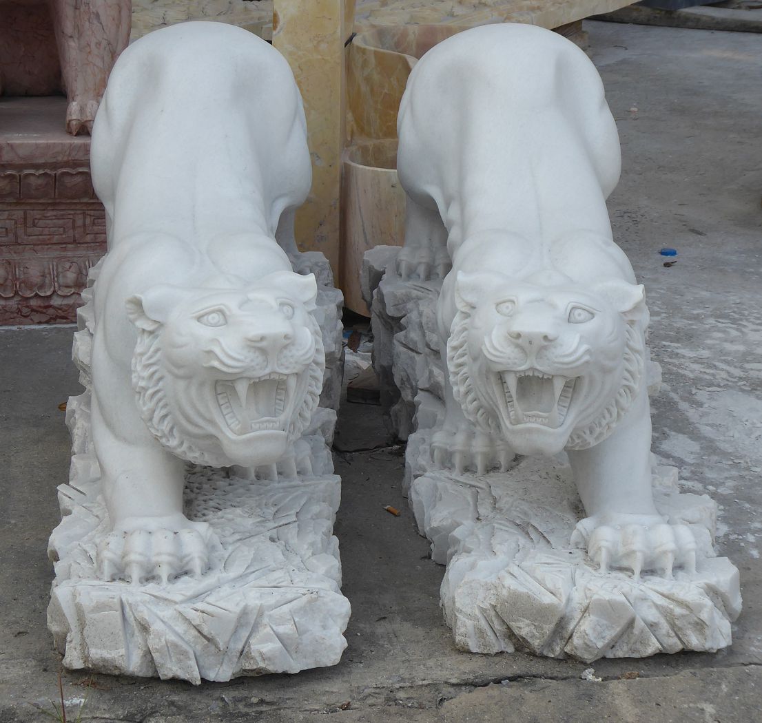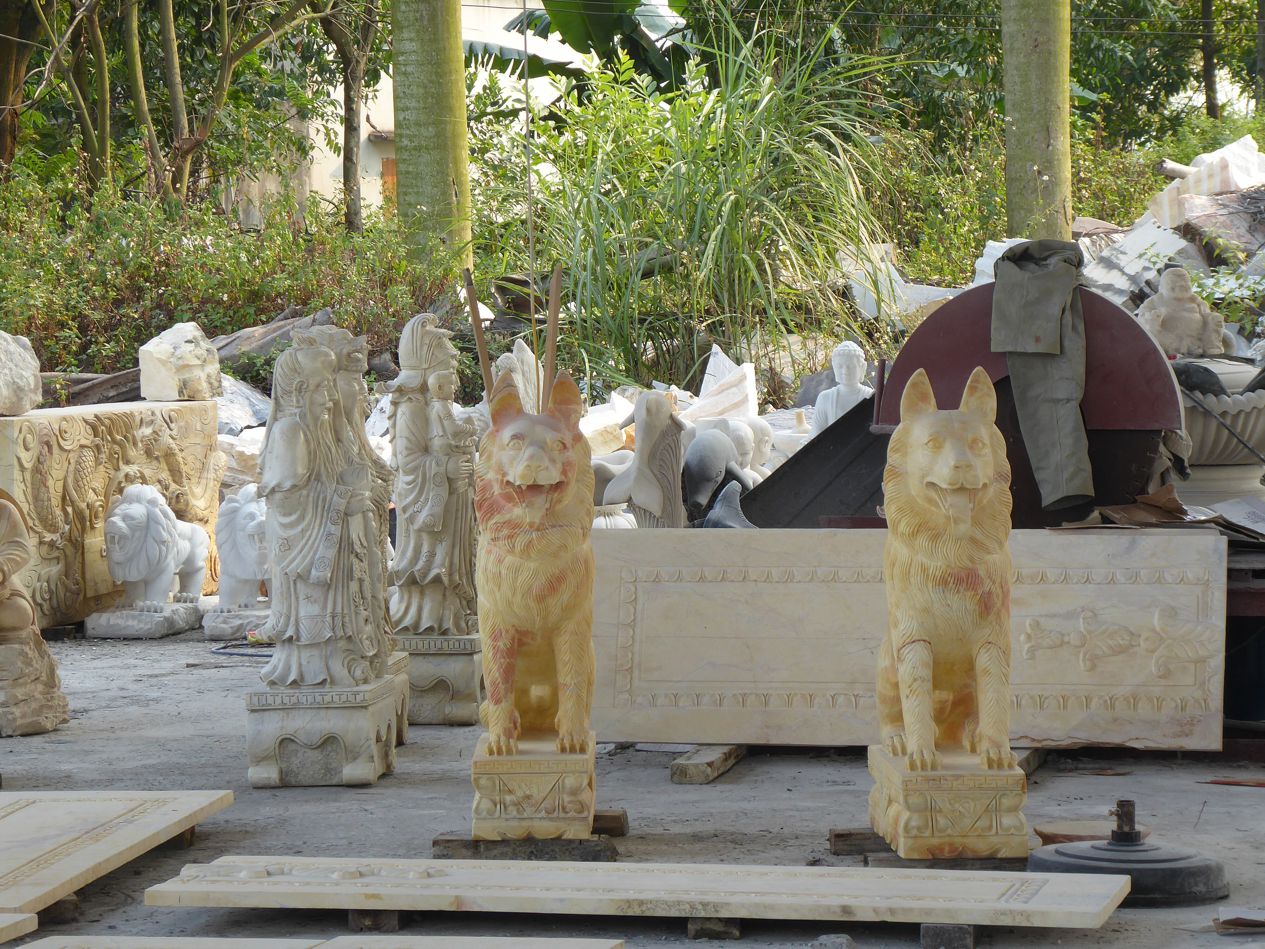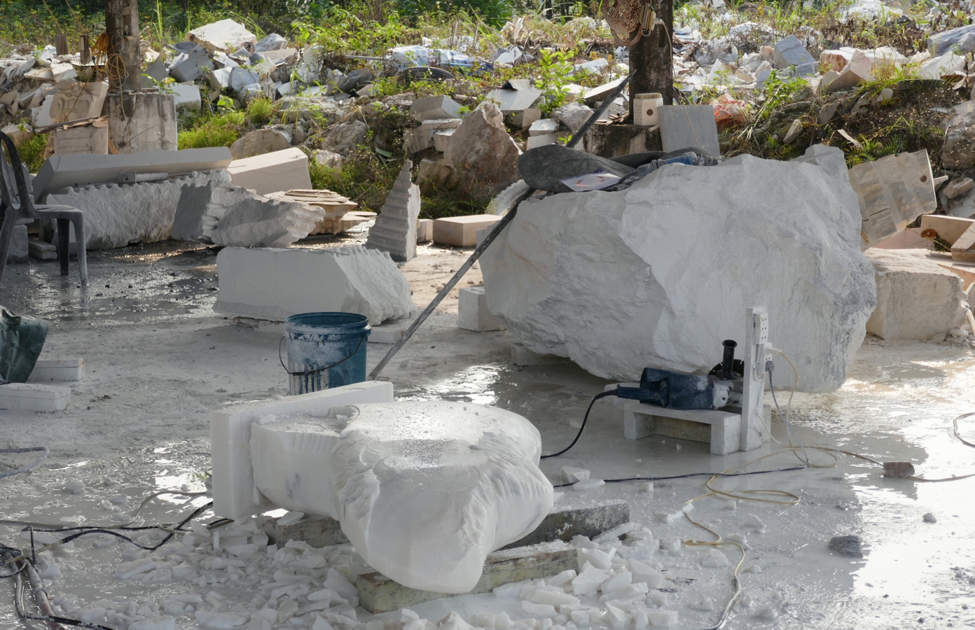 Tatsächlich wird draußen auf einem Gelände neben der Ausstellung an Steinblöcken gehämmert, gebohrt und geschliffen. All das, was hier in der Werkstatt entsteht, scheint für den Export in alle Welt geschaffen zu werden, produziert für den Bedarf aller erdenklichen Religionen oder für den privaten Bedarf, ob Hauslöwen, Dekofisch oder Portrait.