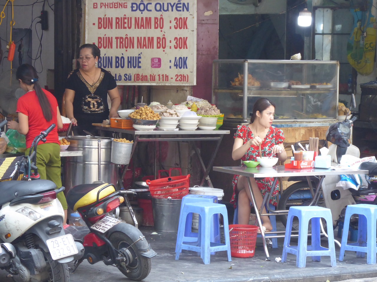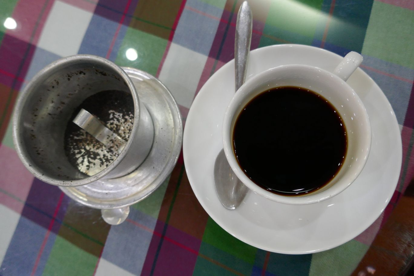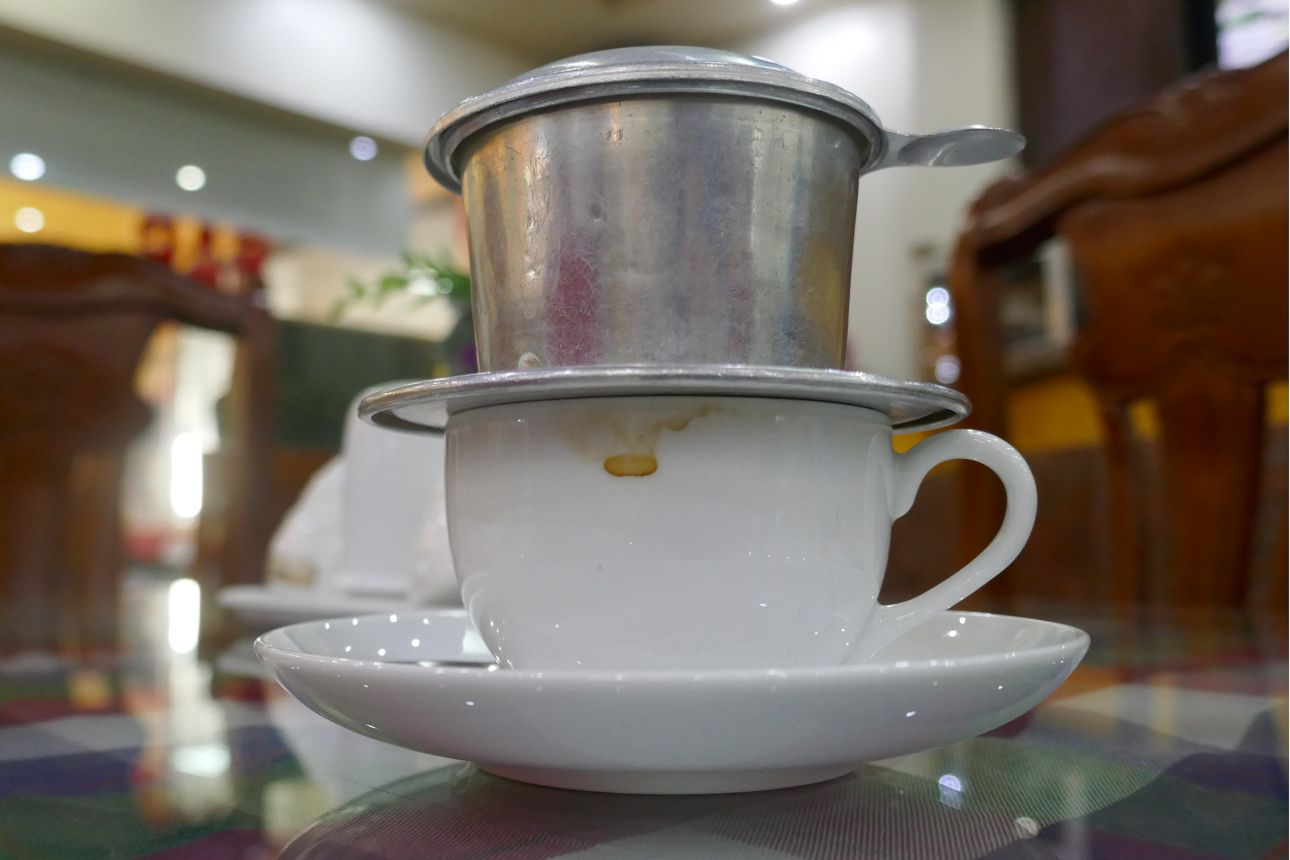 Wir trinken lieber einen vietnamesischen Kaffee. Auf der Tasse sitzt ein Blechsieb mit dem Pulver drin, in der Tasse ist schon schwer gezuckerte Dosenmilch. Heißes Wasser drauf, warten. Schmeckt nicht unbedingt begeisternd, weil klebrig süß – muss man aber einmal probiert haben, weil das dazu gehört. Ohne Dosenmilch schmeckt der Kaffee ungewöhnlich aber gut – ungewöhnlich, weil in Vietnam die Kaffeebohnen nicht einfach trocken wie bei uns geröstet werden, sondern unter Zugabe kleiner Mengen Öl.