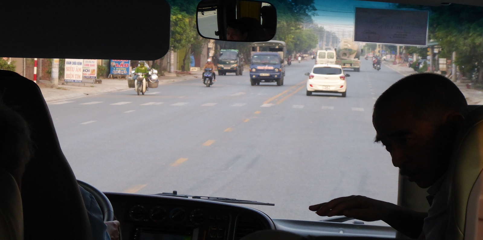 Die Fahrt geht weiter. Wir schauen uns wieder die Landschaft an und bekommen viele weitere Informationen über Vietnam. Einiges haben wir schon gehört zu Themen wie Tourismus, Wirtschaft und Bildungsssystem. Im Bus gibt uns unser vietnamesischer Reiseleiter gerne Auskunft zu unseren weiteren Fragen.