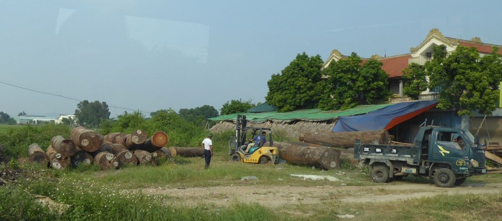 Die Hauptstraße zeigt sich bereits sehr geschäftig. Es wird allerhand auf ziemlich alten Lastwagen transportiert. Entlang der Straße sind einige Holzhändler zu sehen, bei denen riesige Baumstämme liegen oder verladen werden; anscheinend wird immer noch kräftig Tropenholz geschlagen.