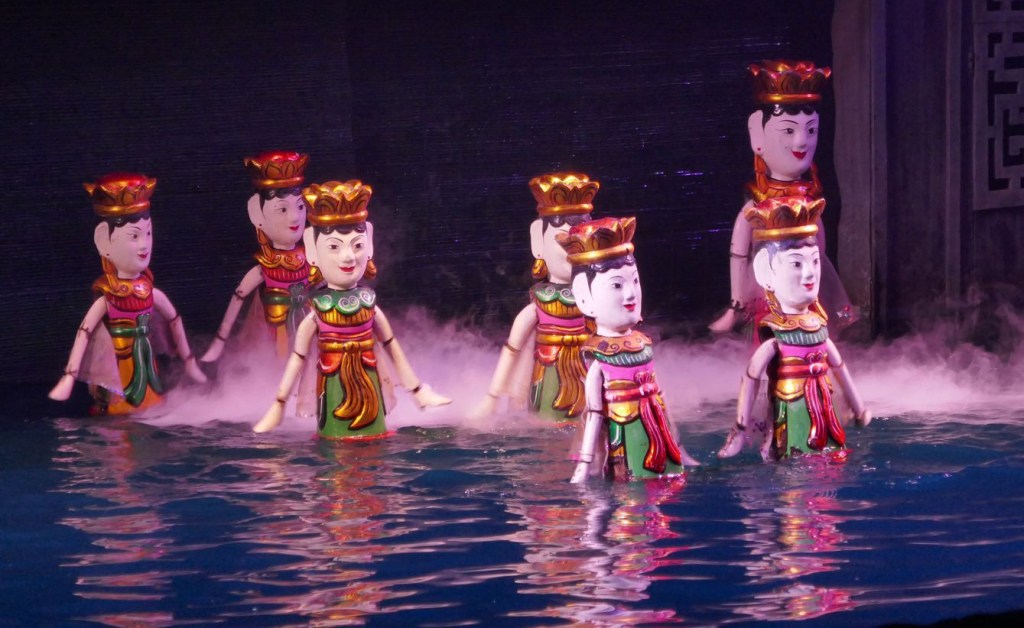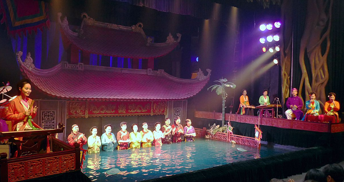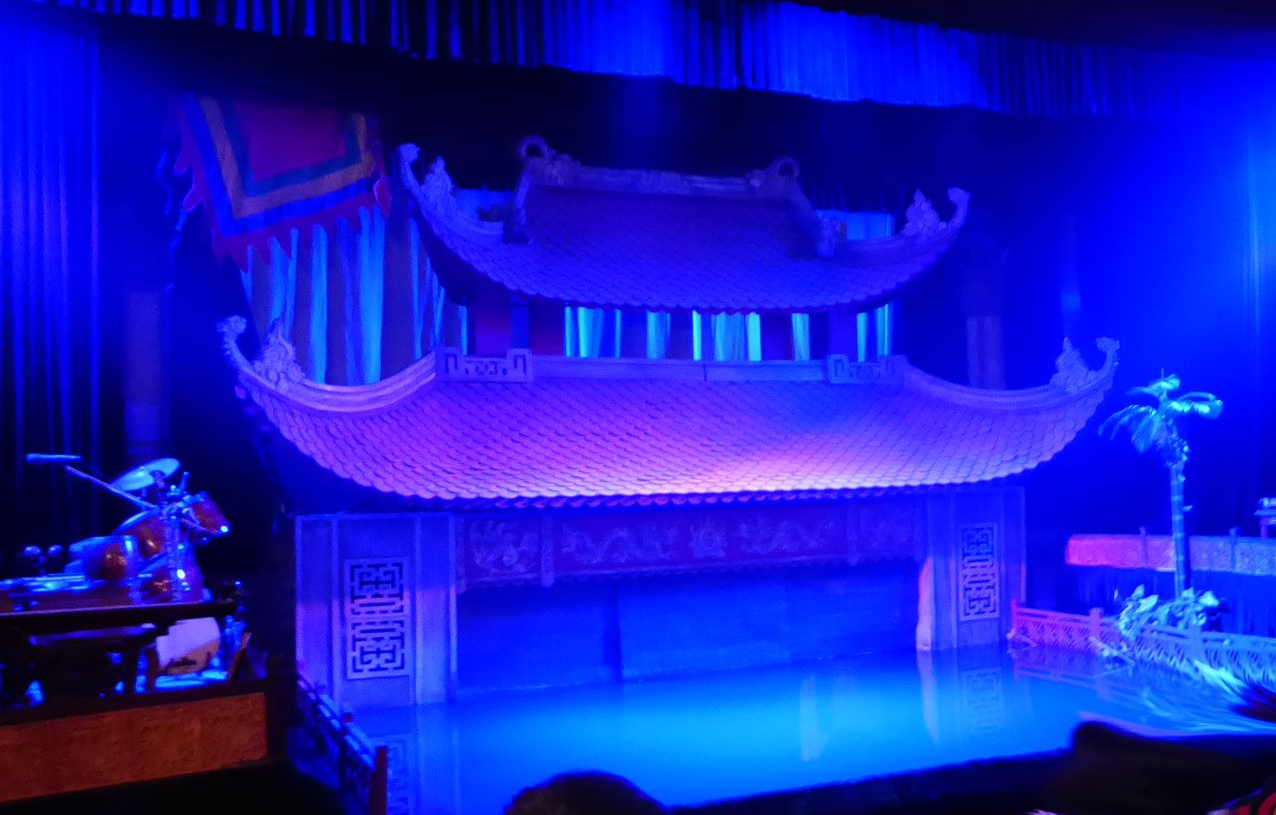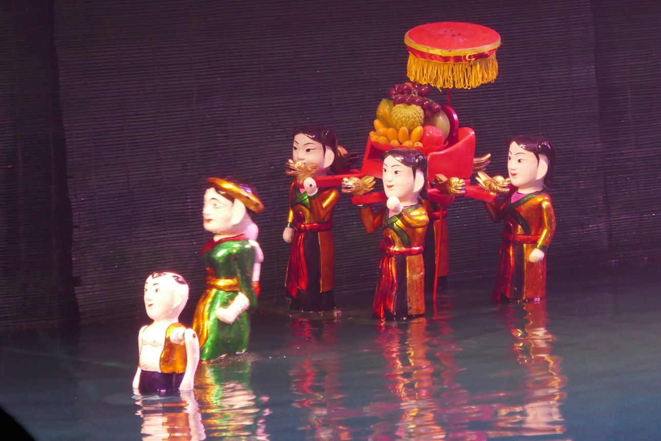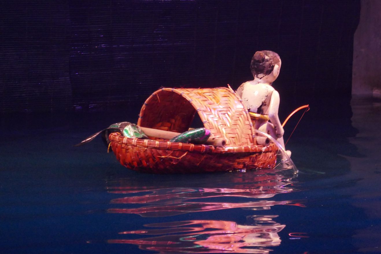 Zur Einstimmung spielt das Orchester. Eine Sprecherin stellt die Akteure vor, die Sprache in seltsam überzogenen hohen Tönen, alles wohlklingend, nicht sonderlich laut, aber sehr fremd anmutend. Es geht los mit dem Wasserpuppentheater – geboten wird kein langes Stück, es sind vielmehr viele kleine Episoden über Alltag und Legenden. Gespielt wird mit einer Art Stabfigurenpuppen in einem Wasserbecken; die Puppen werden unter Wasser mit langen Bambusstangen geführt. Die Spielerinnen und Spieler stehen hinter einem Vorhang, bis zu den Hüften im Wasser.