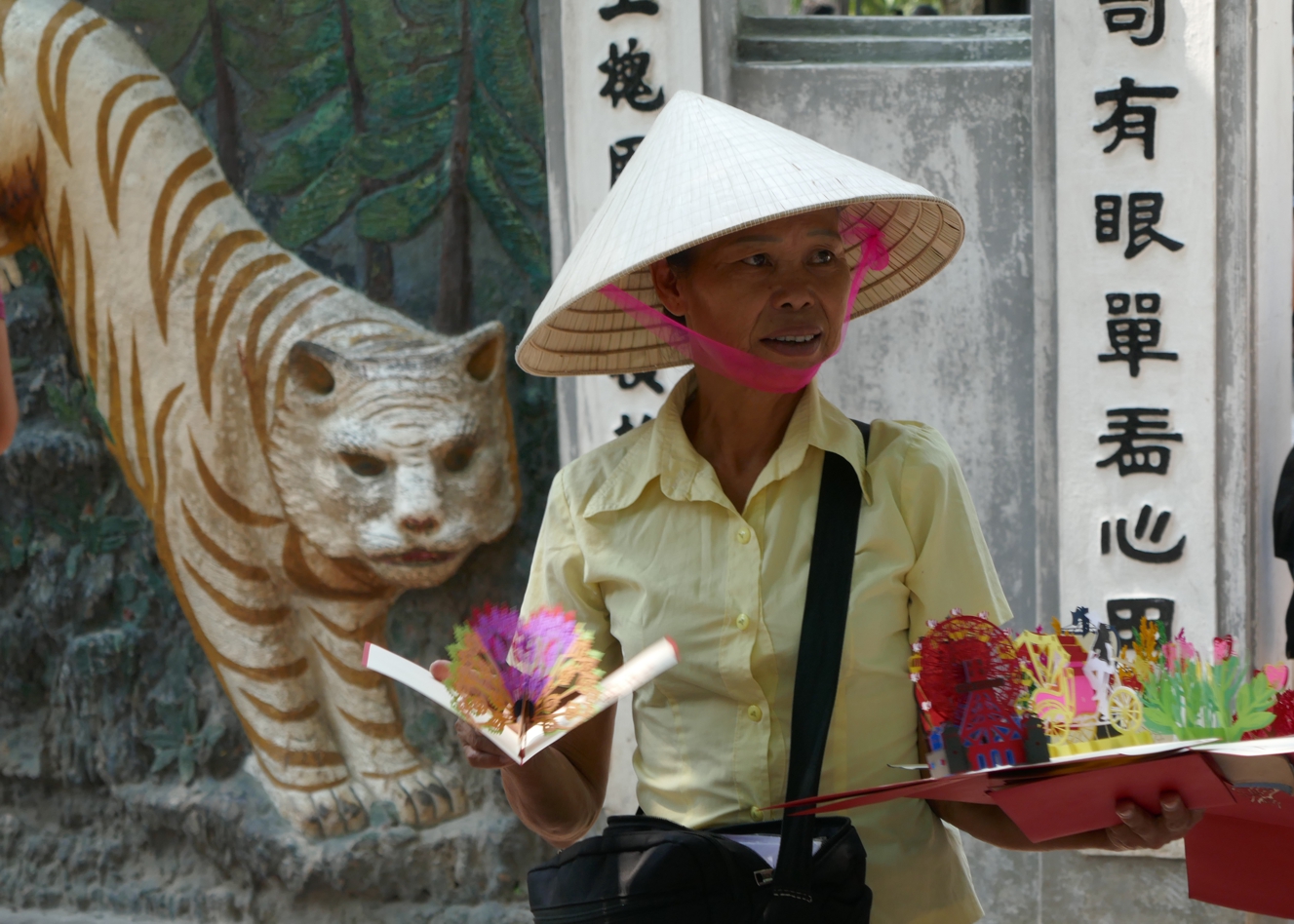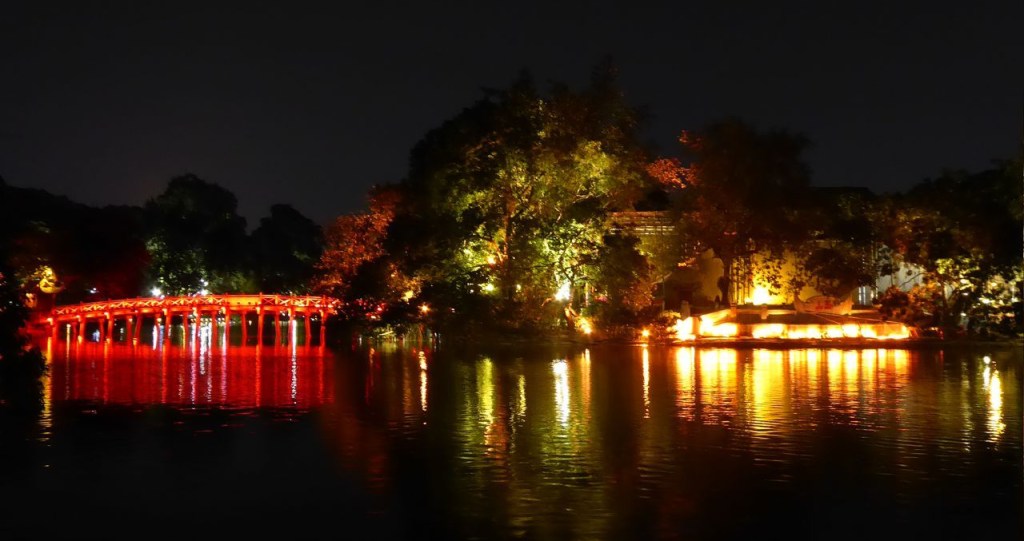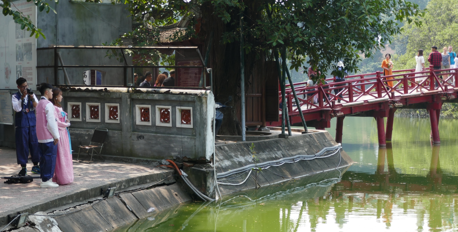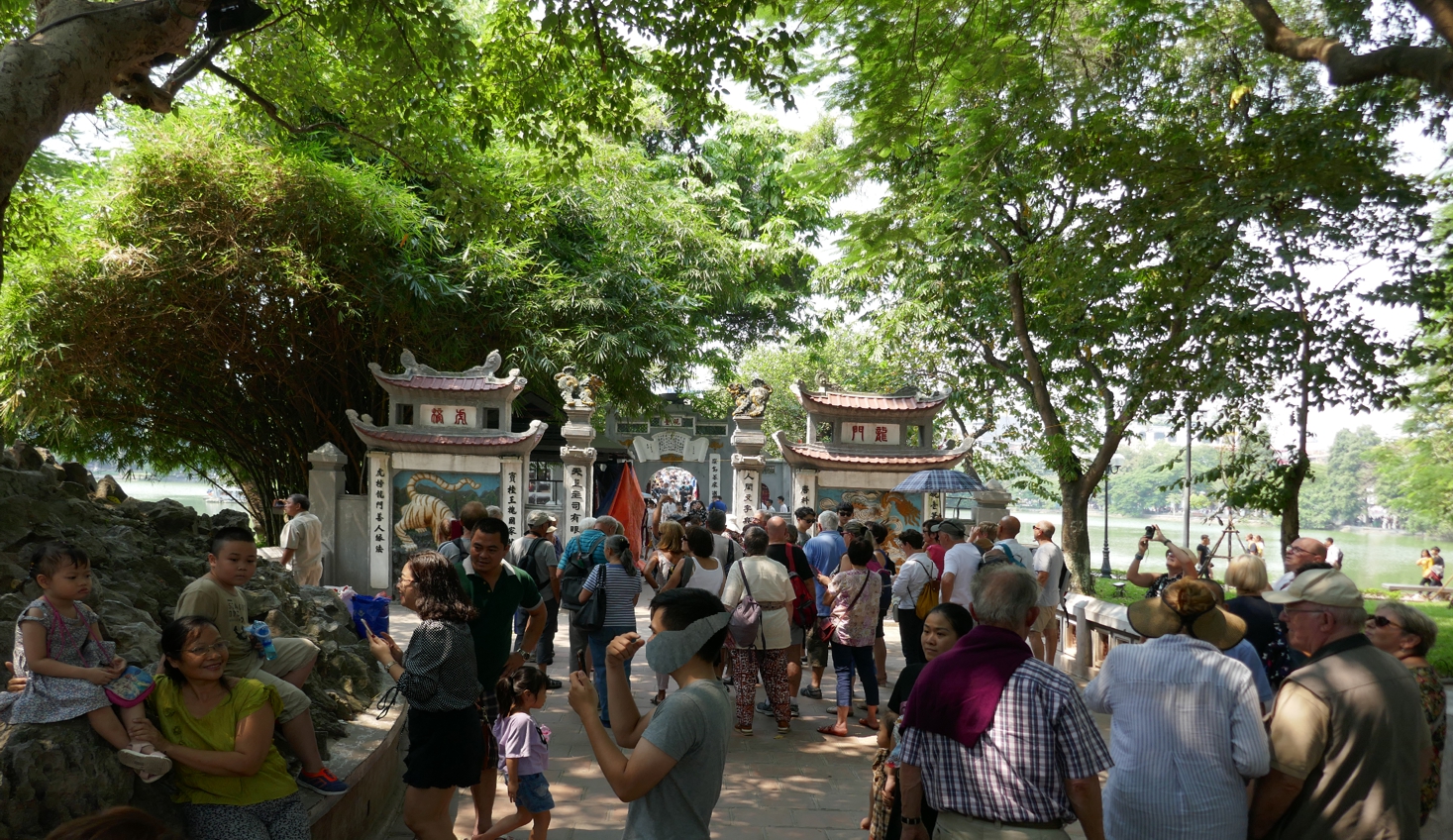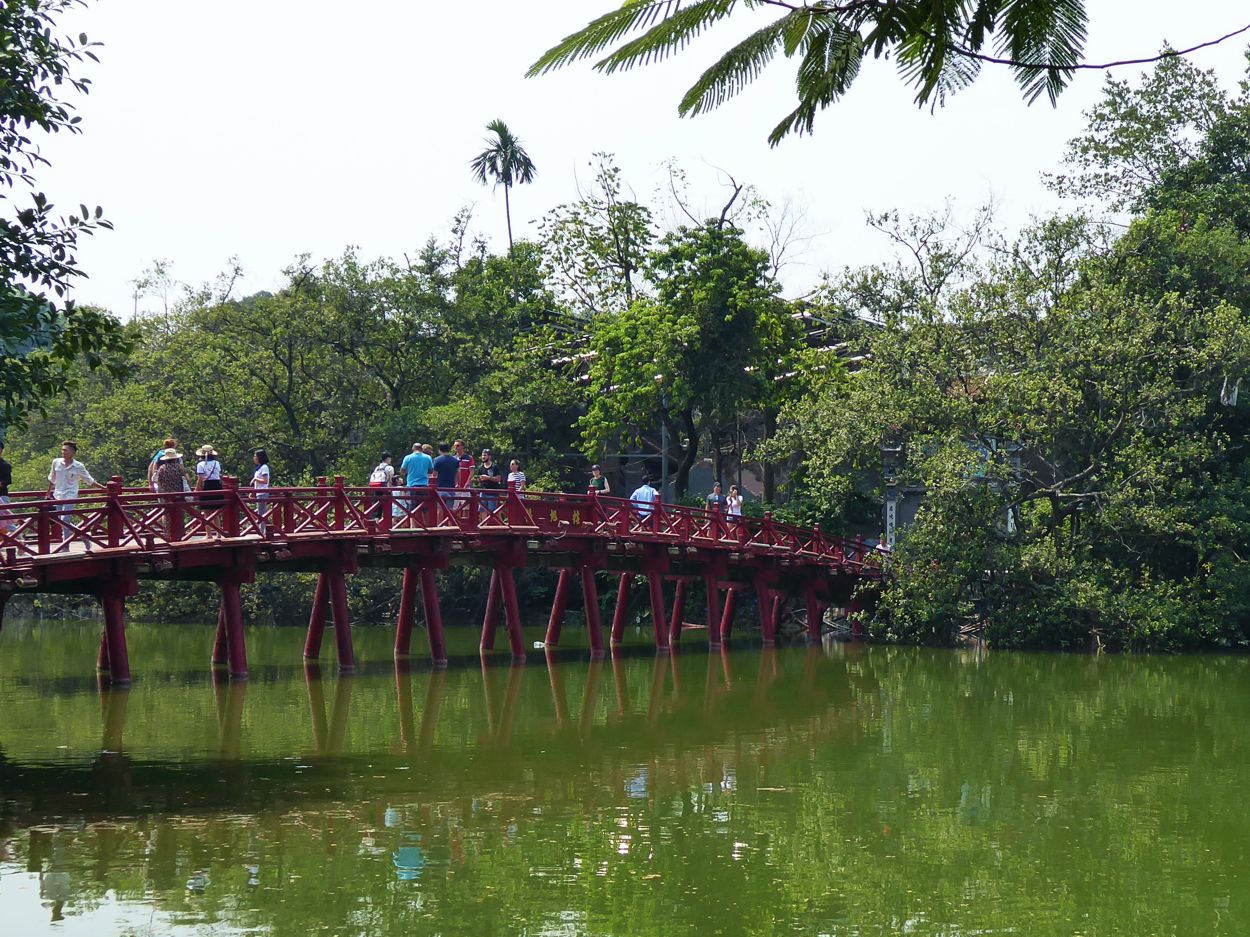 Die erste Sehenswürdigkeit, die wir besichtigen, befindet sich mitten in der Stadt, und diese ist höchst beliebt – der Hoan Chiem See samt einer kleinen Insel. Hier liegt der Jadebergtempel Ngoc Son, zu dem eine geschwungene rote Brücke „The Huc“ führt.