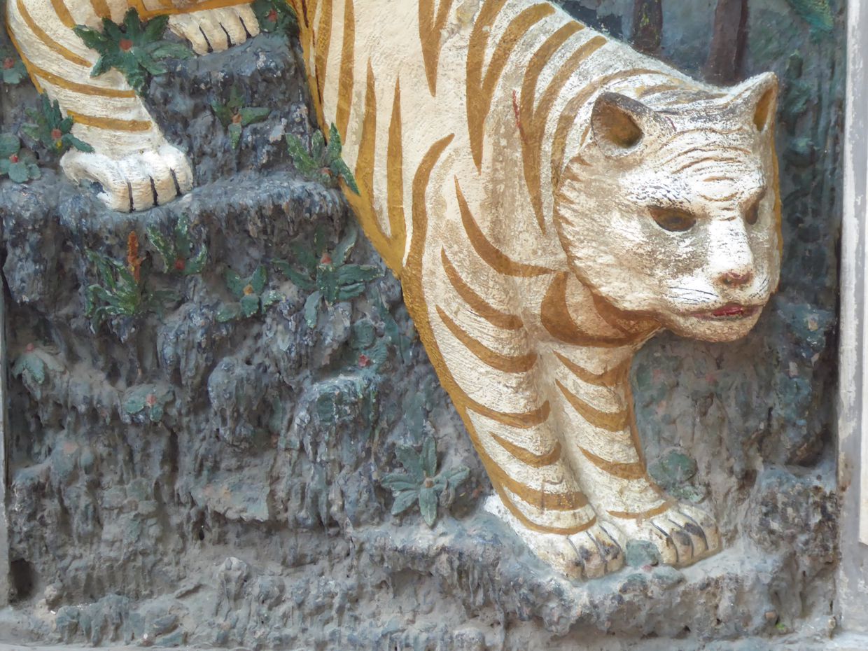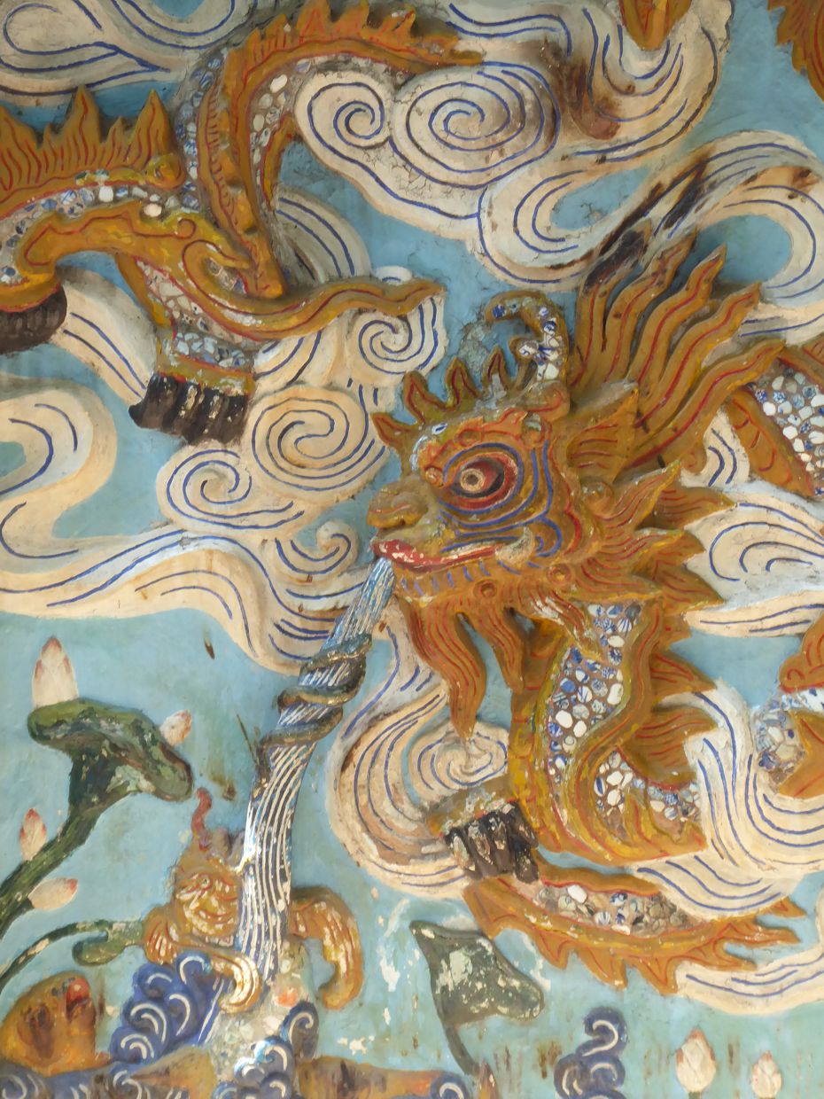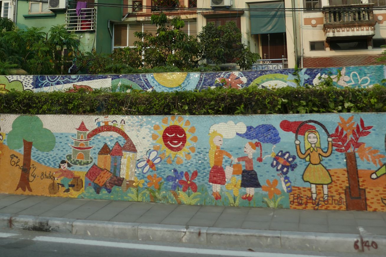 Entlang der Einfahrtsstraße in die Stadt begleitet uns wieder die etwa 4 Kilometer die relativ hohe Abgrenzungs- und Stützmauer, komplett verziert mit Mosaiken, die Motive immer nach ein paar hundert Metern wechselnd, typische Landschaften, Blumen, Ornamente, Fische, Alltagsszenen.