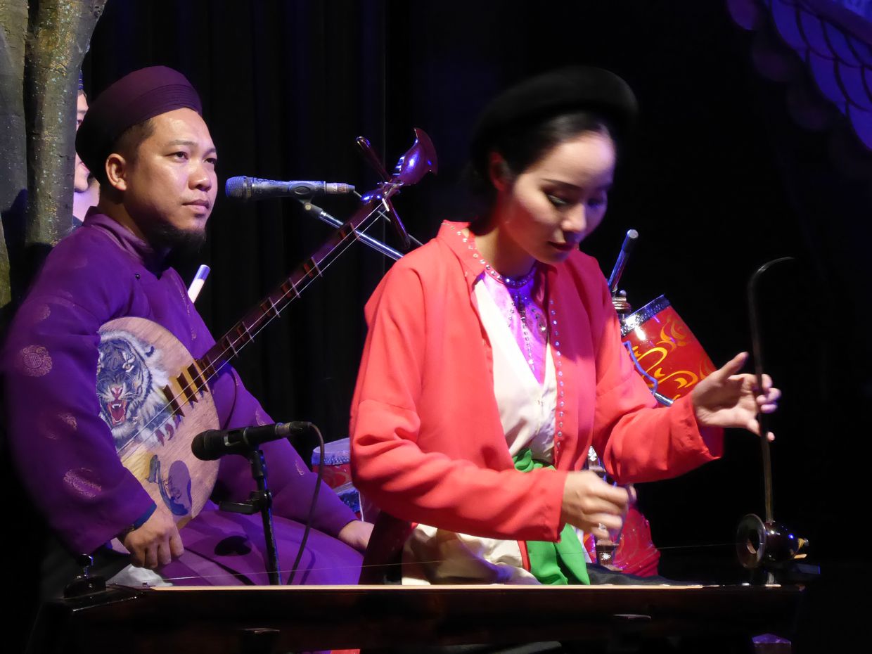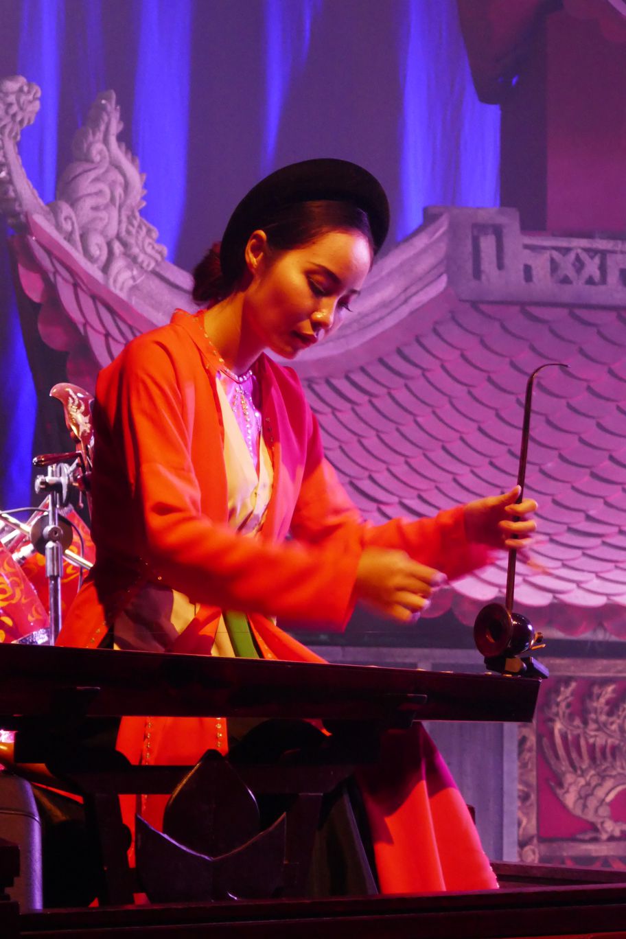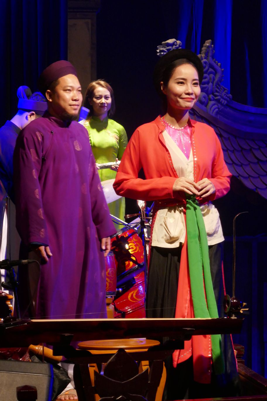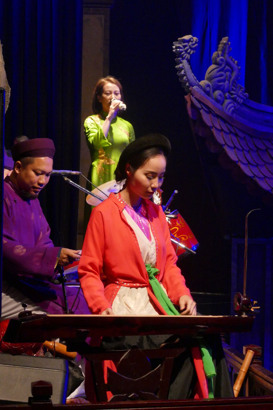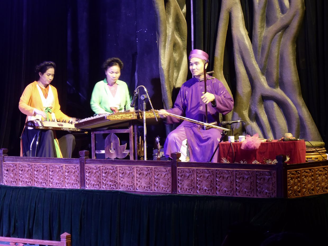 Dann der Auftritt des Orchesters. Attraktive Damen, hübsch ausstaffiert mit aufwändigen Zopffrisuren und bunten vietnamesischen Kleidern, gehen zu den Instrumenten, ebenso einige Herren, auch prächtig gekleidet. Die Instrumente, die sie einstimmen, sehen bis auf die Schlaginstrumente doch sehr fremdartig aus und klingen auch so.