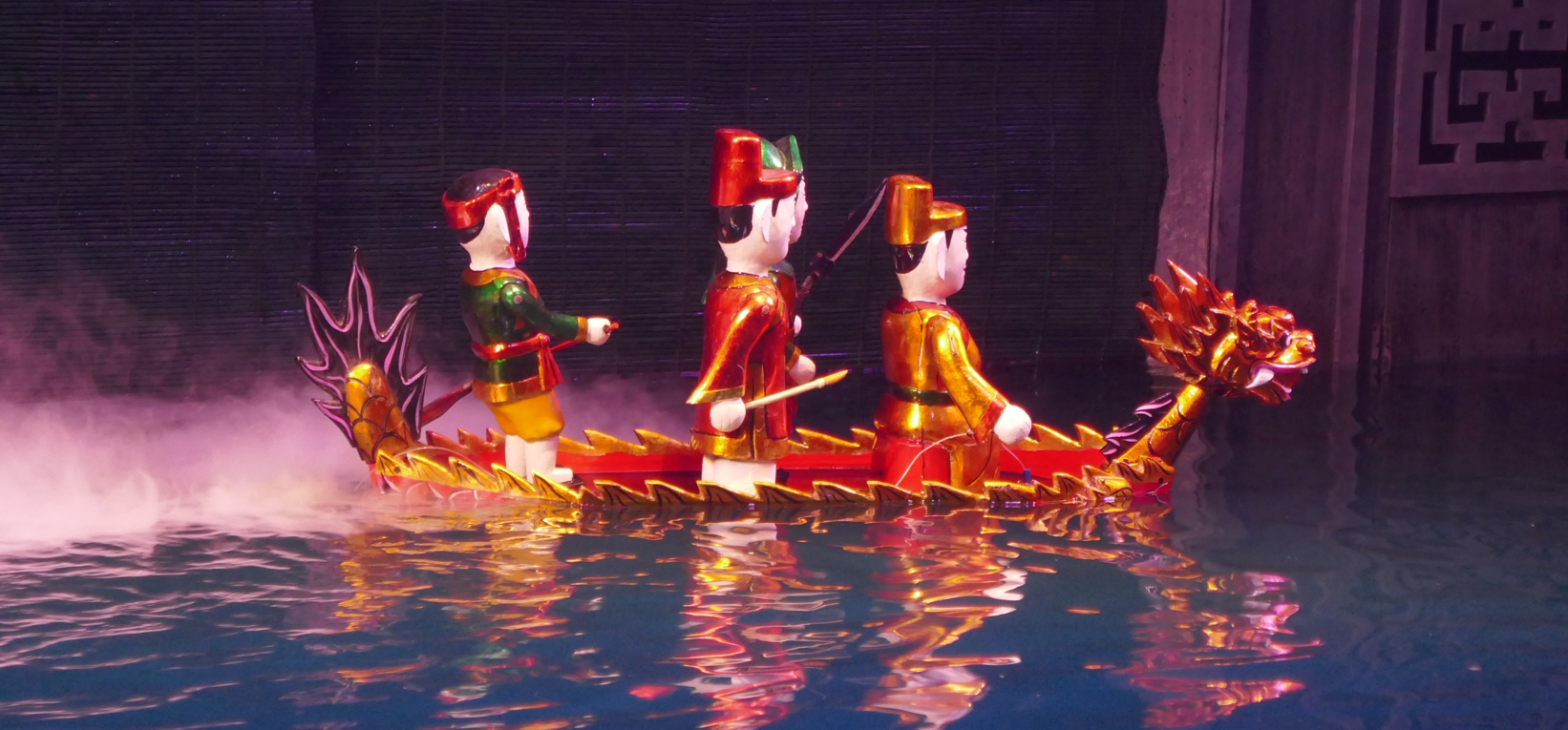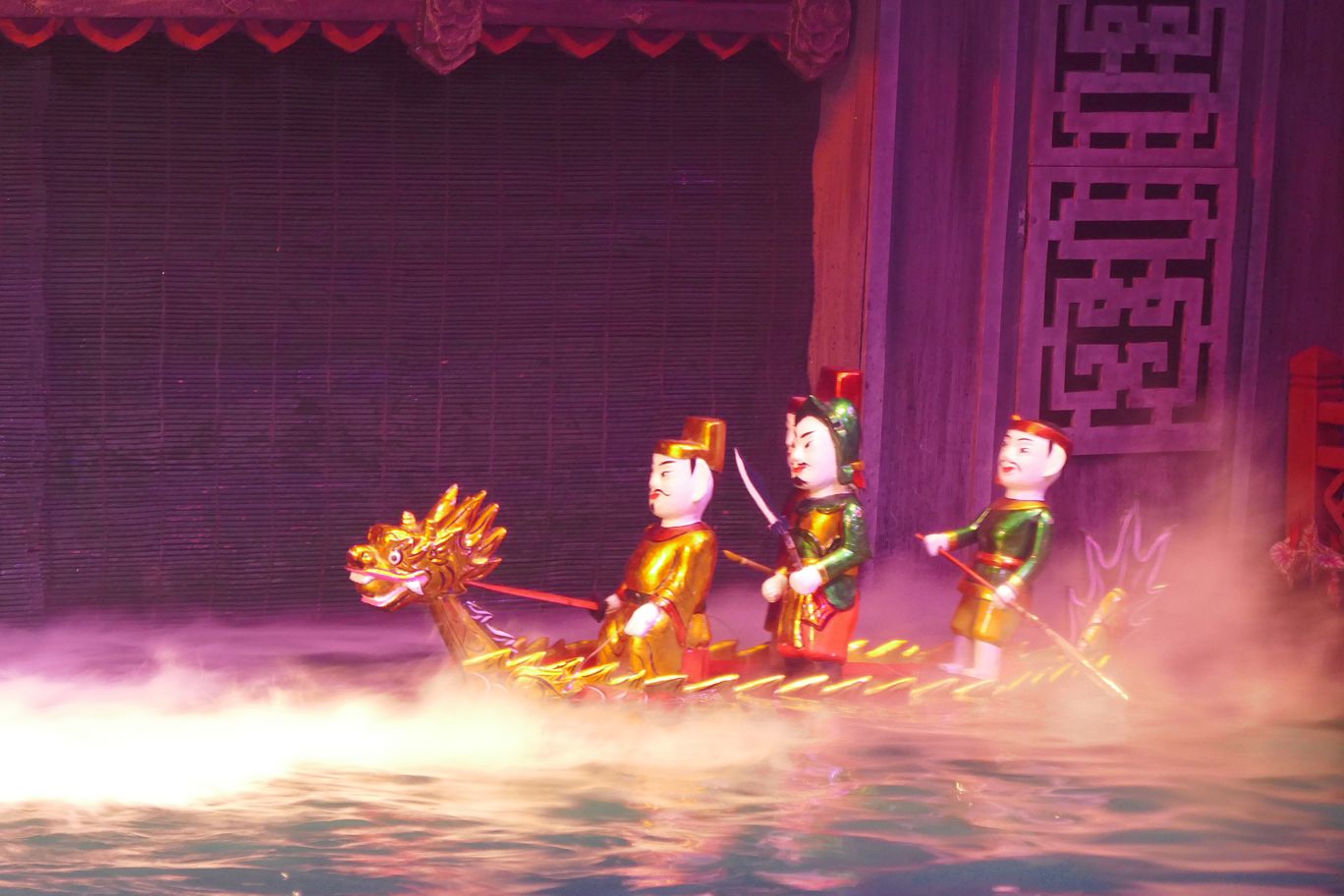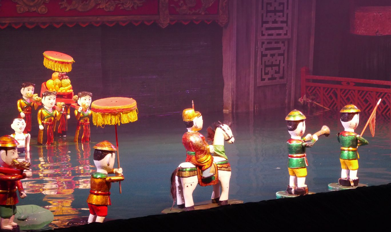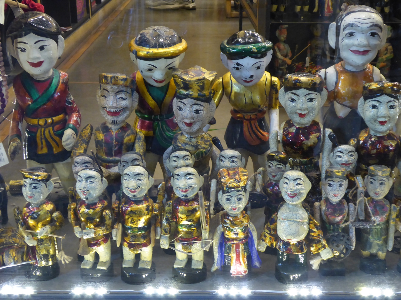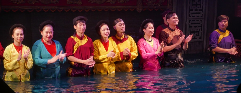 Ganz in der Nähe befindet sich das Wasserpuppentheater – so etwas gibt es nur in Vietnam, eine besondere Attraktion. Wir hatten schon am Anleger der Halong Bucht einen kleinen Eindruck davon bekommen. Die Musik am Vormittag bei unserem „Vorgeschmack“ war für unsere Ohren ein höllischer Lärm, in Höhenlagen, die unsere Ohren sonst nie zu hören bekommen, dazu ein paar Figuren, die im Wasser Kapriolen drehen und ein bisschen spritzen.