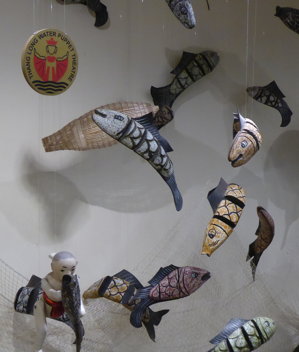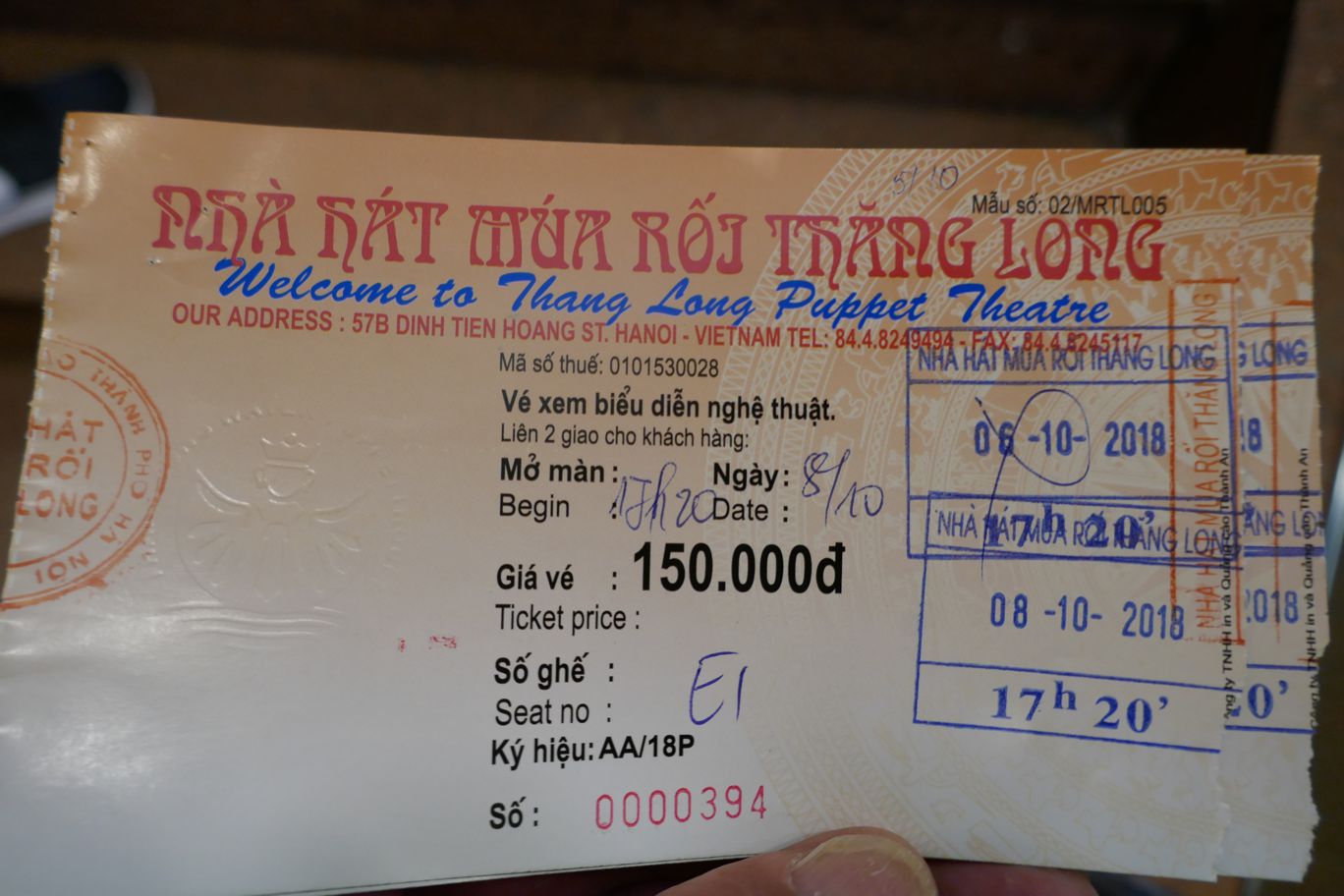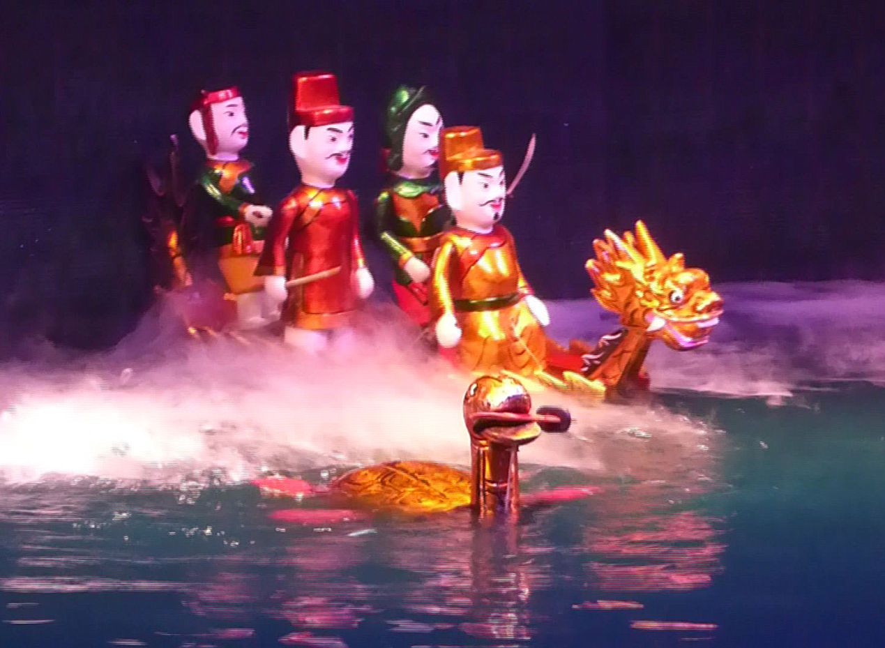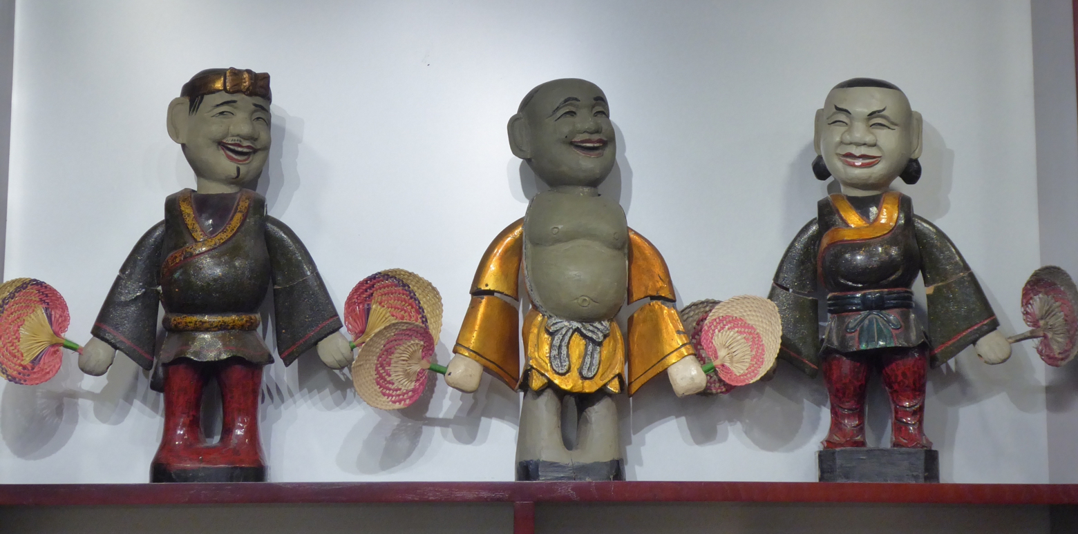 Ganz in der Nähe befindet sich das Wasserpuppentheater – so etwas gibt es nur in Vietnam, eine besondere Attraktion. Wir hatten schon am Anleger der Halong Bucht einen kleinen Eindruck davon bekommen. Die Musik am Vormittag bei unserem „Vorgeschmack“ war für unsere Ohren ein höllischer Lärm, in Höhenlagen, die unsere Ohren sonst nie zu hören bekommen, dazu ein paar Figuren, die im Wasser Kapriolen drehen und ein bisschen spritzen.
