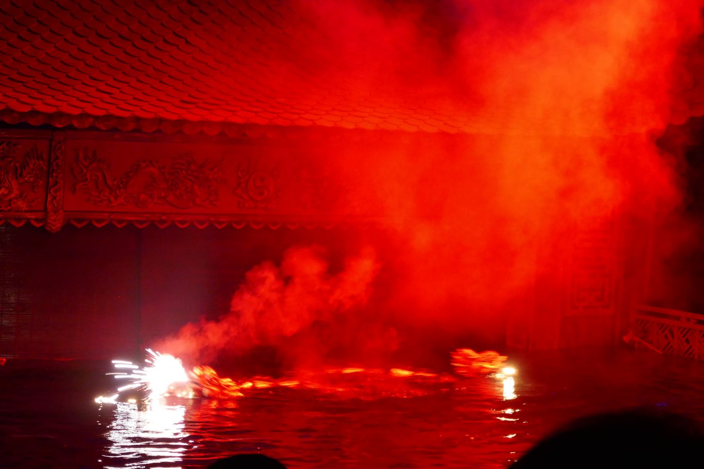 Zu Beginn der Auftritt der ersten Puppe, es war wohl der Ansager. Auf dem Wasser wird gespielt, oben vom Orchester kommen der Text und die passende Musik. Dann der Auftritt der Drachen. Sie schlängeln sich durch das Wasser, speien Fontänen und gebärden sich ziemlich wild. Richtig in Rage geraten spuckten sie Feuer und nebelten die ganze Bühne ein, ein richtiges kleines Spektakel.
