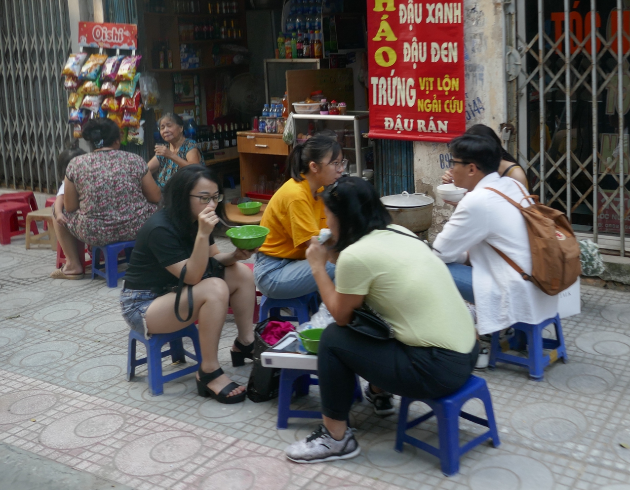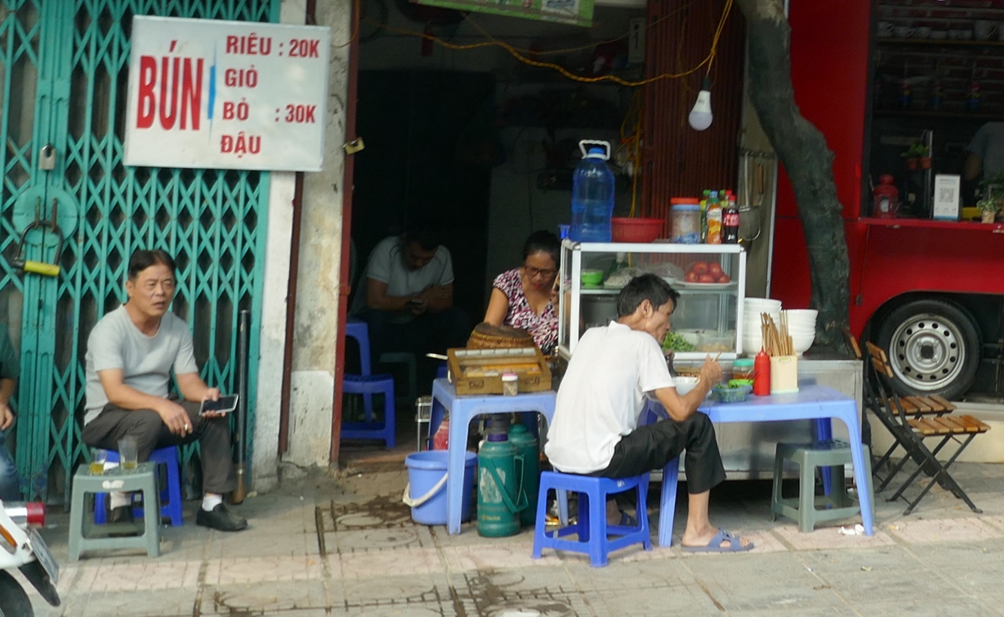 Nach dem Frühstück fahren wir vom Hotel an der Halong Bucht auf der nicht sonderlich langen, aber zeitaufwendigen Strecke zurück zur Hauptstadt. Bereits früh am Morgen sind die Straßenküchen am Straßenrand schon geöffnet; Kinder und Jugendliche oder Arbeiter sind hier zu sehen, die ihre Frühstückssuppe essen. Auch die ersten Verkäufer sind schon unterwegs, die kleinen Märkte beginnen langsam, sich zu regen.