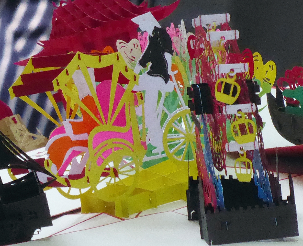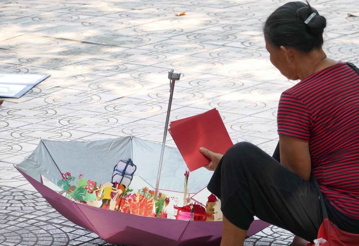 Rund um den See werden Souvenirs verkauft, vor allem sehr filigran gestaltete Klapp-Postkarten mit allerhand Motiven – Schiffe, Drachen, Häuser, Pagoden, Rikschas, oder auch touristische Attraktionen. Die rote Brücke scheint ein beliebter Hintergrund für besondere Erinnerungsfotos zu sein; wir sehen gleich mehrere Hochzeitspaare.
