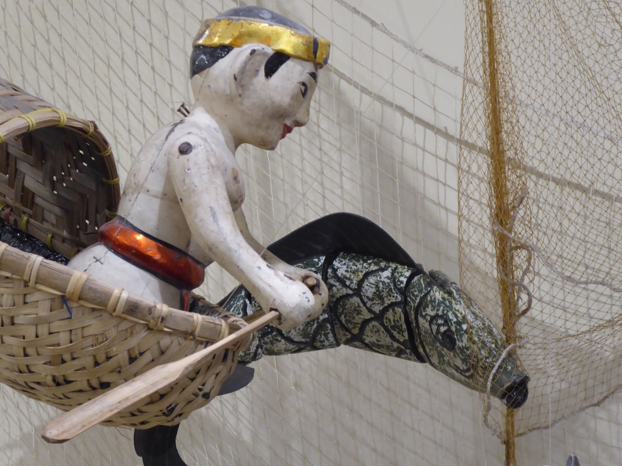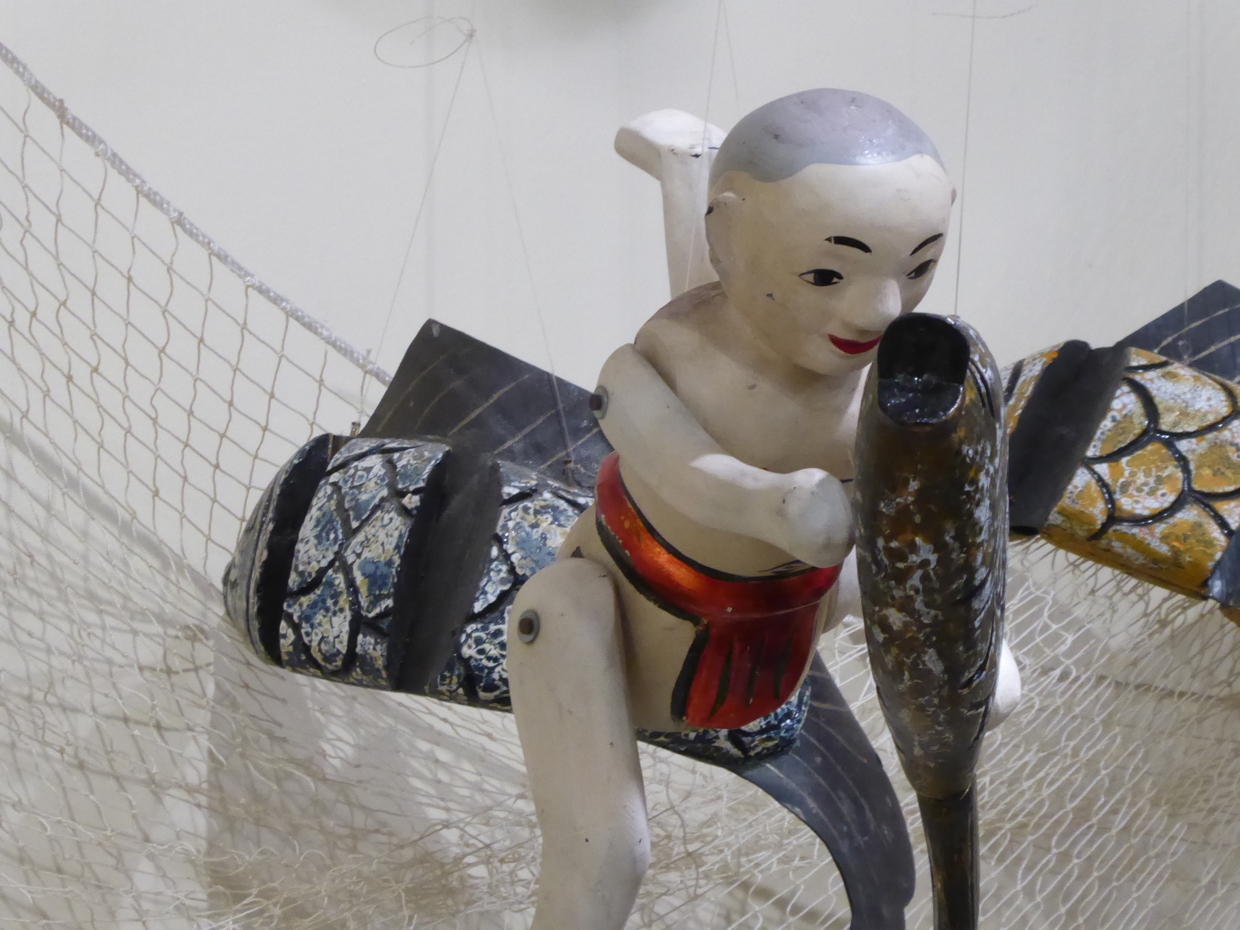 Nun war das bestellen der Felder mit Reis an der Reihe. Vom Setzlinge ausbringen bis zur Reisernte wurden alle wichtigen Stationen des Reisanbaus vorgeführt. Die nächste Szene war besonders eindrücklich. Eine königliche Prozession bewegt sich ehrfürchtig im Tross durch das Wasser. Mit Untertanen, reich gekleideten Würdenträgern und sogar Pferden. Ganz zum Schluss dann der Tanz der Grazien. Ein Wasserballett für sechs Damen und zwei Vortänzerinnen. Erstaunlich, wie grazil und harmonisch sich die Figuren bewegten. Man konnte sich kaum vorstellen, dass jede Puppe ihren eigenen Spieler hatte, da es so gut synchron getanzt war.