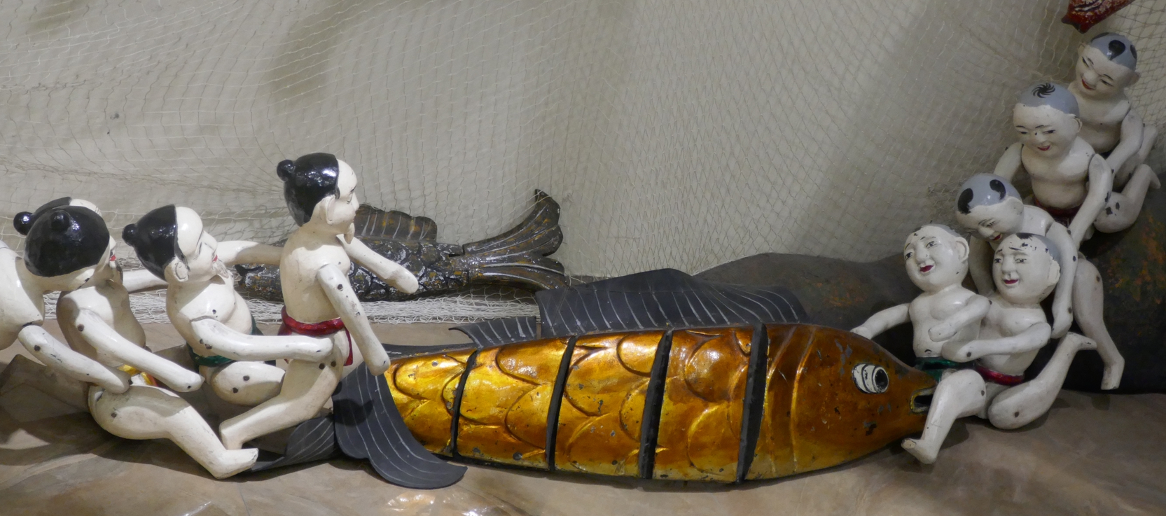 Danach kam eine ruhigere Szene. Spielende Kinder schwammen durch das Wasser und neckten sich. Die nächste Szene wieder quirliger. Ein Fischer und seine Frau versuchten Fische zu fangen. Ein auf und ab und hin und her, eine Jagd mit Angeln und Reusen, und immer waren die Fische geschickter. Dann gab es eine Episode vom Bauernhof. Eine Entenfamilie schwimmt friedlich auf dem Wasser, ein Fuchs will sich eine der Enten holen. Der Bauer bemerkt dies und versucht mit Hilfe seiner Frau den Fuchs zu erwischen. Nutzte aber alles nichts, der Fuchs entkam mit seiner Beute. – Erstaunlich, welch vielfältige und fast schon realistische Bewegungen mit den Stabpuppen möglich sind.