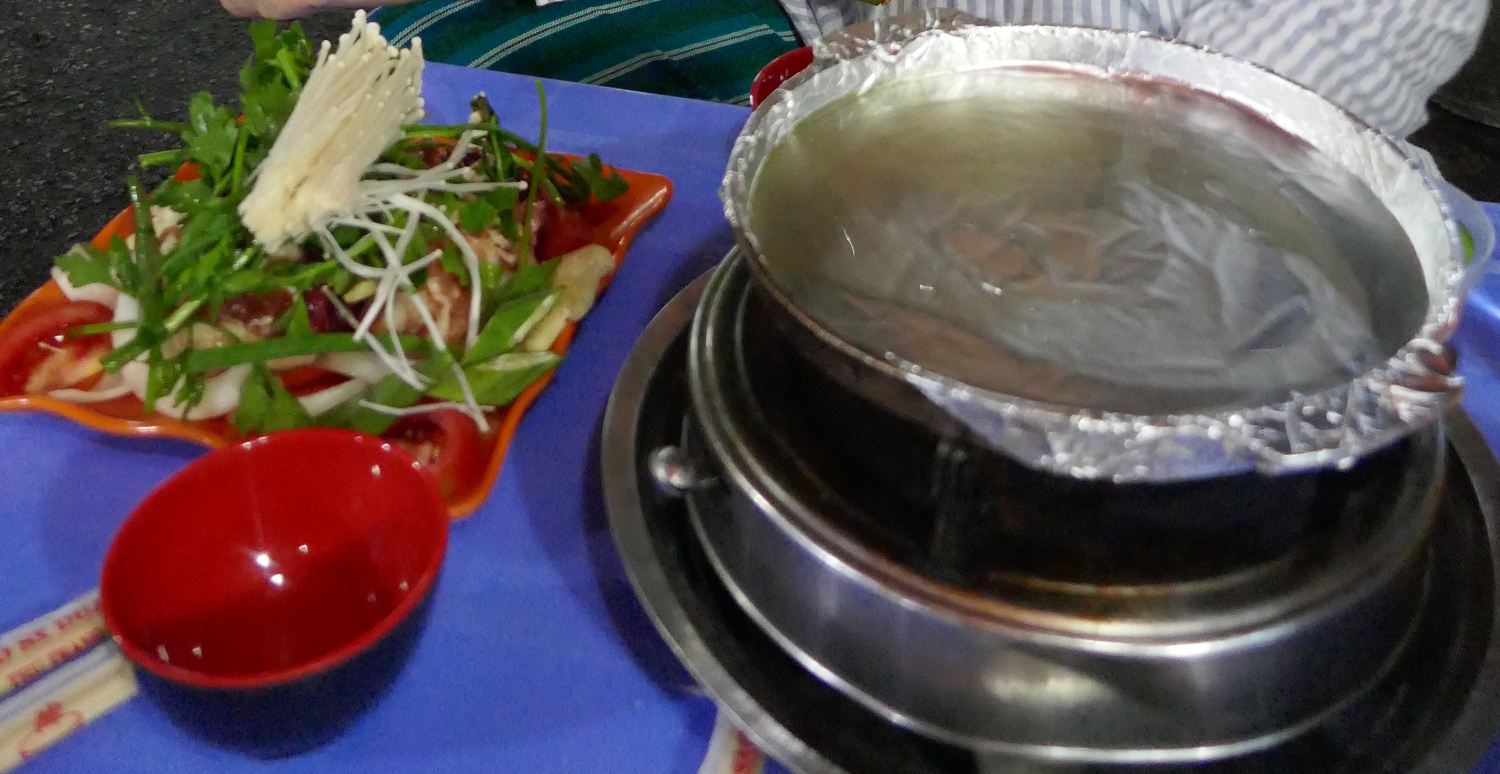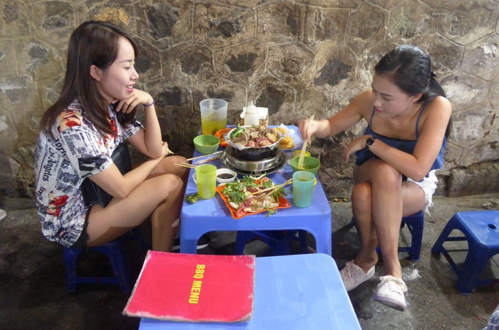 Es gibt eine Art „Do-it-yourself“-Küche – ein kleiner Kocher auf dem Tisch, die rohen Zutaten nach Karte bestellt, dazu bekommt man Pasten und Soßen, und dann wird selbst gebruzzelt. Wirklich lecker. Beim Füße umstapeln, weil ich doch sehr zusammengeklappt sitze, schlage ich noch so an den Tisch, dass Lydia eine volle Portion Öl über die Bluse bekommt. Mit den Mädchen nebenan entsteht während des Essens immer mal Lächel-Kontakt, dann irgendwann die Frage, wer woher kommt.