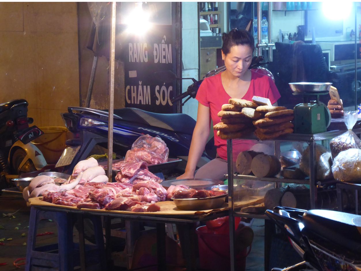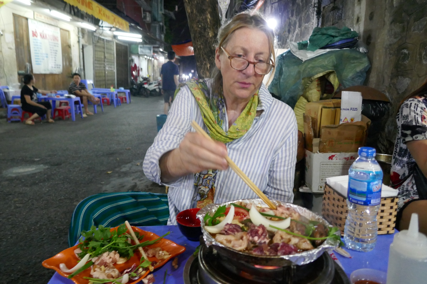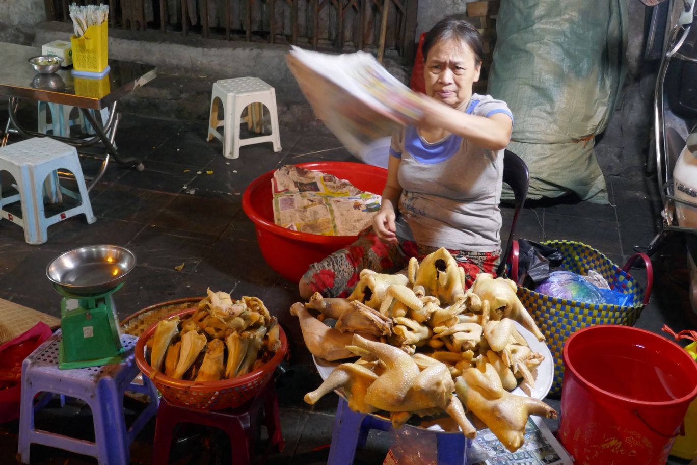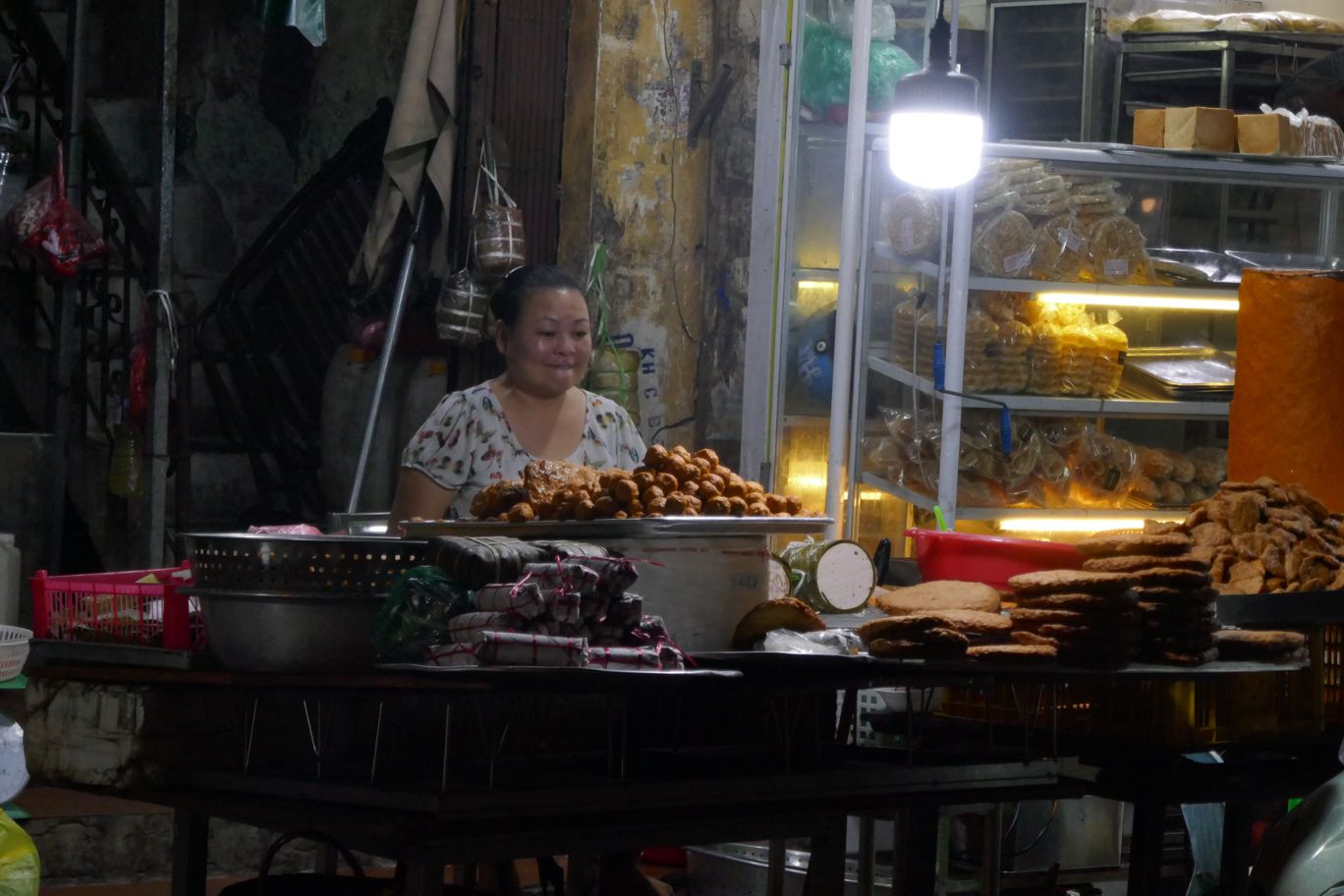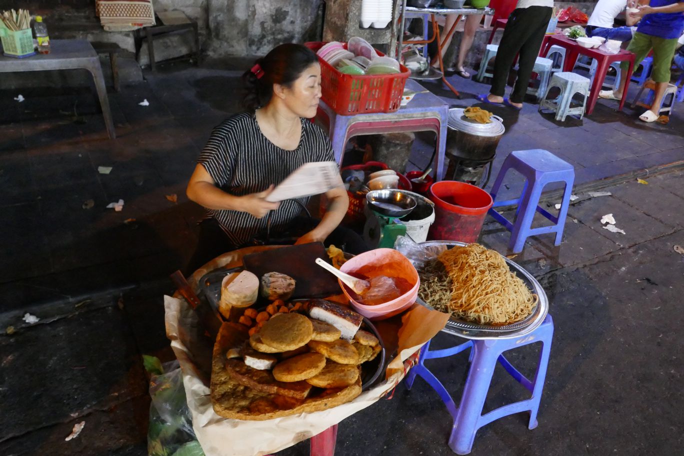 Wir wollen gerne auch noch zu Abend essen, aber nicht in irgend einem Hotel oder Restaurant, sondern an einem der vielen kleinen Stände entlang der Straßen, die manchmal kleine Plastikhocker, hoch wie bei uns ein kleiner Fußschemel, und -tische haben – irgendwann haben wir mitbekommen, dass das schon so ein kleiner Luxus sei, Anpassung an den Westen. Vietnamesen könnten stundenlang in tiefer Hocke sitzen und brauchen eigentlich keinen Stuhl. Wir sehen vor allem auf den Märkten einige, die das tun – und wundern uns, wie sie so tief hinunterkommen, dann still sitzen können, dabei weder umkippen noch schaukeln, sondern essen und arbeiten, und dann wieder ganz locker aufstehen, ohne sich irgendwo festzuhalten. Junge Leute, alte Leute. Vietnamesen gehen übrigens auch höchst ungern zu Fuß, erfahren wir – sind einige wenige Schritte zu tun, geht es auf’s Moped.
