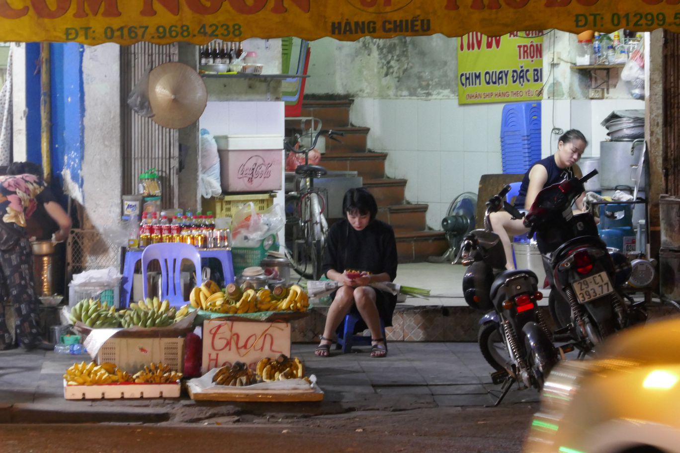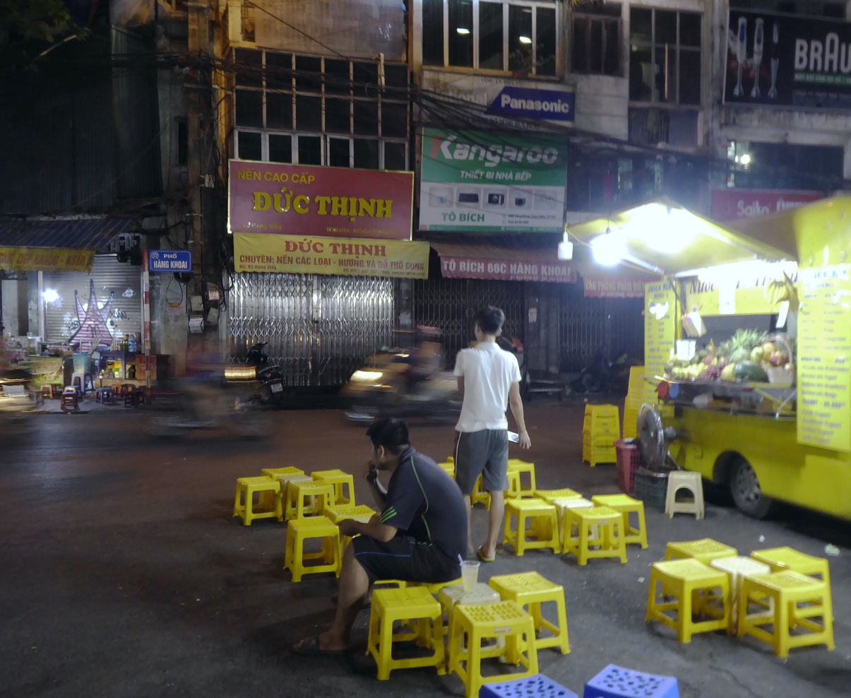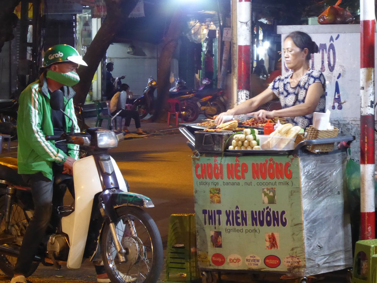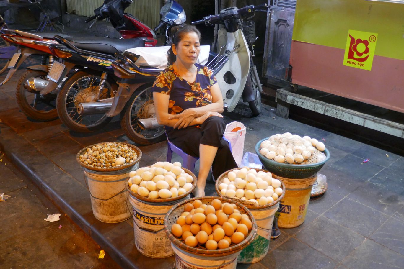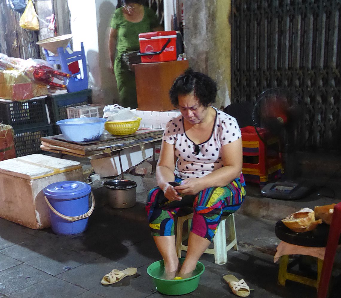Wir wollen gerne auch noch zu Abend essen, aber nicht in irgend einem Hotel oder Restaurant, sondern an einem der vielen kleinen Stände entlang der Straßen, die manchmal kleine Plastikhocker, hoch wie bei uns ein kleiner Fußschemel, und -tische haben – irgendwann haben wir mitbekommen, dass das schon so ein kleiner Luxus sei, Anpassung an den Westen. Vietnamesen könnten stundenlang in tiefer Hocke sitzen und brauchen eigentlich keinen Stuhl. Wir sehen vor allem auf den Märkten einige, die das tun – und wundern uns, wie sie so tief hinunterkommen, dann still sitzen können, dabei weder umkippen noch schaukeln, sondern essen und arbeiten, und dann wieder ganz locker aufstehen, ohne sich irgendwo festzuhalten. Junge Leute, alte Leute. Vietnamesen gehen übrigens auch höchst ungern zu Fuß, erfahren wir – sind einige wenige Schritte zu tun, geht es auf’s Moped.