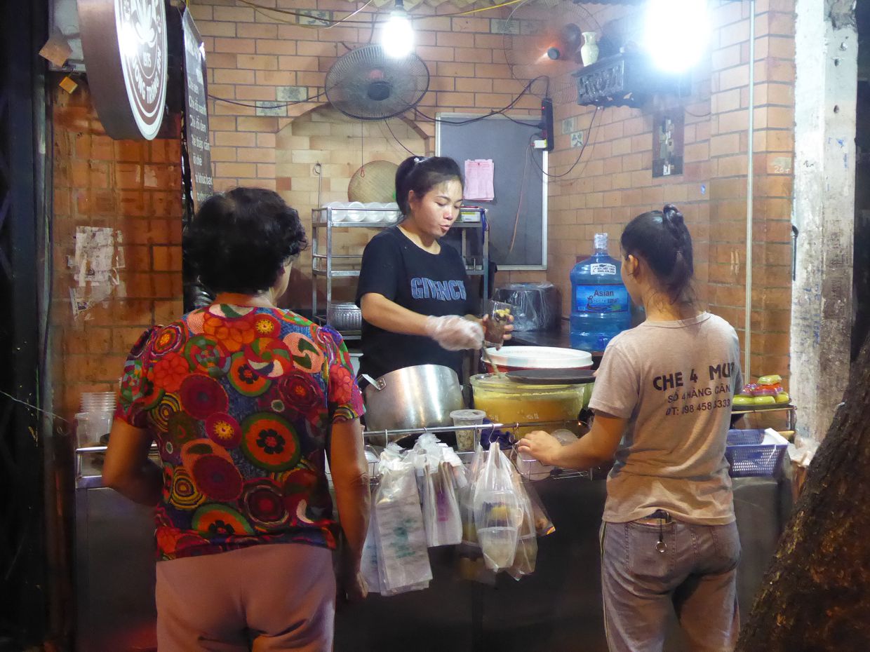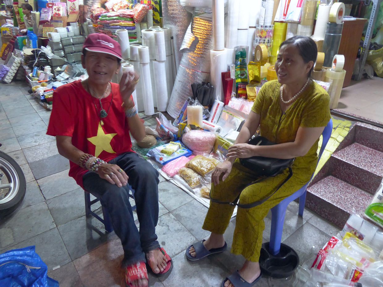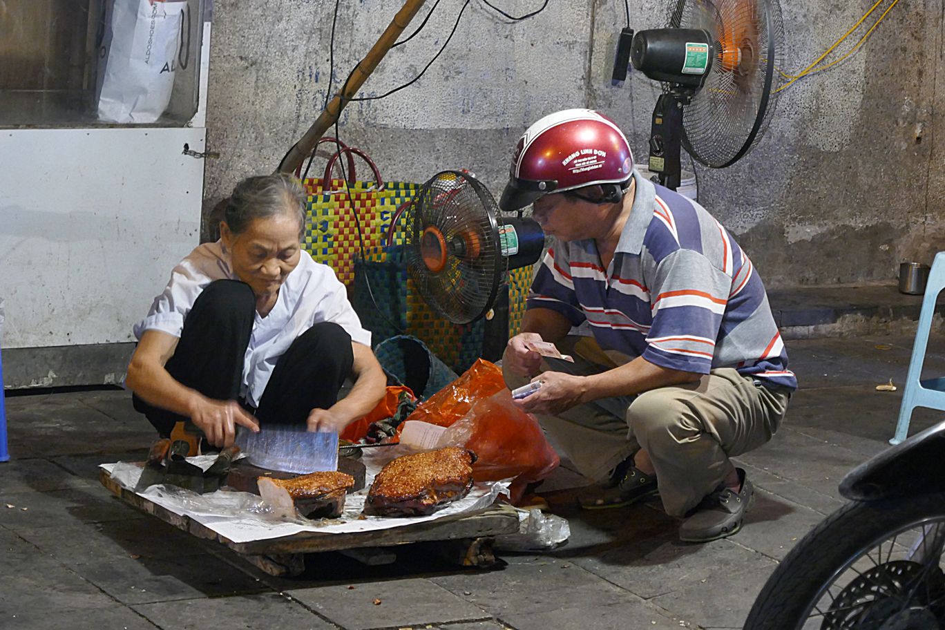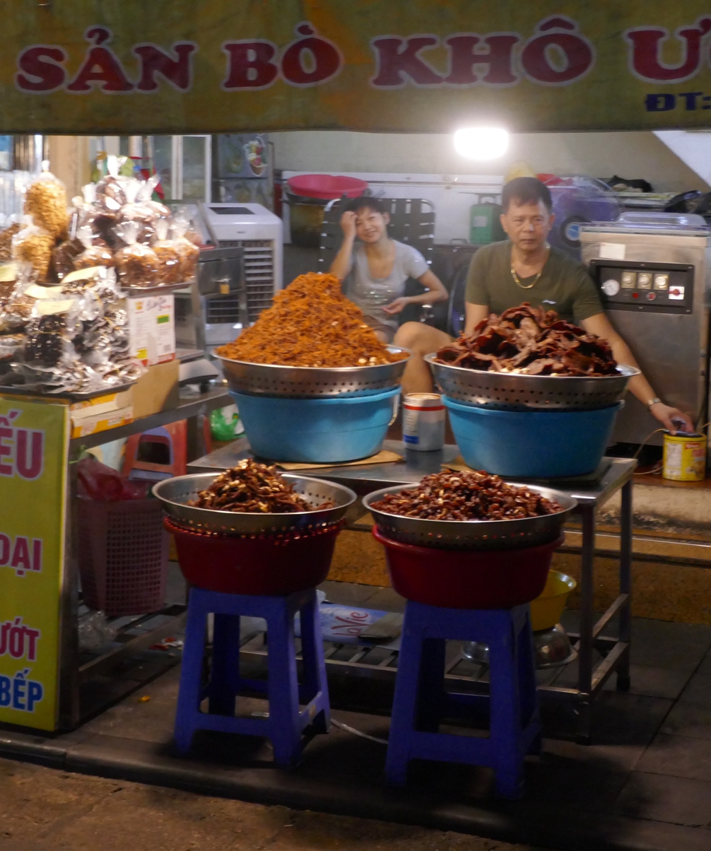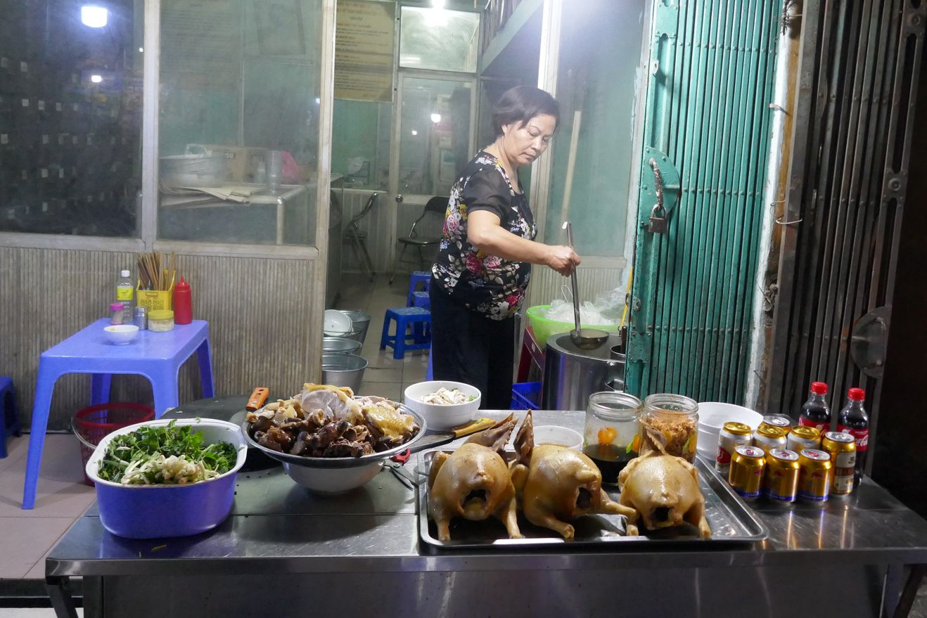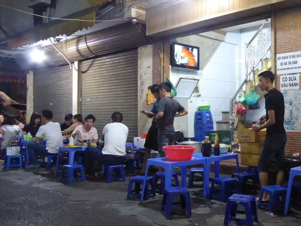 Wir wollen gerne auch noch zu Abend essen, aber nicht in irgend einem Hotel oder Restaurant, sondern an einem der vielen kleinen Stände entlang der Straßen, die manchmal kleine Plastikhocker, hoch wie bei uns ein kleiner Fußschemel, und -tische haben – irgendwann haben wir mitbekommen, dass das schon so ein kleiner Luxus sei, Anpassung an den Westen. Vietnamesen könnten stundenlang in tiefer Hocke sitzen und brauchen eigentlich keinen Stuhl. Wir sehen vor allem auf den Märkten einige, die das tun – und wundern uns, wie sie so tief hinunterkommen, dann still sitzen können, dabei weder umkippen noch schaukeln, sondern essen und arbeiten, und dann wieder ganz locker aufstehen, ohne sich irgendwo festzuhalten. Junge Leute, alte Leute. Vietnamesen gehen übrigens auch höchst ungern zu Fuß, erfahren wir – sind einige wenige Schritte zu tun, geht es auf’s Moped.