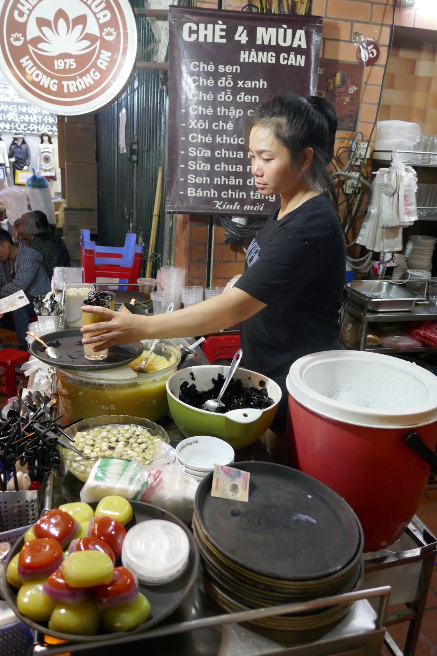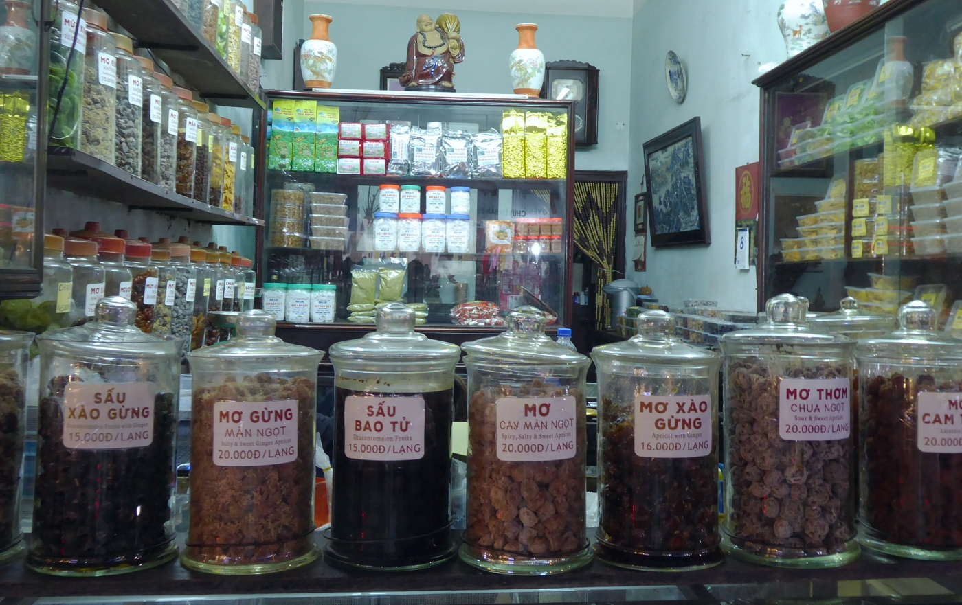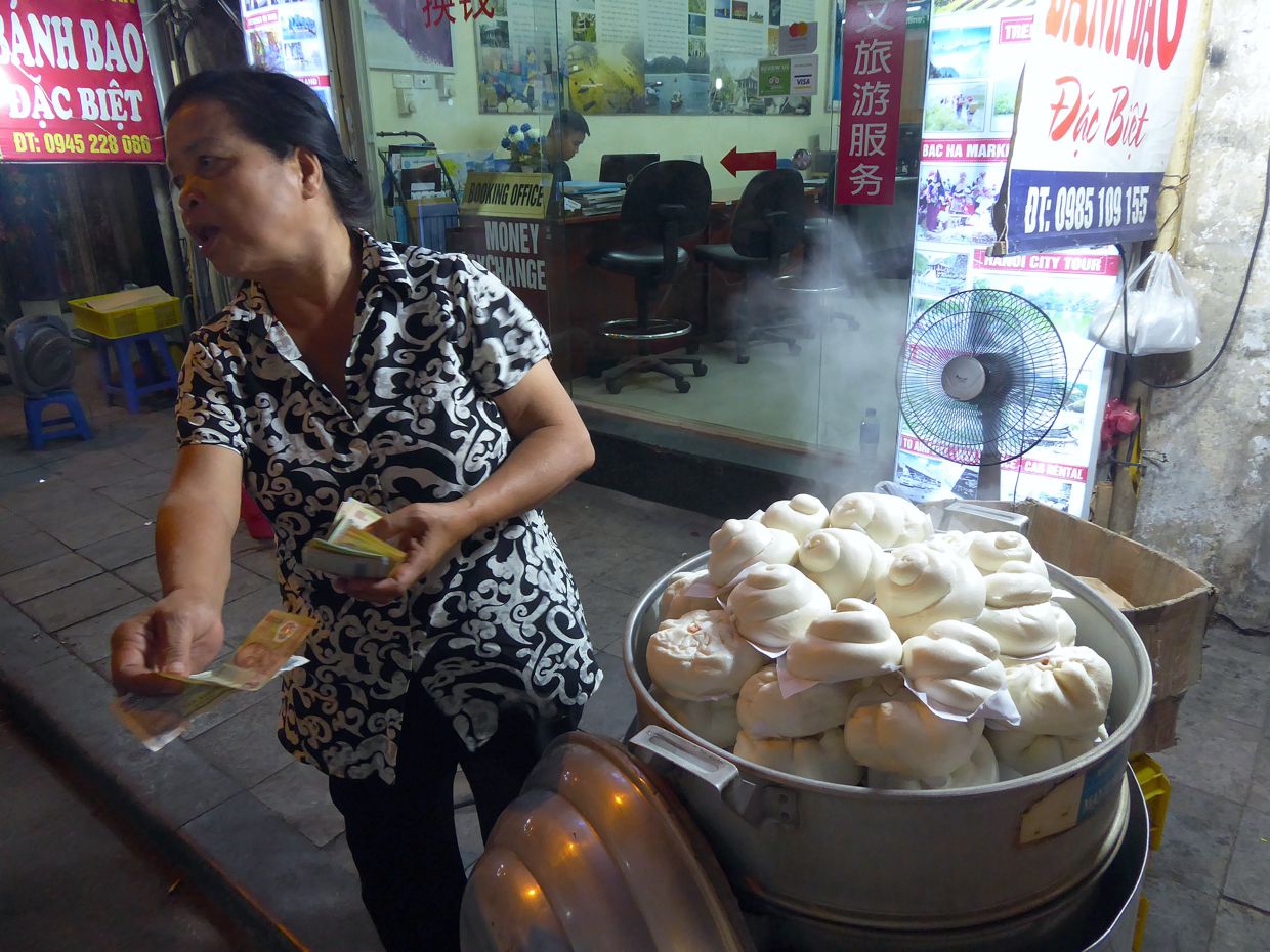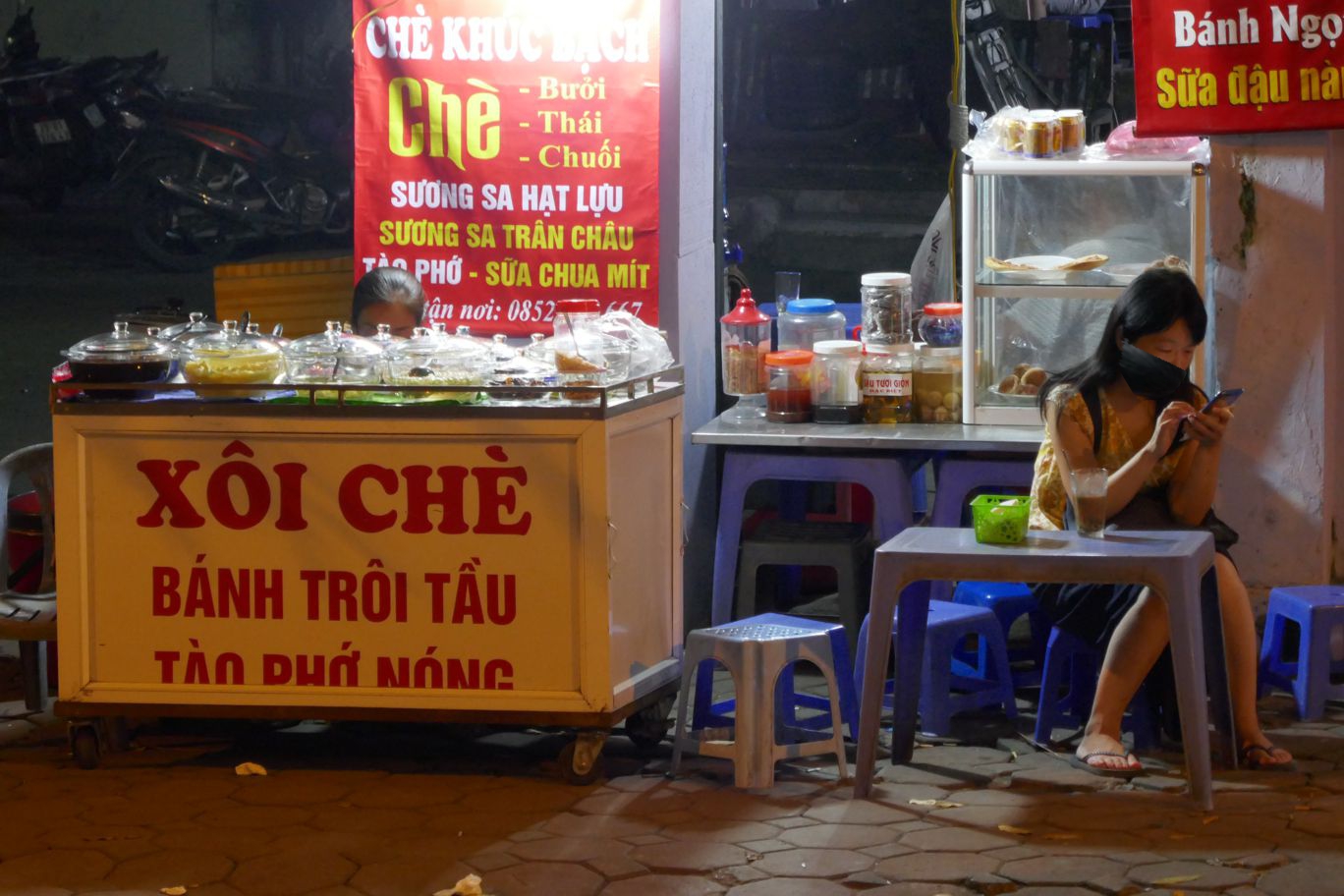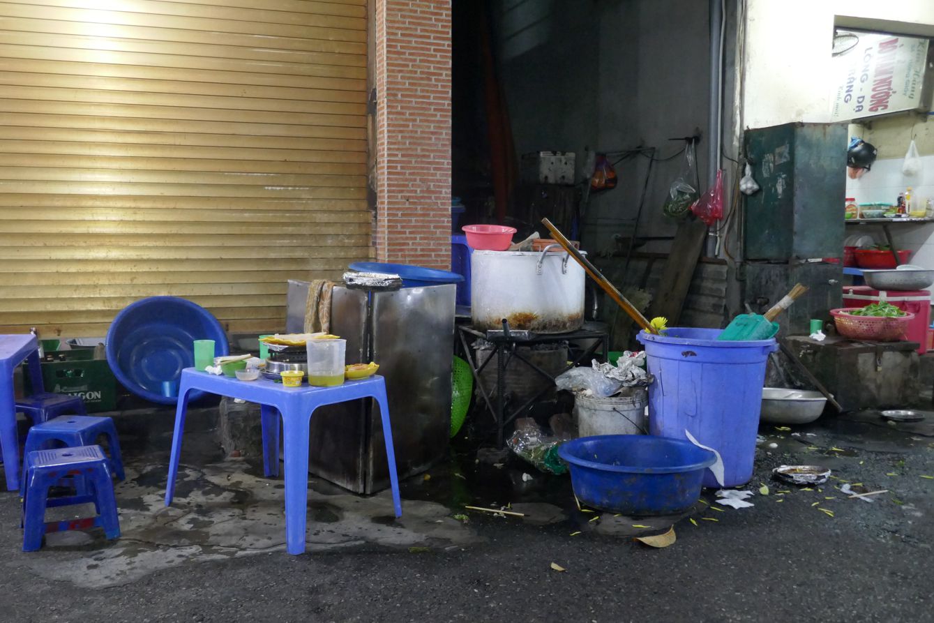 Wir wollen gerne auch noch zu Abend essen, aber nicht in irgend einem Hotel oder Restaurant, sondern an einem der vielen kleinen Stände entlang der Straßen, die manchmal kleine Plastikhocker, hoch wie bei uns ein kleiner Fußschemel, und -tische haben – irgendwann haben wir mitbekommen, dass das schon so ein kleiner Luxus sei, Anpassung an den Westen. Vietnamesen könnten stundenlang in tiefer Hocke sitzen und brauchen eigentlich keinen Stuhl. Wir sehen vor allem auf den Märkten einige, die das tun – und wundern uns, wie sie so tief hinunterkommen, dann still sitzen können, dabei weder umkippen noch schaukeln, sondern essen und arbeiten, und dann wieder ganz locker aufstehen, ohne sich irgendwo festzuhalten. Junge Leute, alte Leute. Vietnamesen gehen übrigens auch höchst ungern zu Fuß, erfahren wir – sind einige wenige Schritte zu tun, geht es auf’s Moped.